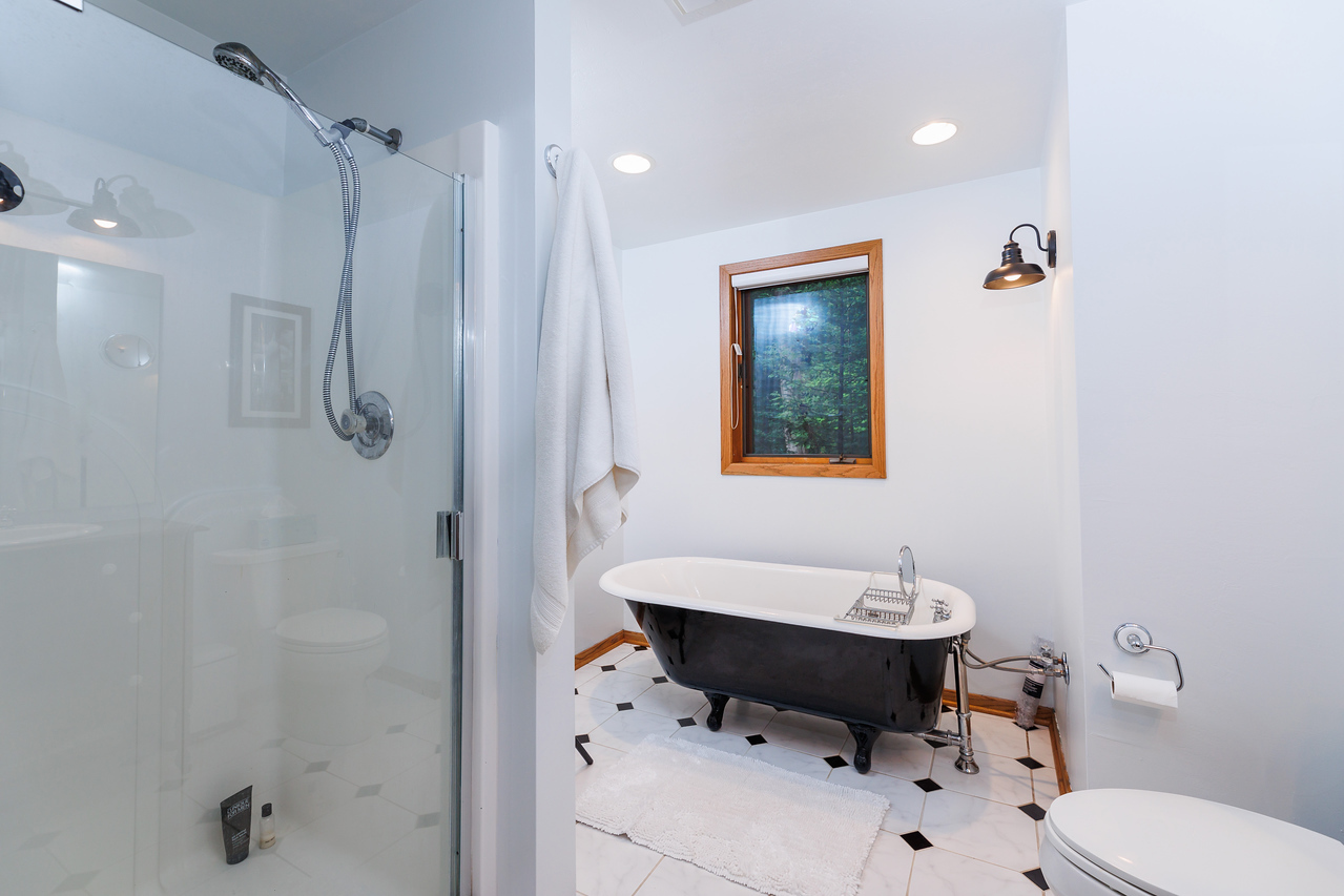 Bathroom 2: (first floor): Full bathroom with walk-in shower, soaking tub, toilet, sink and hair dryer, connected to Bedroom #1