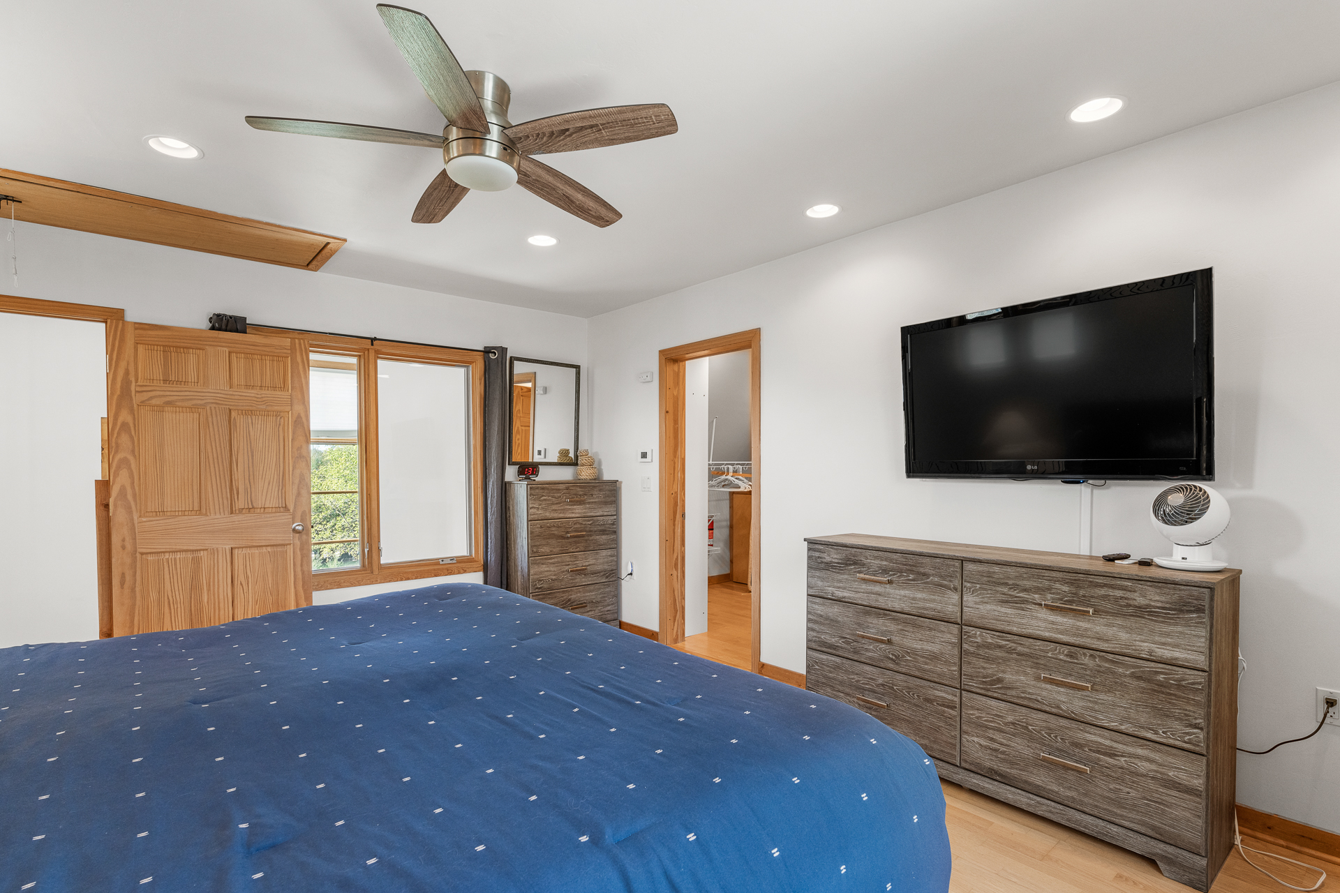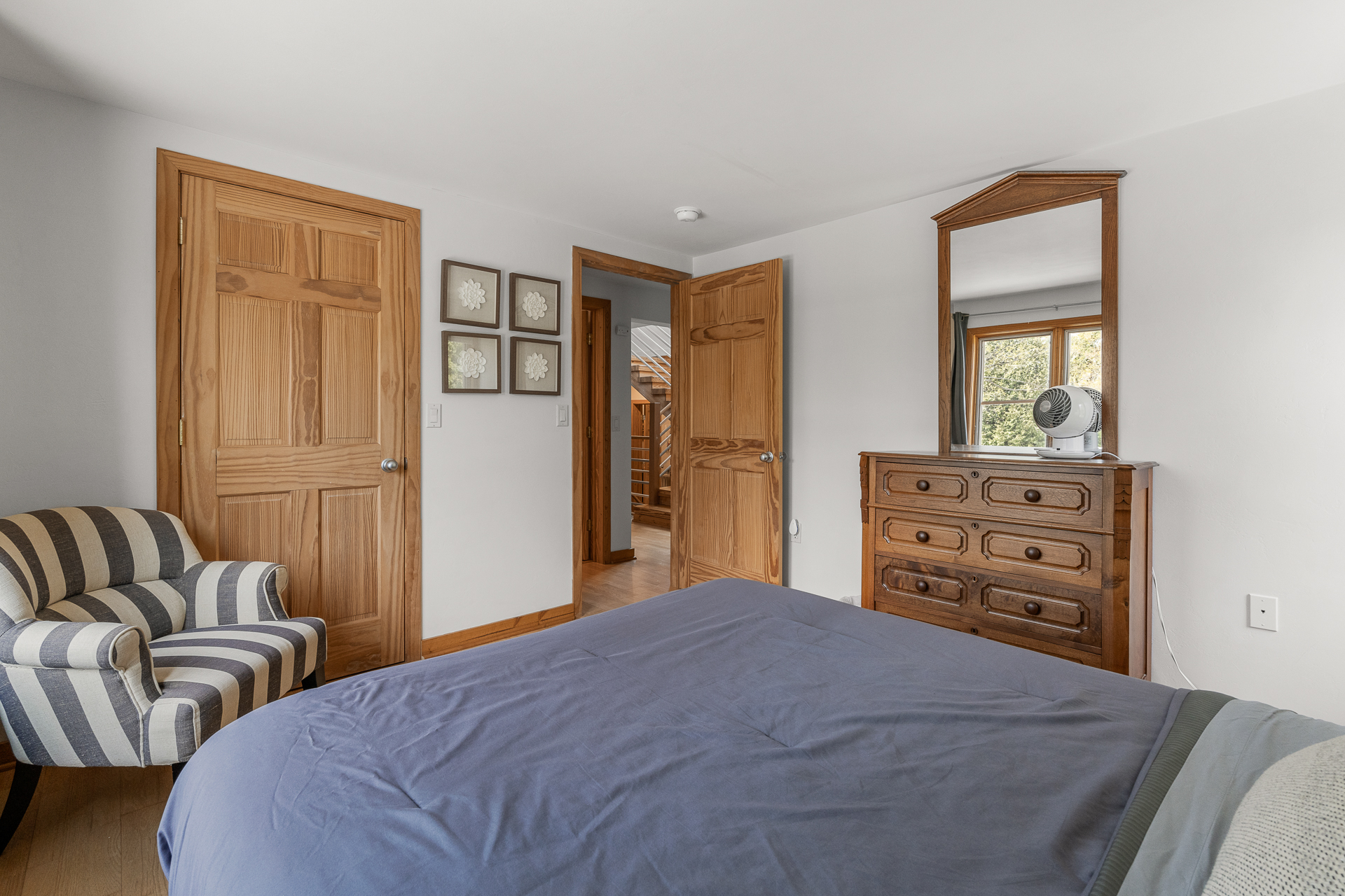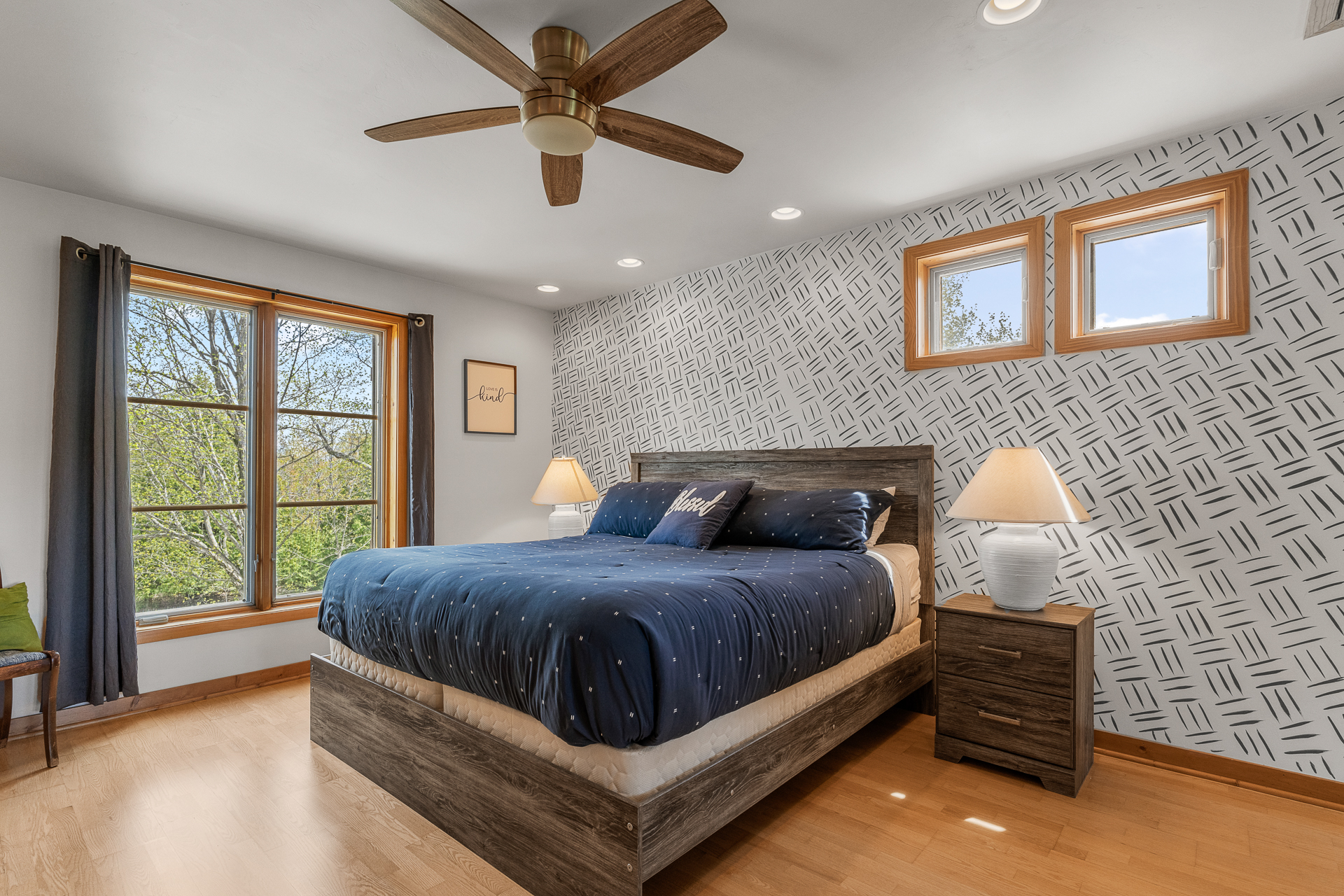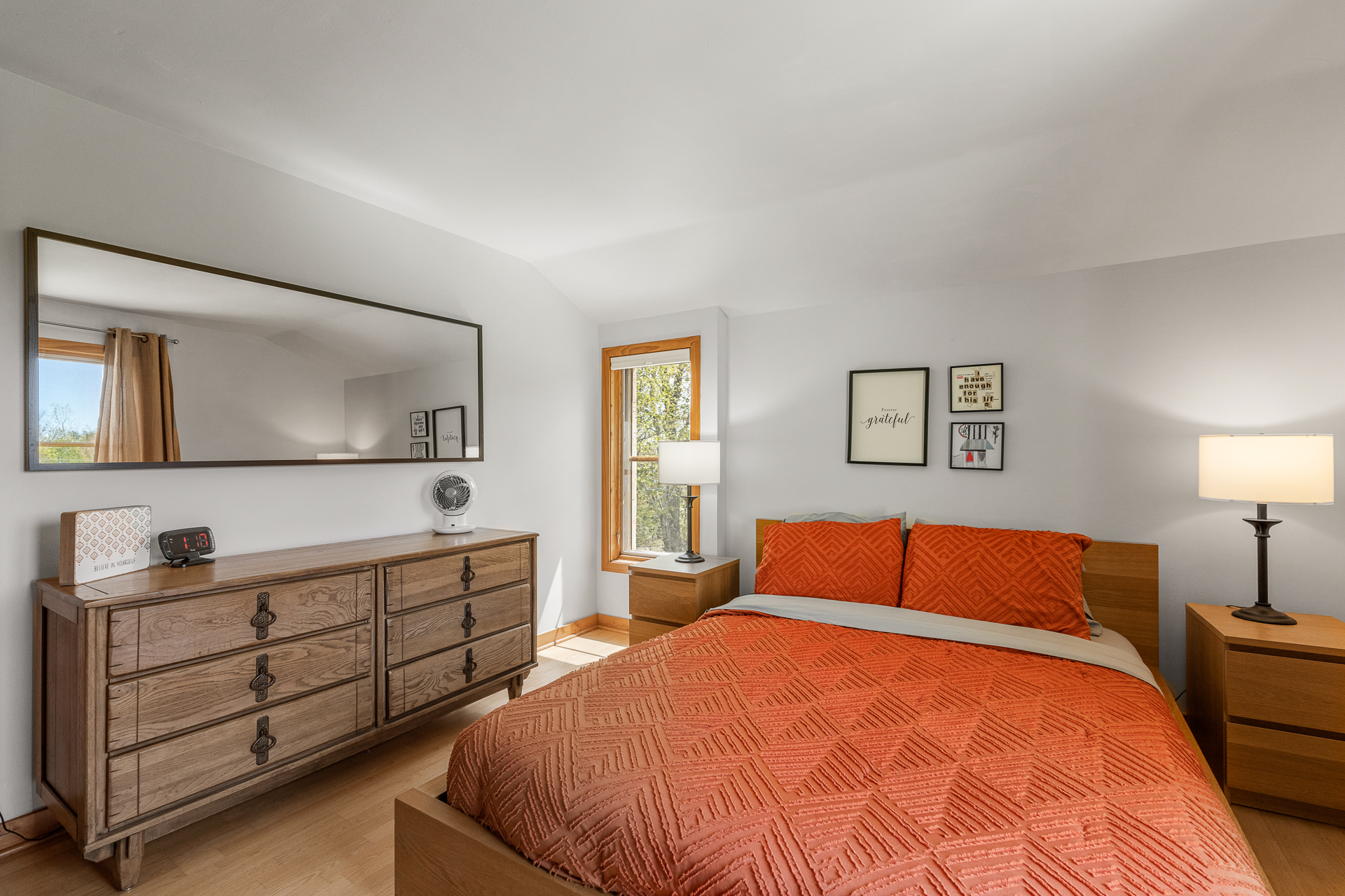 Bedroom 1: (Second level): Queen bed, Oscillating fan