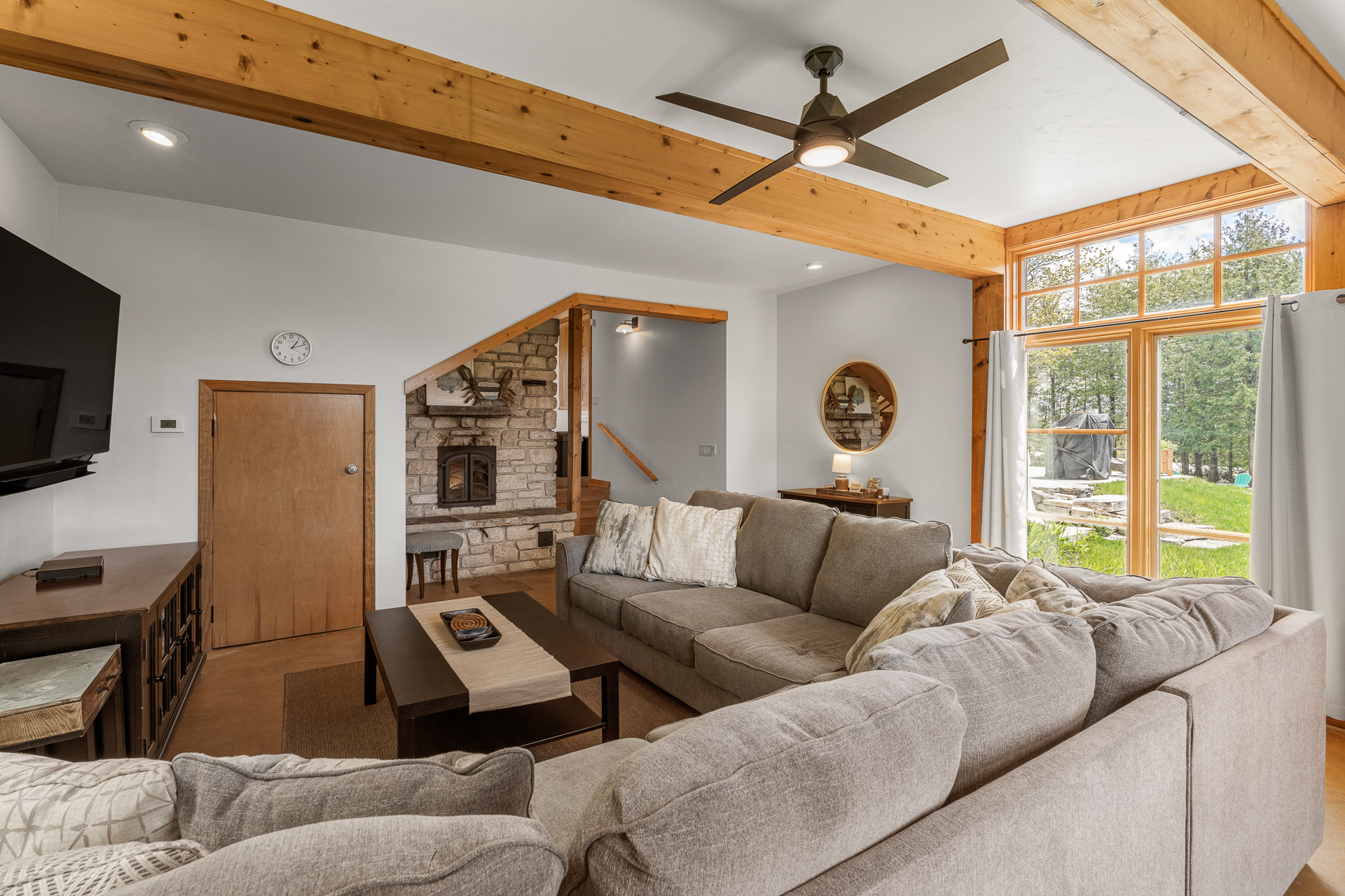 Ideal for multiple families, the second level has North and South 2 bedroom, 1 bathroom suites. The third level has the fifth bedroom and another bathroom for a more private sleeping level with views of the property and beyond. A carpeted bonus room, located off the stairwell, is ideal for kids to play in and watch TV while the adults socialize downstairs. Enjoy the large grassy backyard playing yard games and sitting around the bonfire pit. This home has everything you're looking for!