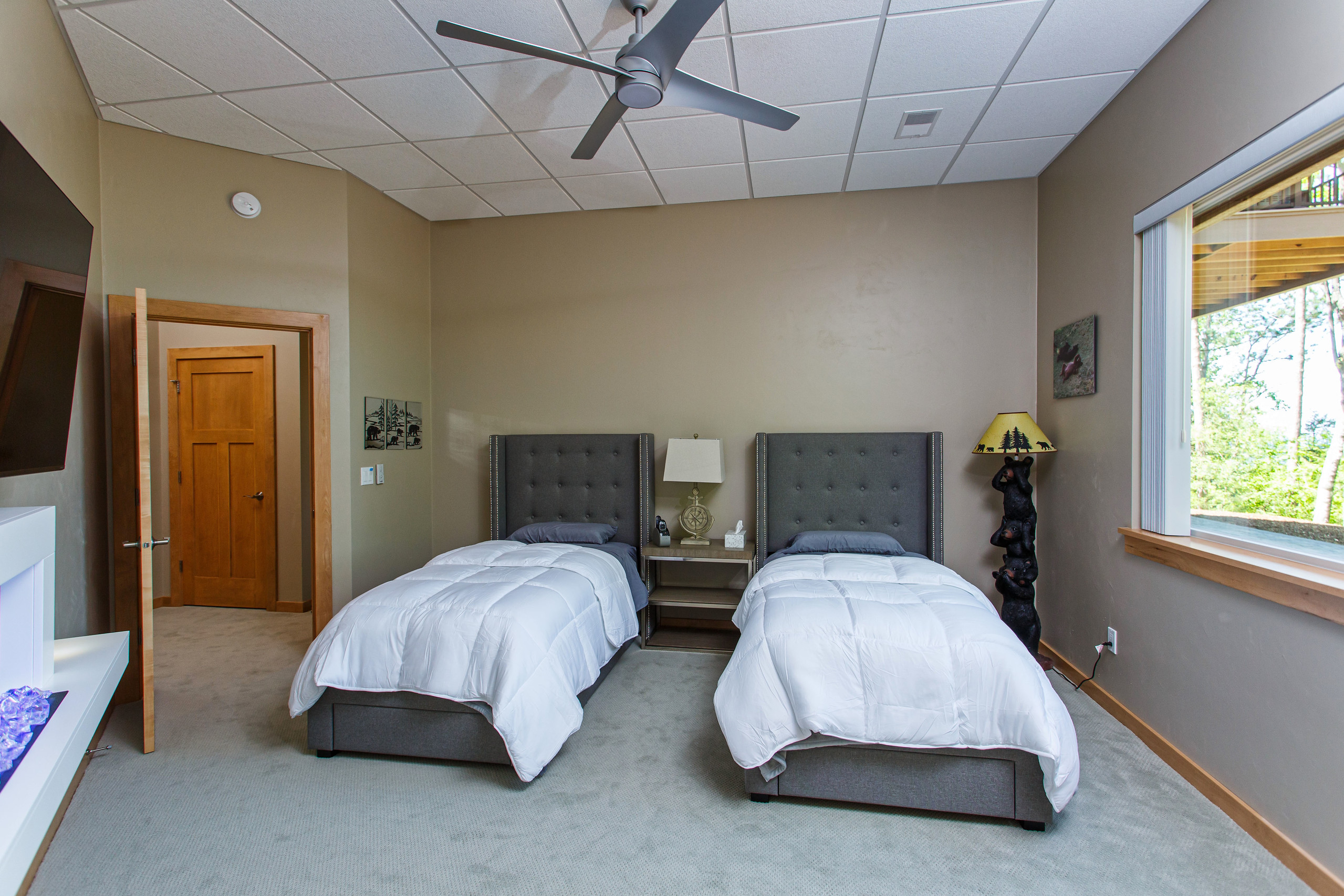 Welcome to Baydream Believer, hosted by Simple Life Rentals! This stunning luxury home includes 3 bedrooms with 3 full bathrooms over two levels. Main level has a great room, cook's kitchen, master bedroom with en suite, and a 2nd bedroom with a bathroom. Lower level includes a bar/ kitchenette, a living/ game area, golf simulator room (clubs provided), and a 3rd bedroom with bathroom. You will find fireplaces in the great room, all bedrooms, and in the lower level. This bluff-side lot is walkable, and the outdoor space is stunning, regardless of the season! Guests have access to the garage, which includes a Tesla charger if needed!