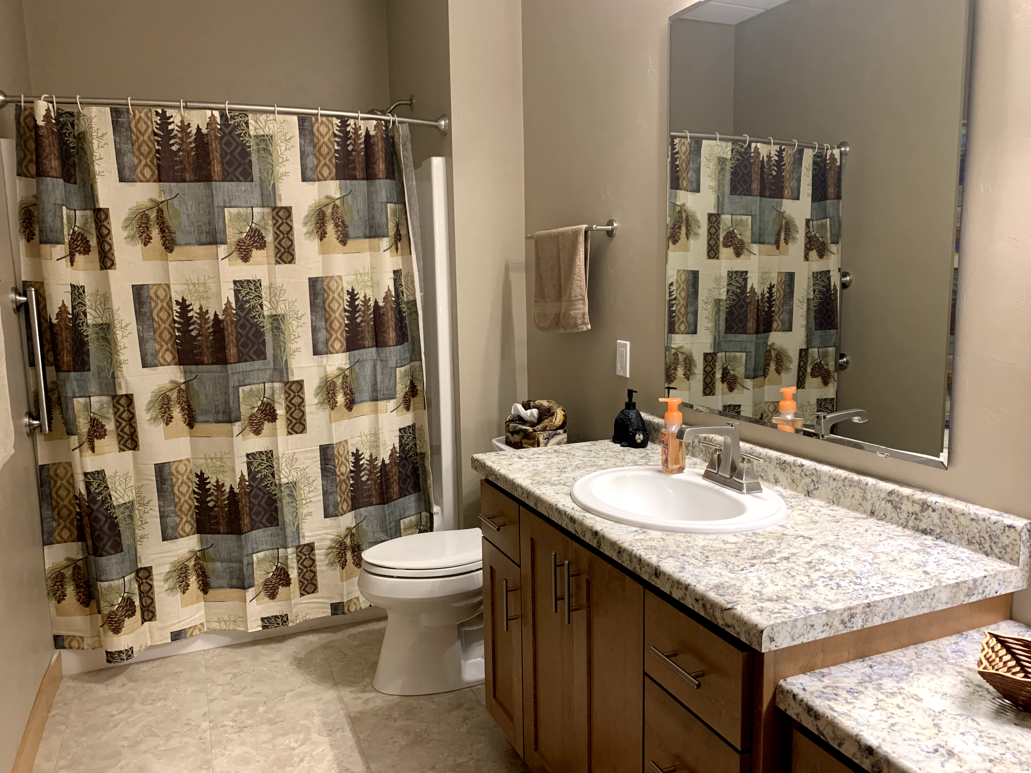 Bathroom 3 (lower level): Full bathroom with tub shower combo, hair dryer