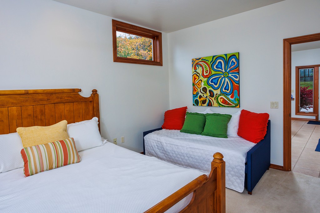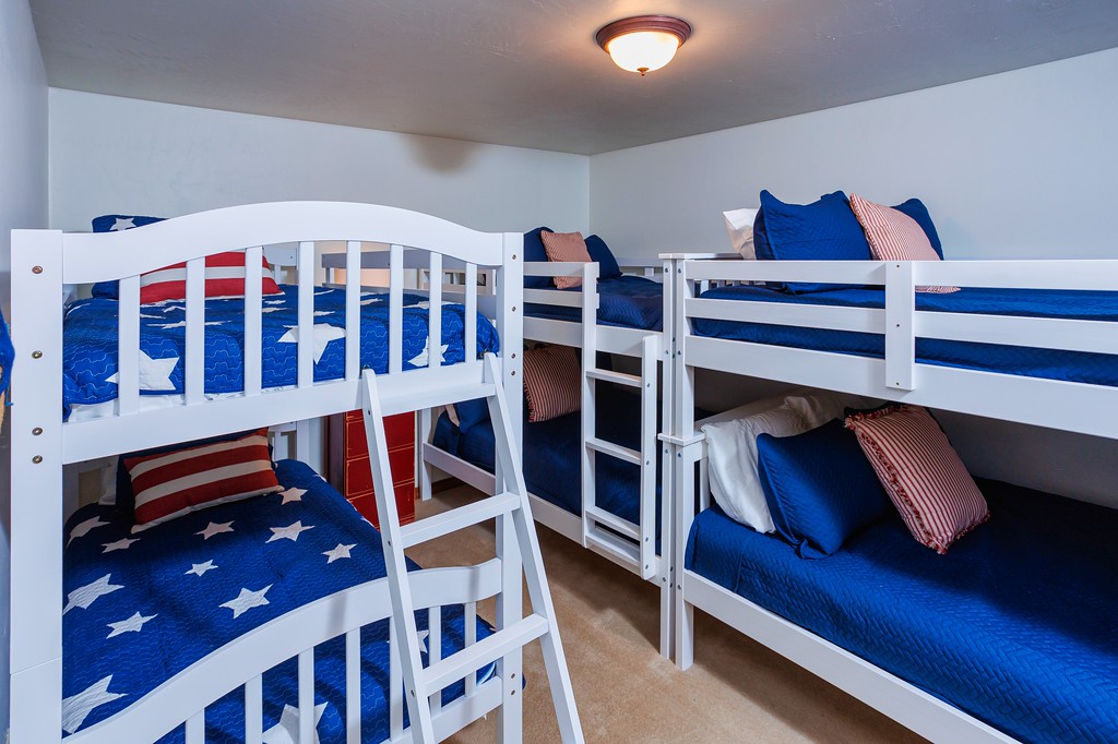 Bedroom 3 "the Bunk Room" (lower level): includes two sets of full-size bunk beds and one twin-size bunk bed, hangers, extra pillows and blankets and room darkening shades
