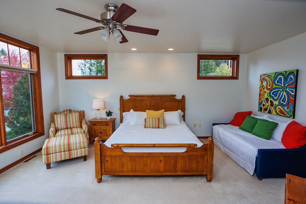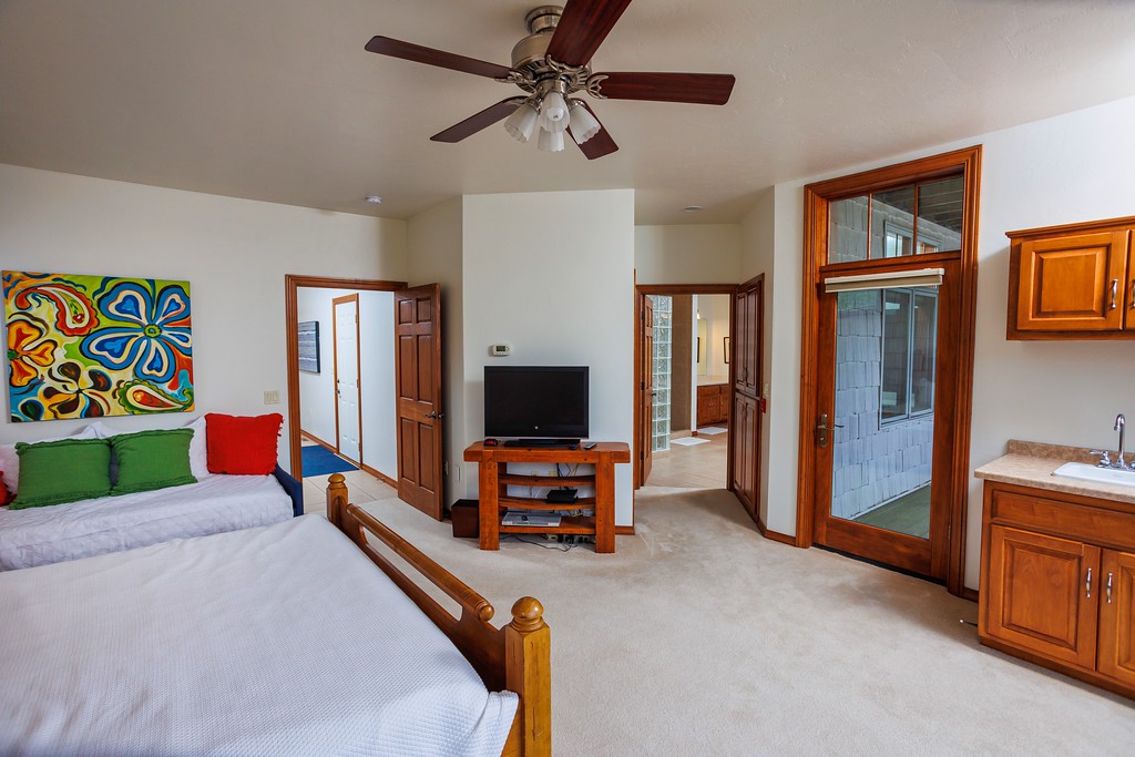 Bedroom 1 (main level): includes King bed, Twin daybed with a twin trundle bed, Smart TV (Roku), en suite bathroom, private outdoor balcony, mini-fridge, wet bar, multiple sitting areas, ceiling fan, hangers, extra pillows and blankets and room darkening shades