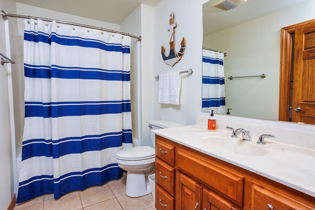 Bathroom 2 (lower level): Full bathroom with shower tub combo, hair dryer