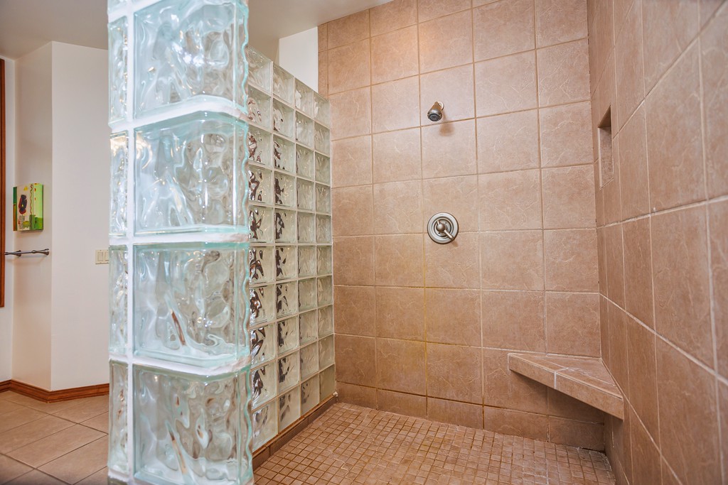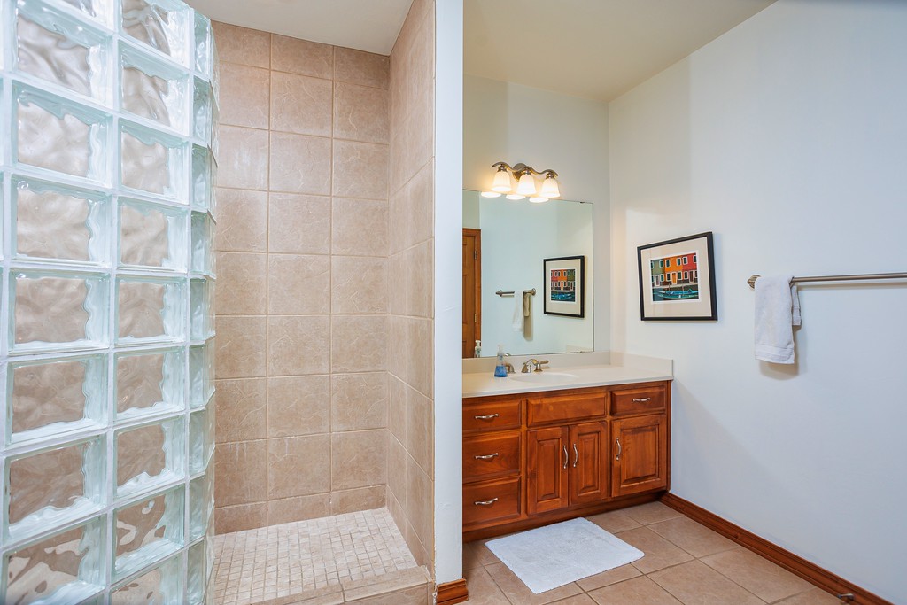 Bathroom 1 (main level): Full bathroom with walk-in shower and hair dryer, en suite to primary bedroom