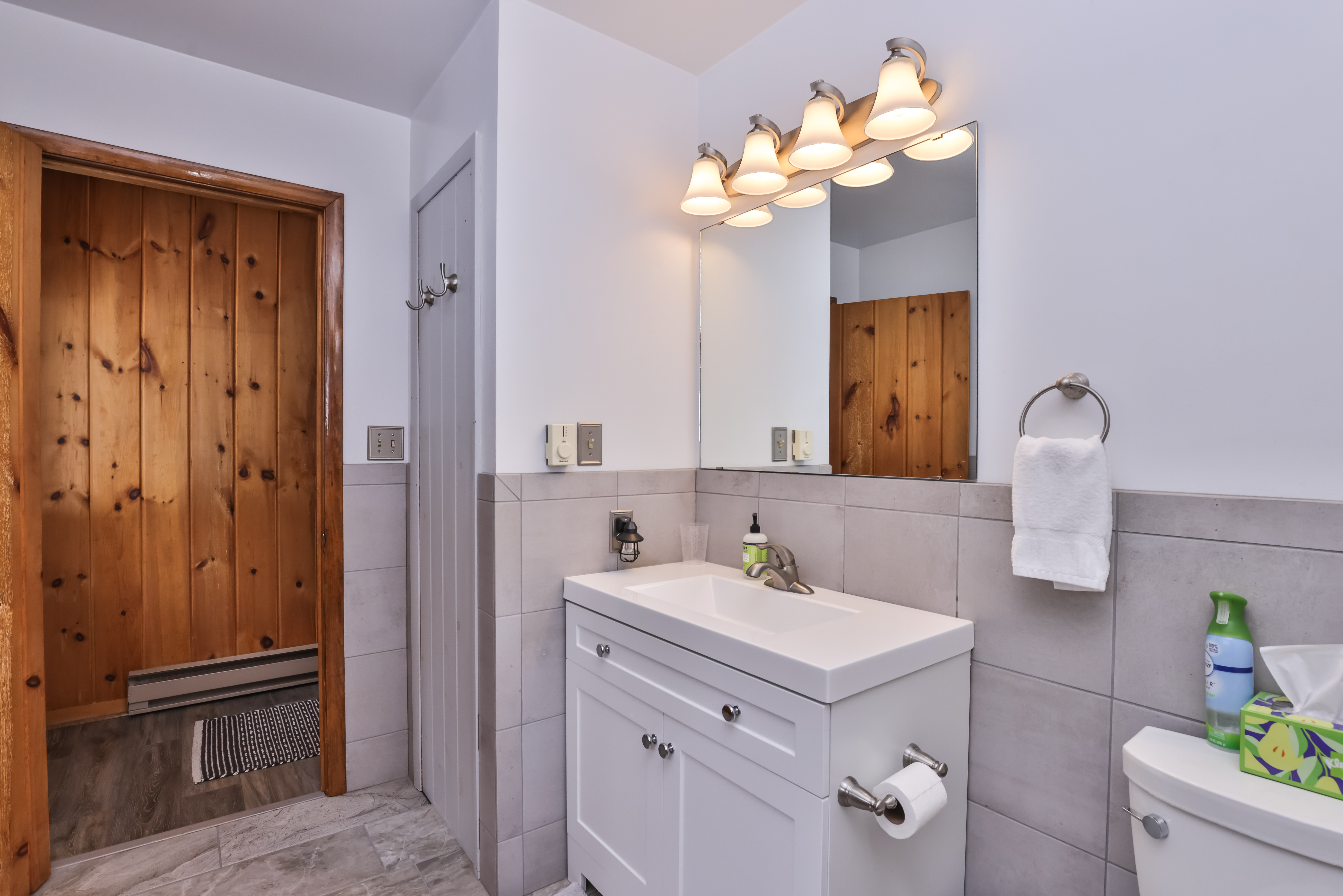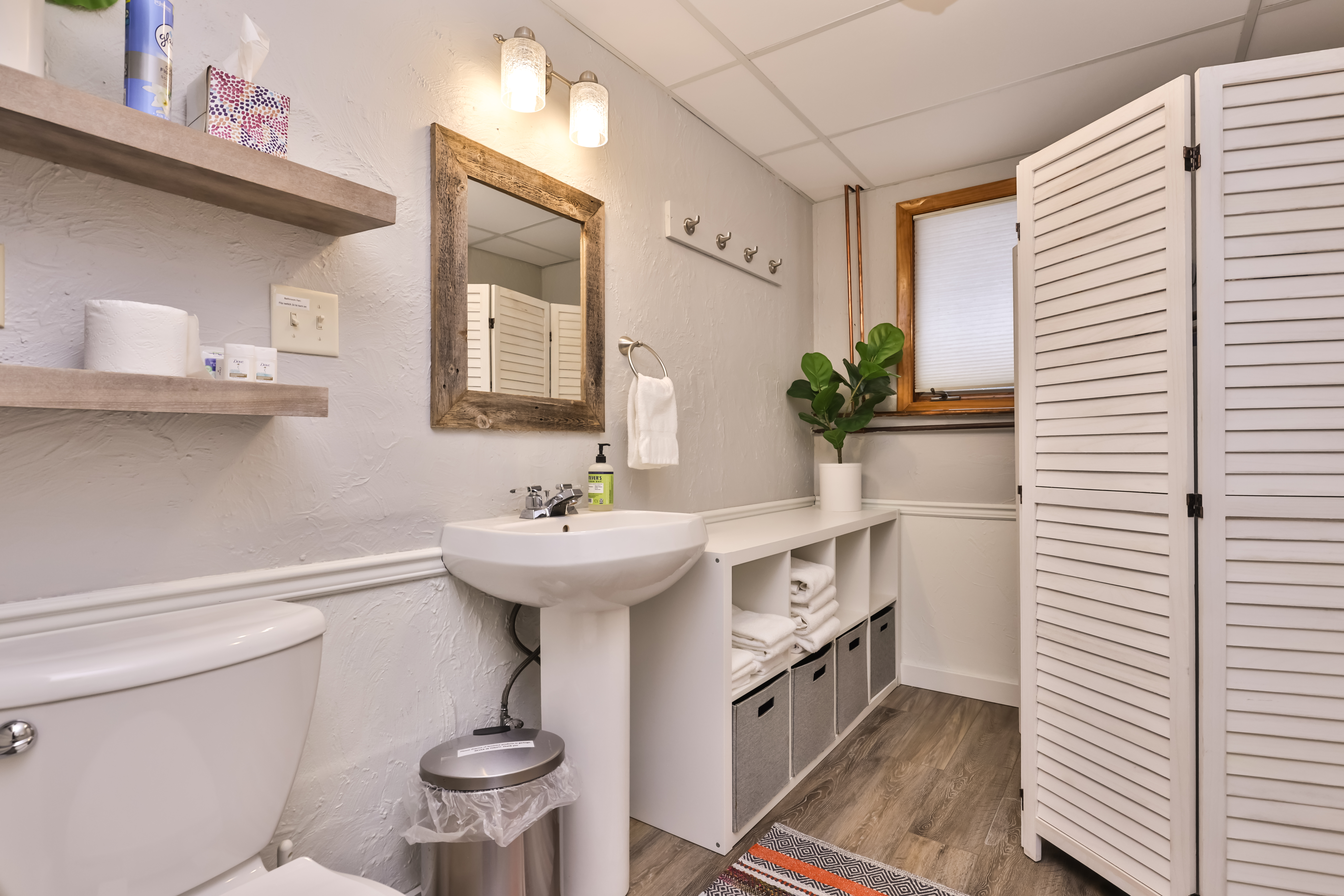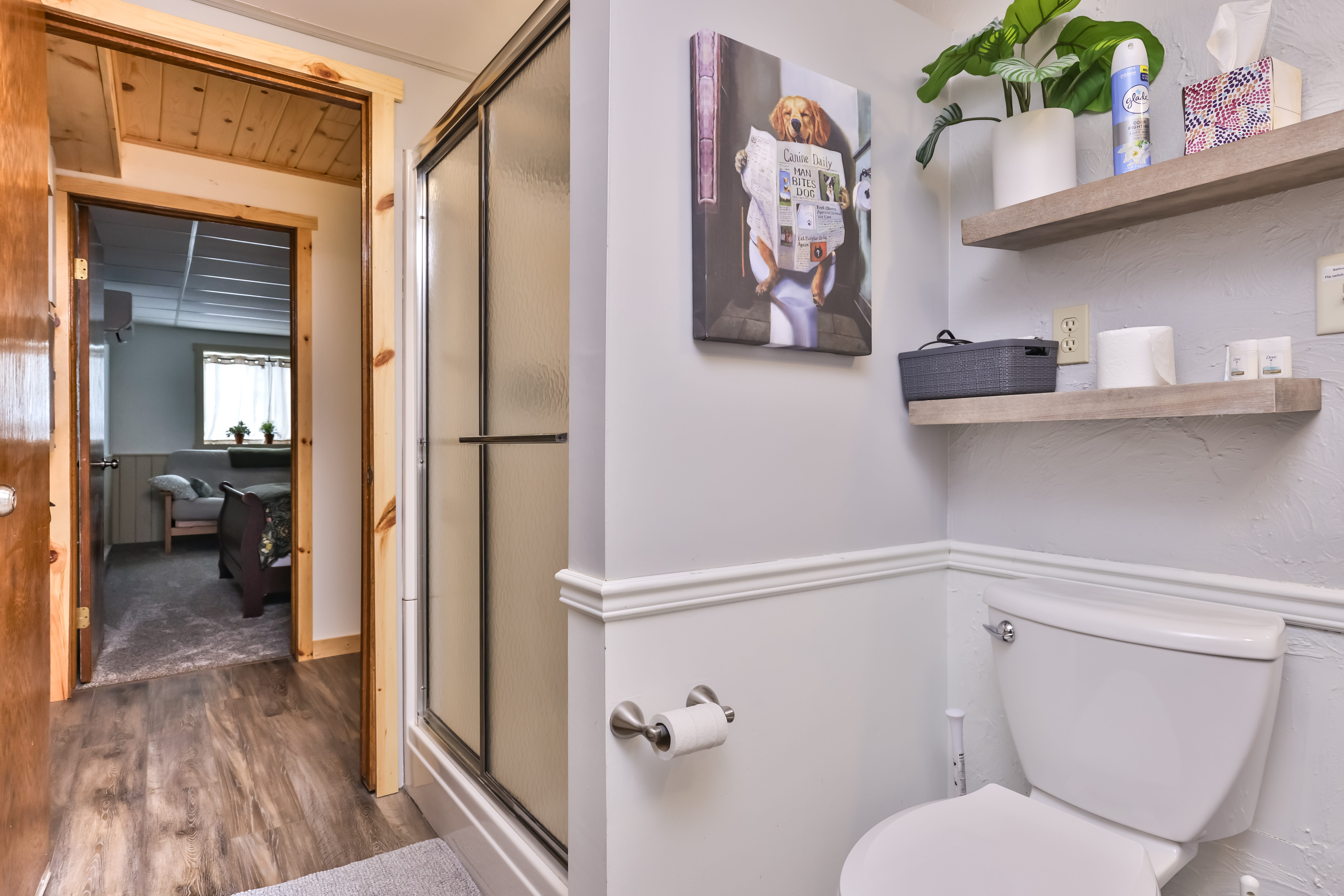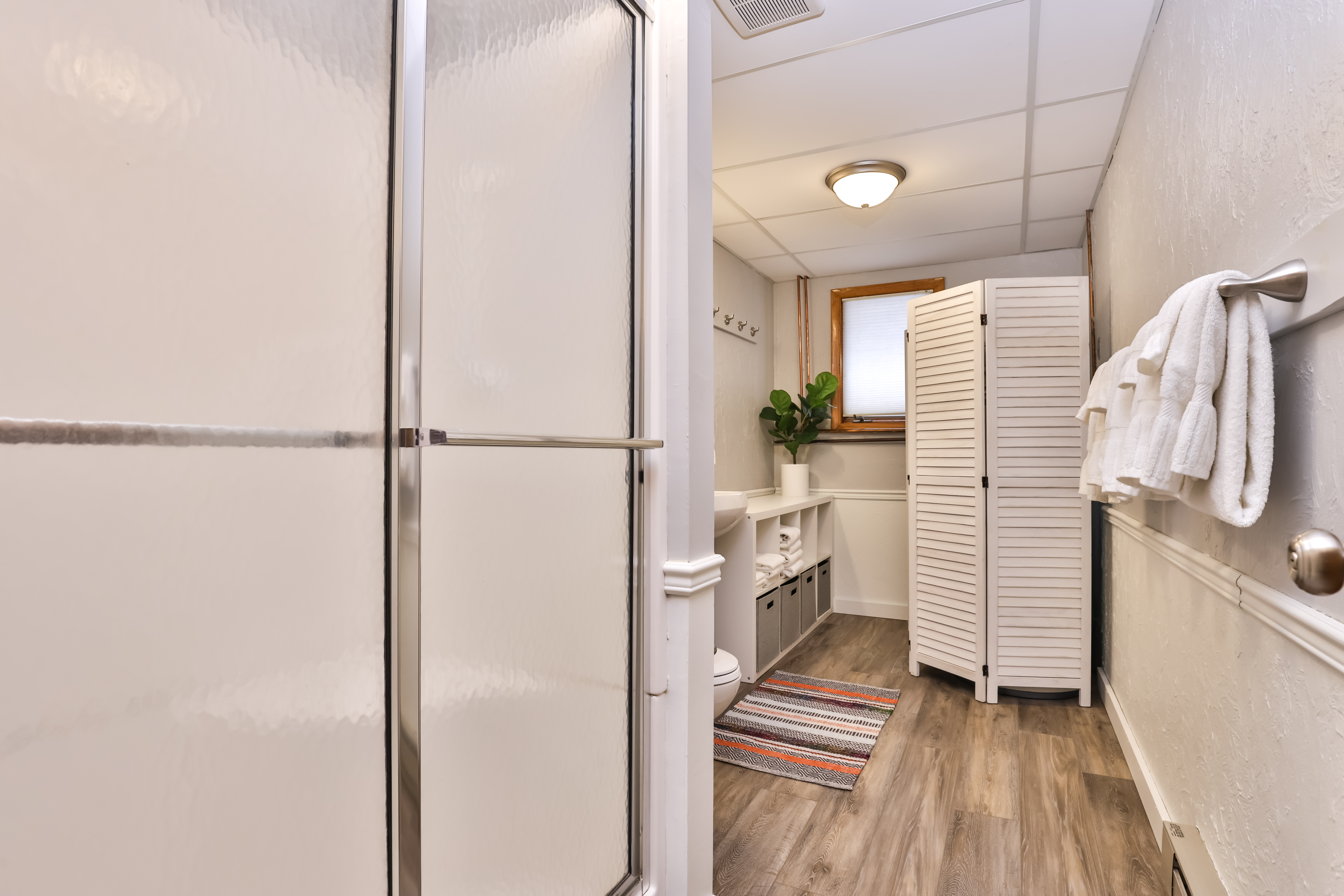 Bathroom 1 (ground/ lower level): Full bathroom with walk-in shower, hair dryer