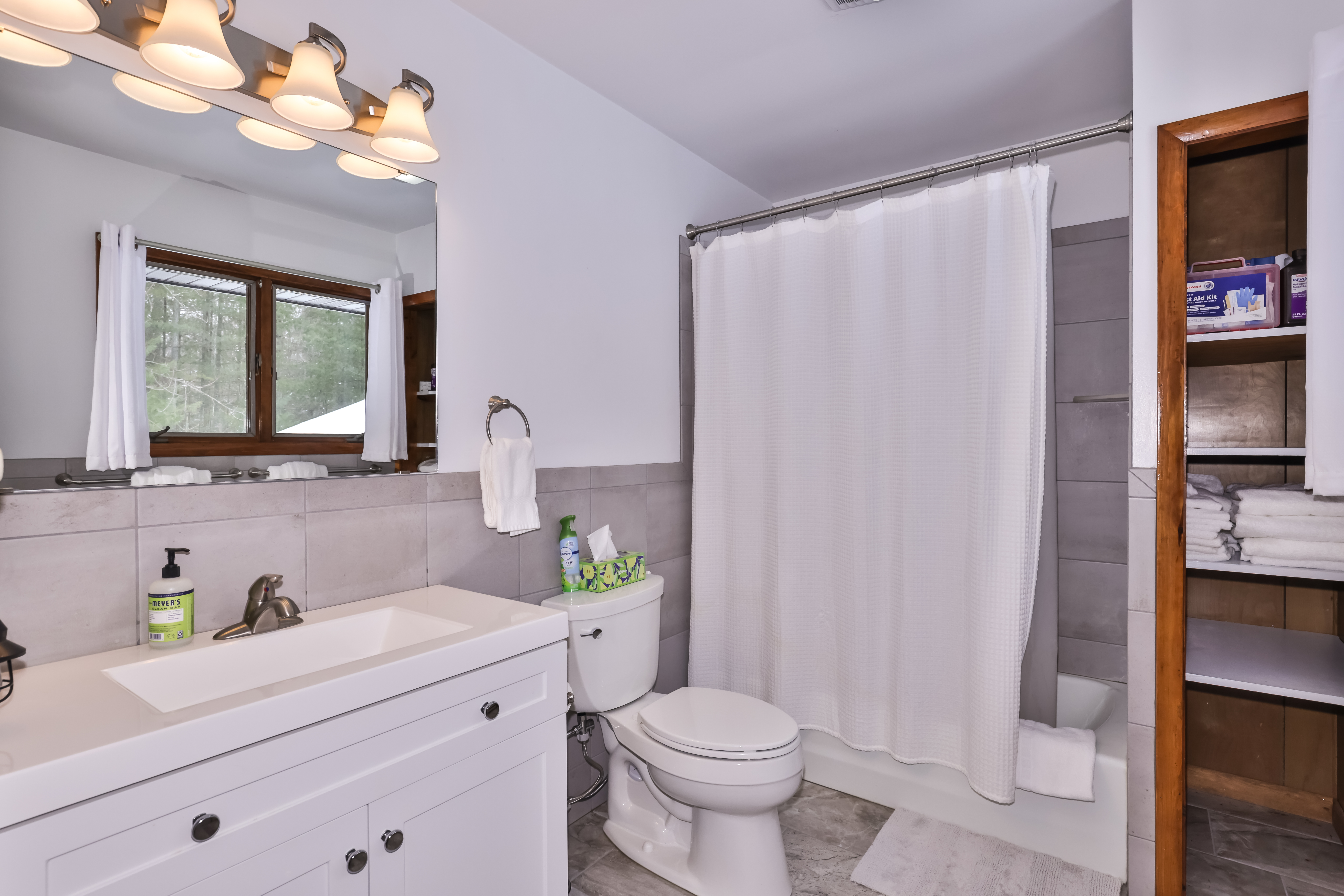 Bathroom 2 (main/ upper level): Full bathroom with tub/shower combo, hair dryer