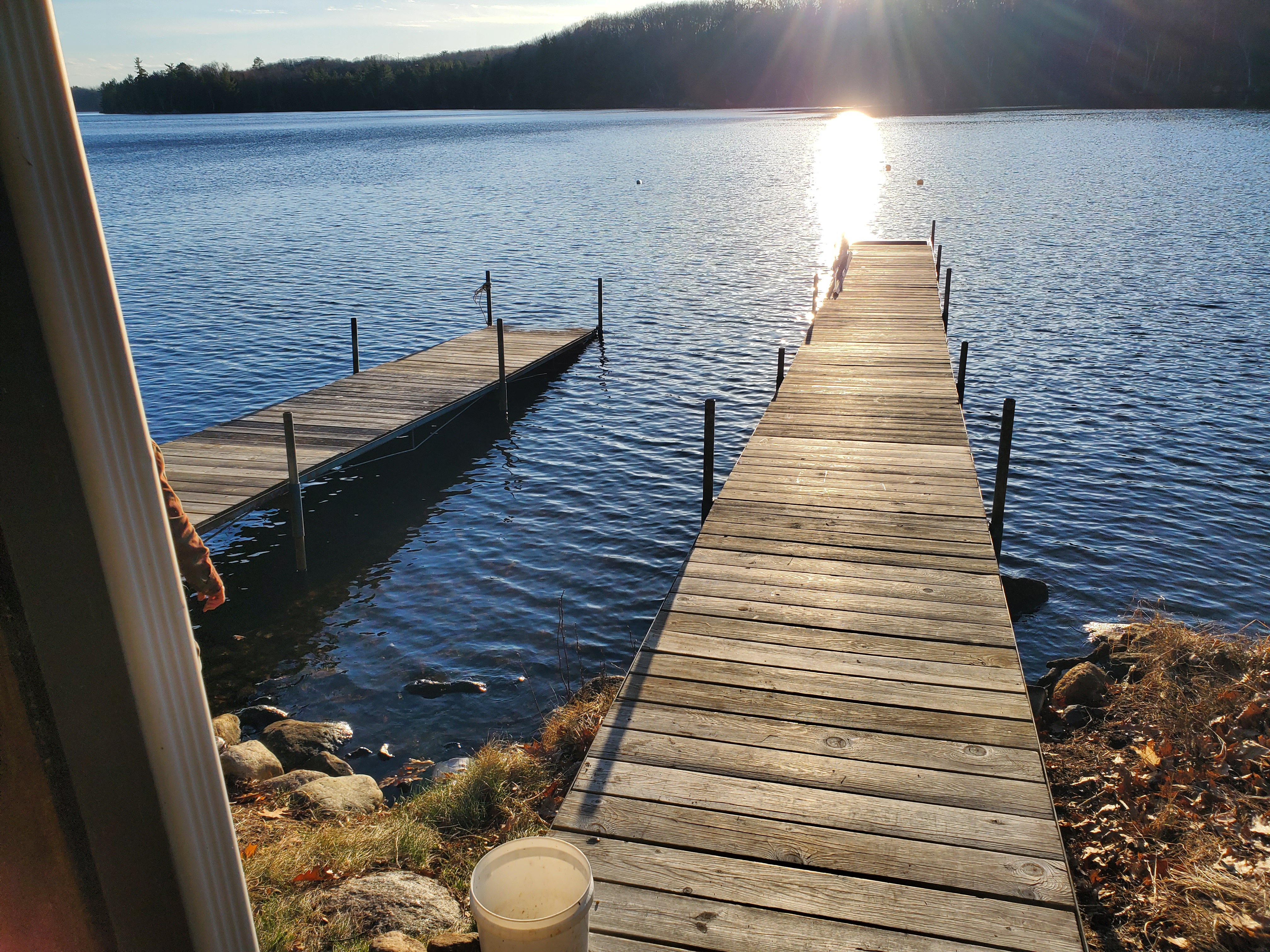 + Water is approximately 5 feet deep at end of dock and is slightly weedy with mostly rocks and sand. Ladder at the end of dock to enter water.