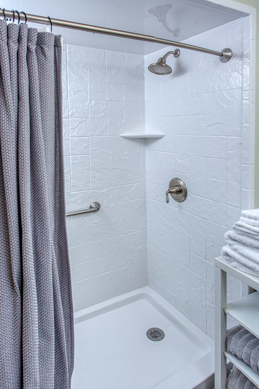 Full bathroom with walk-in easy access shower and grab bar on first floor