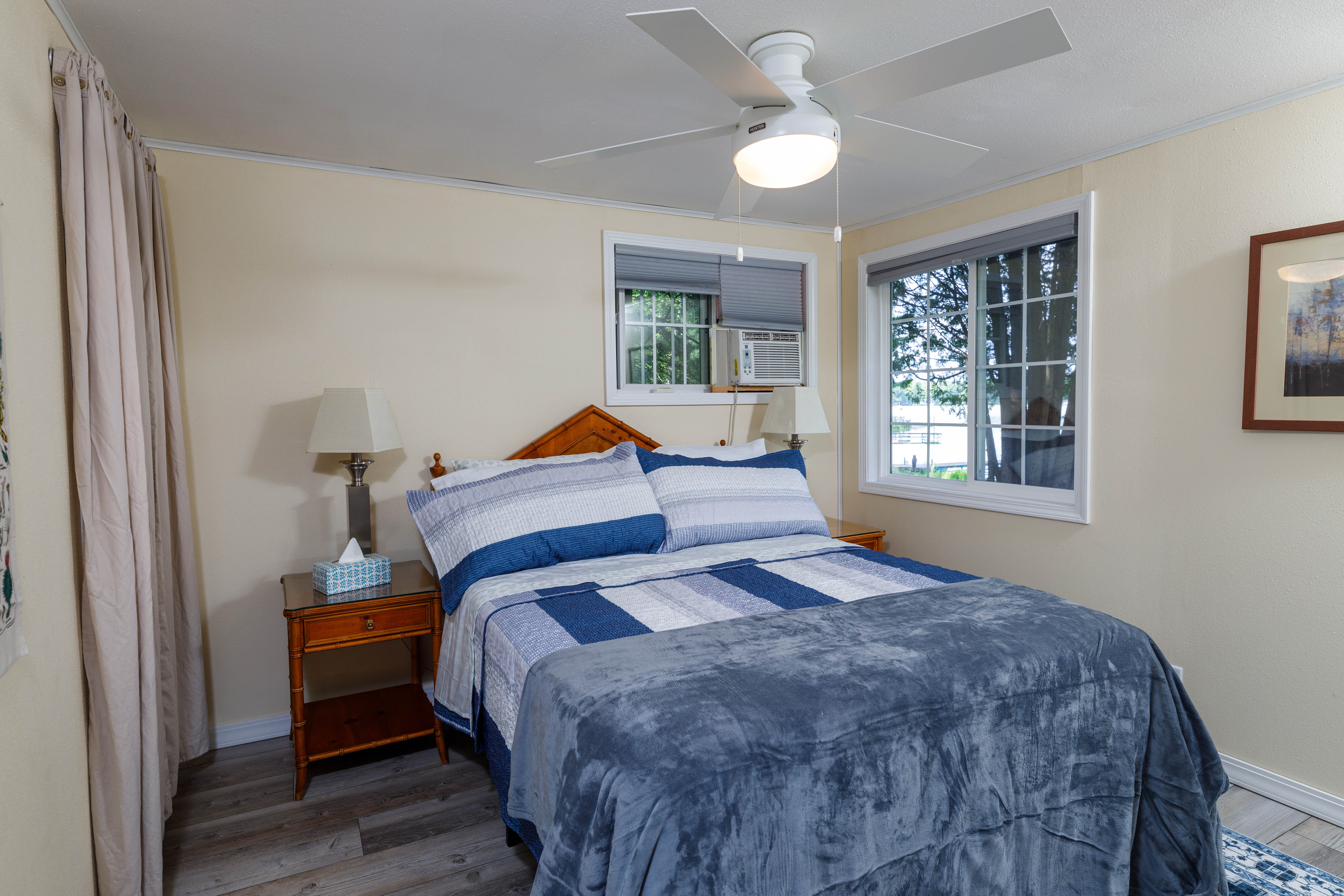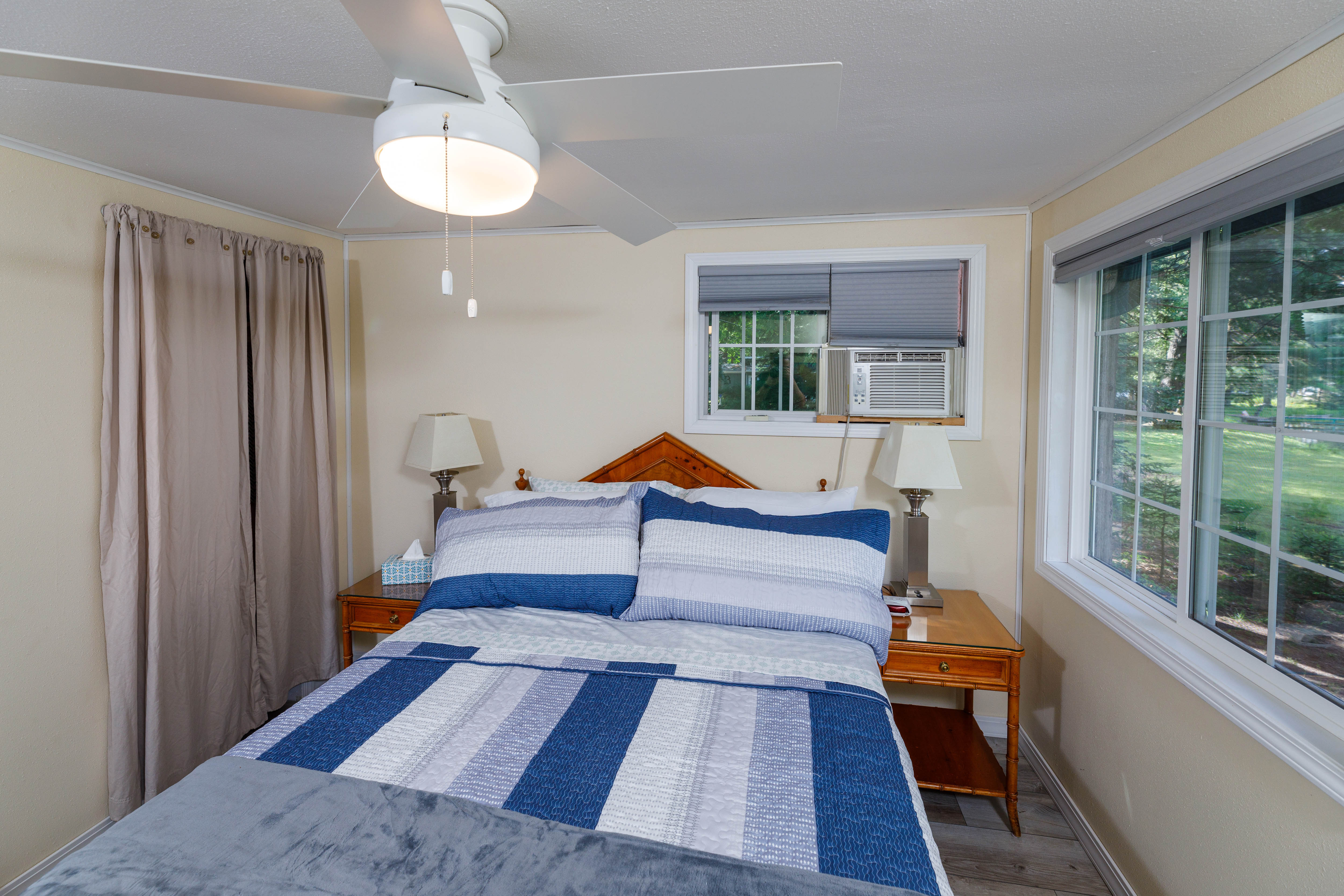Bedroom 1 (main level): Queen size bed, ceiling fan, A/C window unit, hangers, extra pillows and blankets