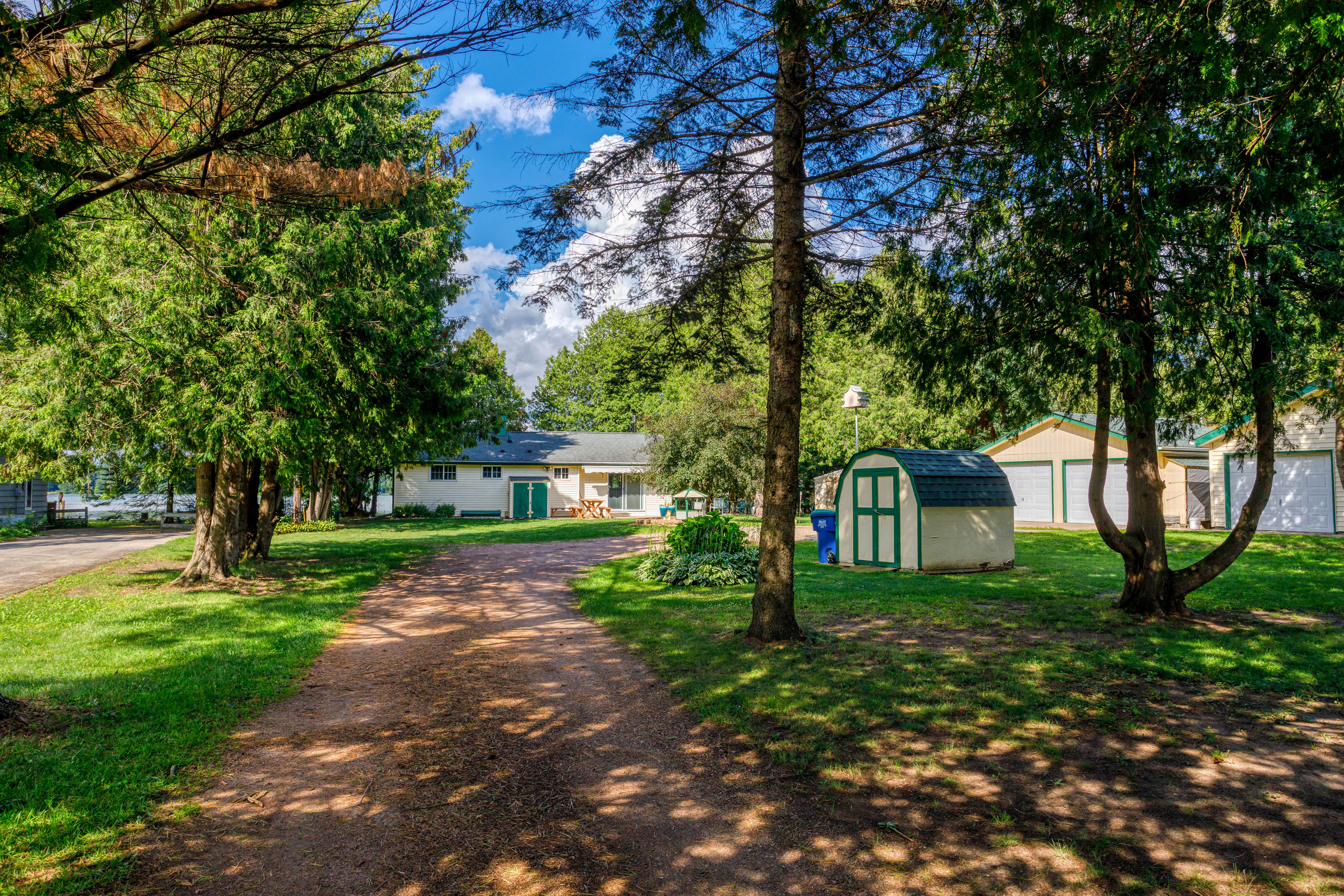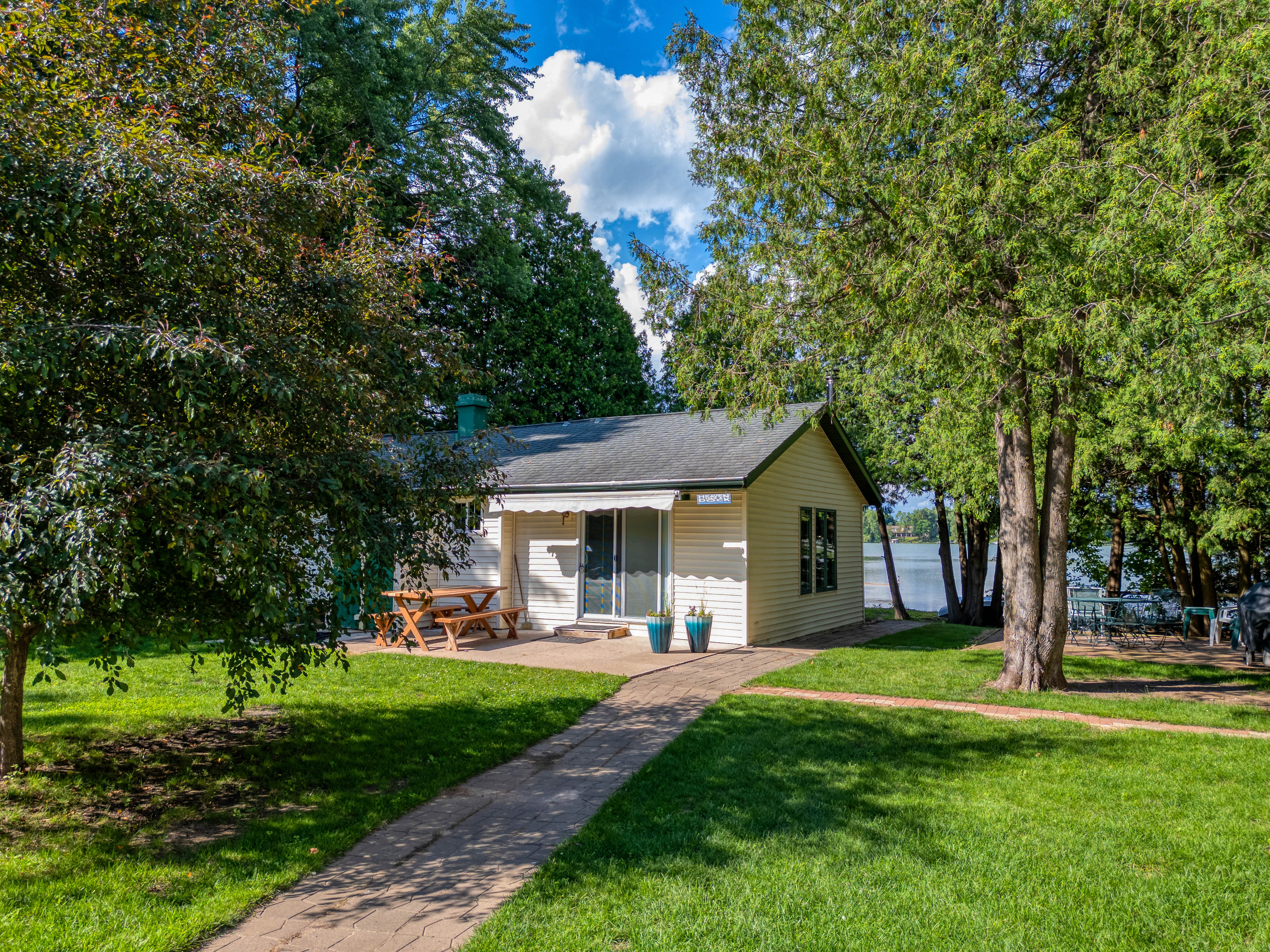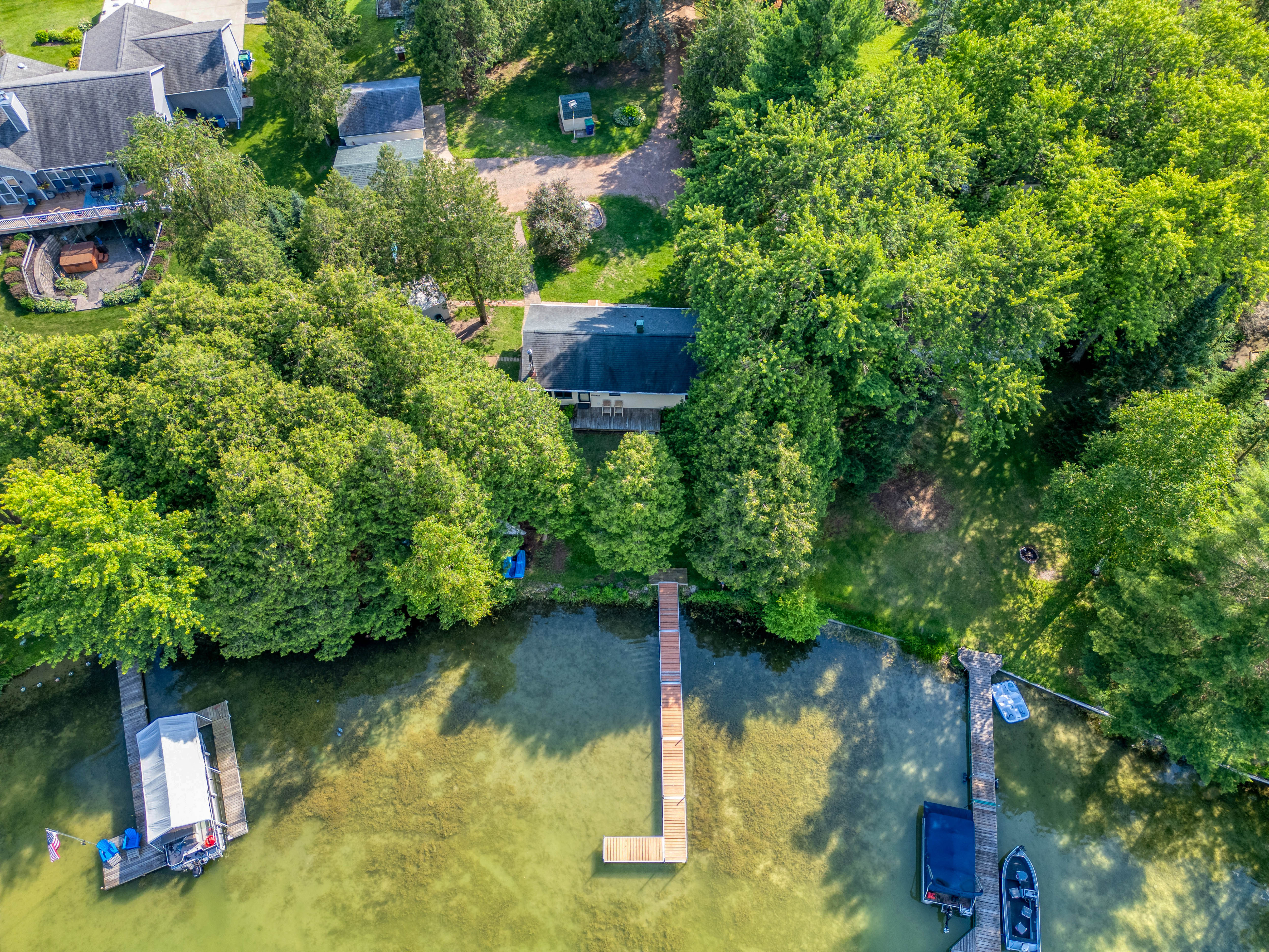 Wade into the 2-foot water and cool off with the kids! The lake has soft loam in the shallow waters. Navigate the grassy shoreline to enter the shallow crystal clear water. Take a look at those aerial photos! 2 canoes and 1 paddleboat are available for guest use!