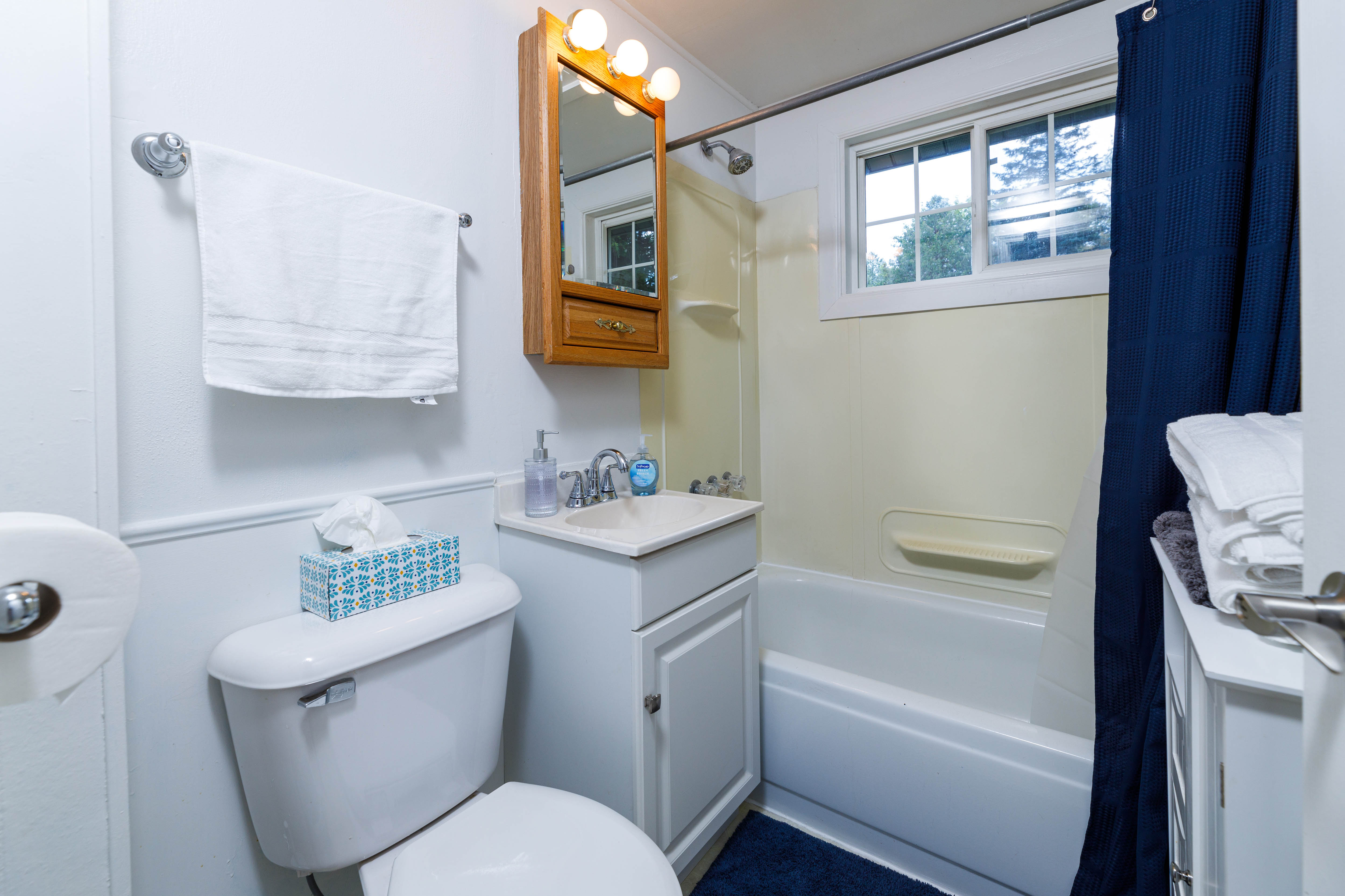 Bathroom 1 (main level): Full bathroom with tub shower combo and hair dryer