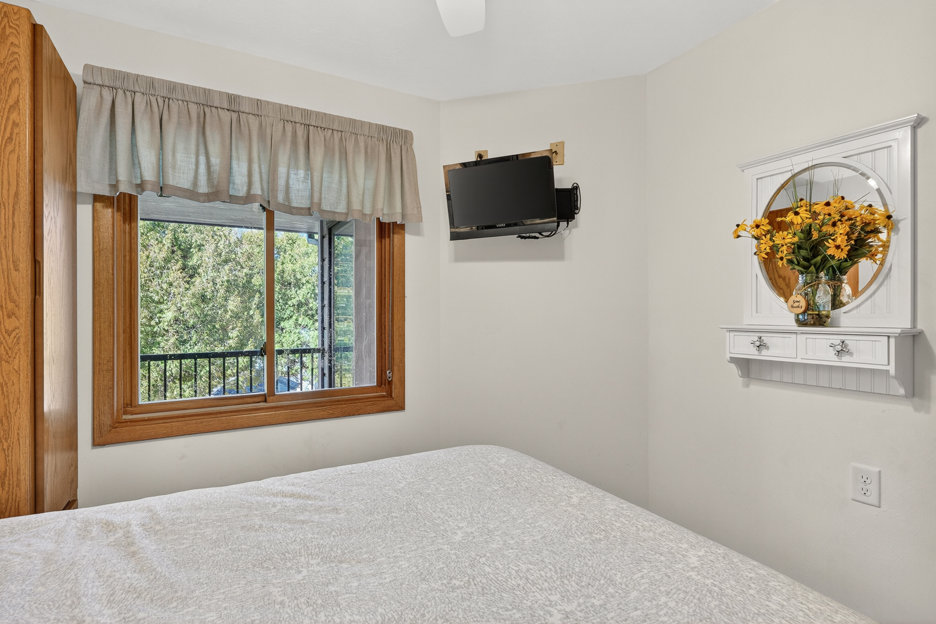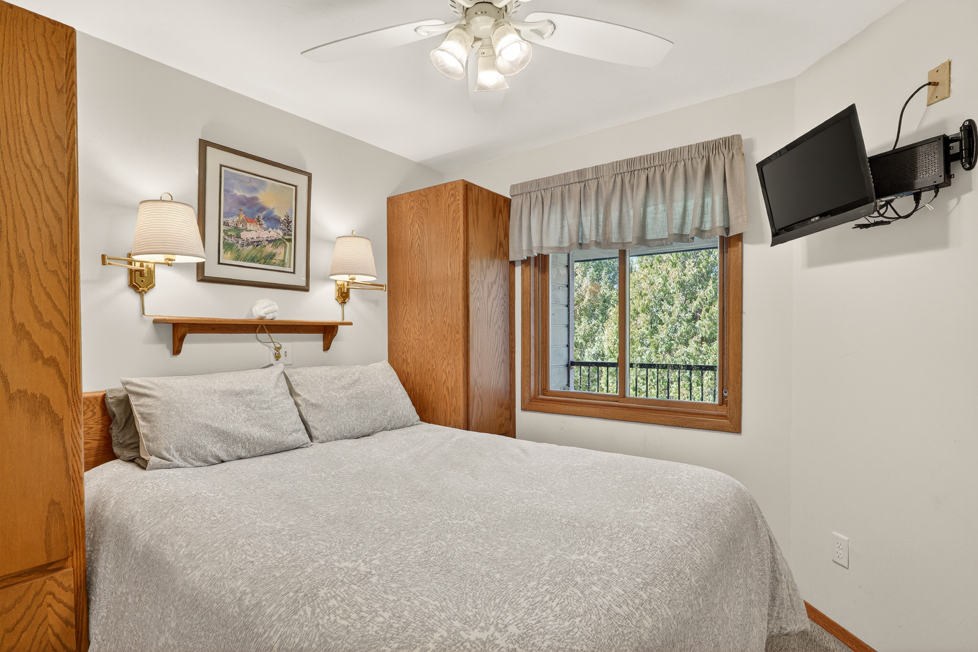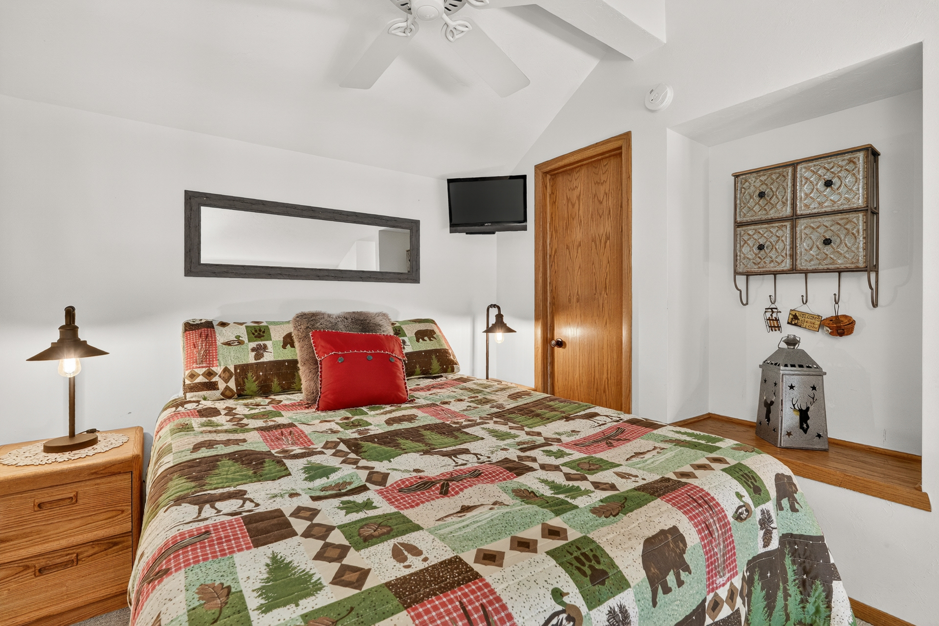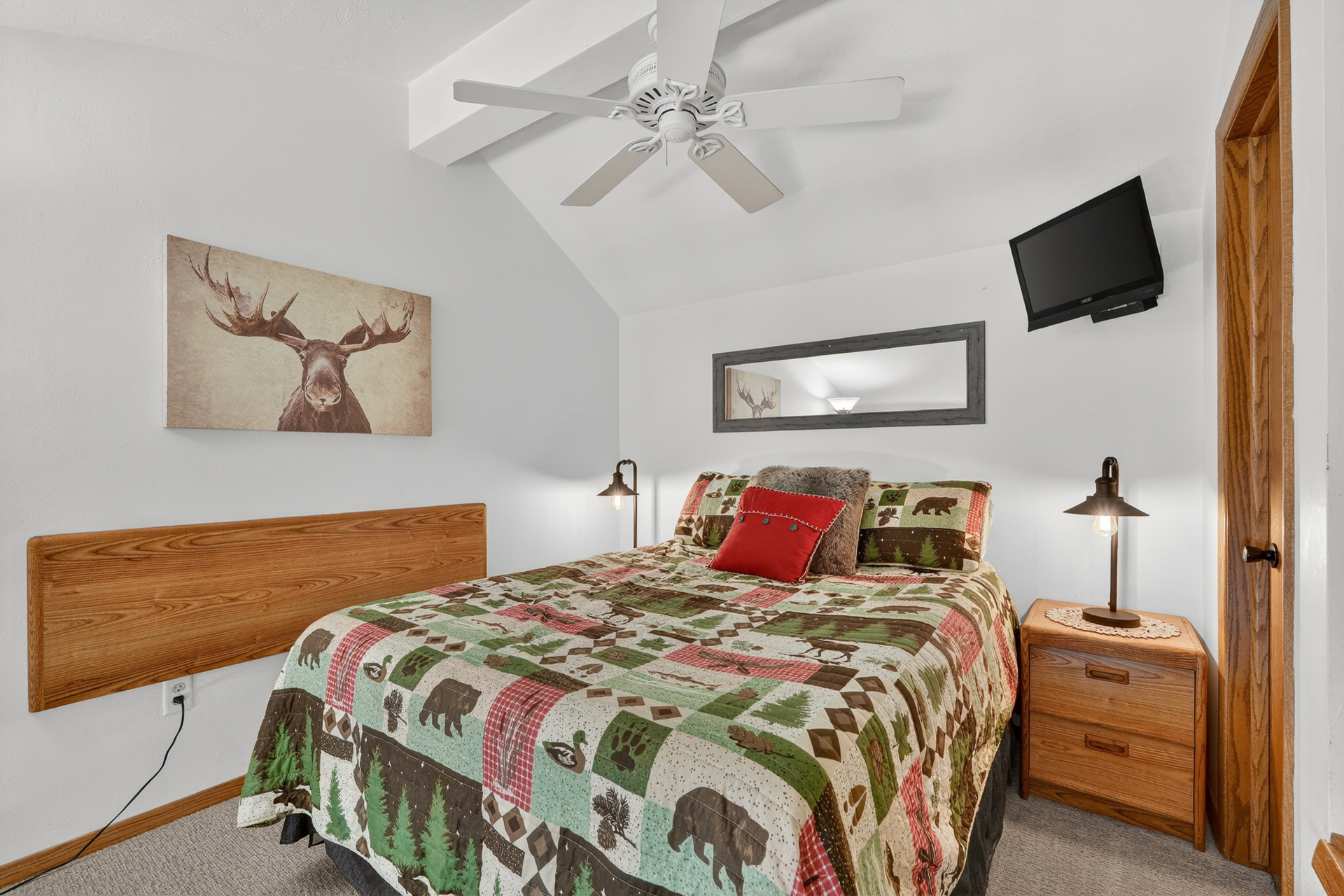 Bedroom 1 (main level): Queen size bed, TV, ceiling fan