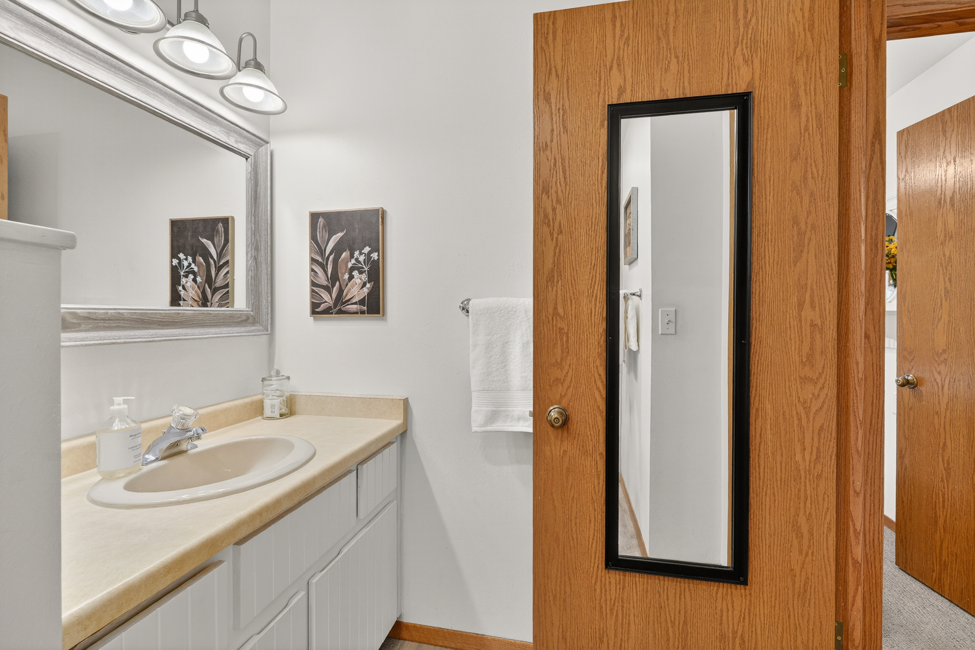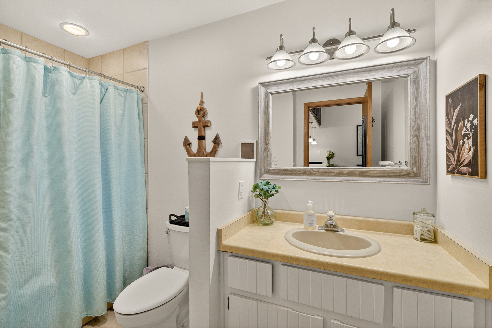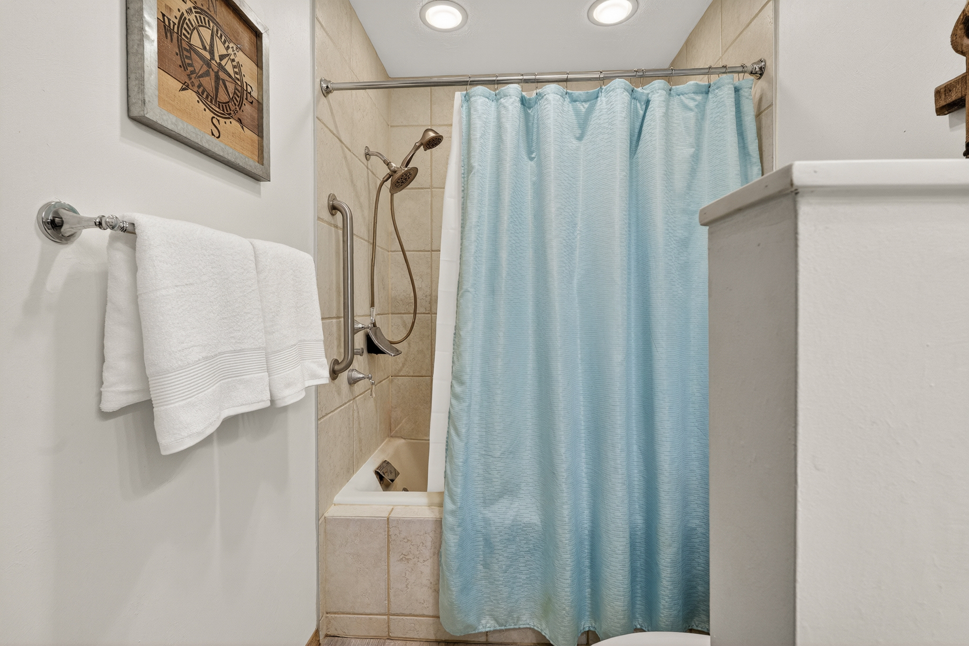 Full bathroom with shower + jetted tub combo, hair dryer (main level)