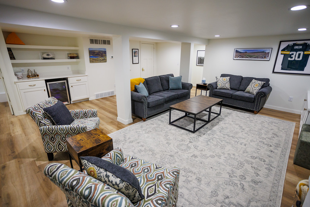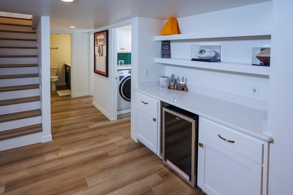 Basement includes a dry bar and mini-fridge