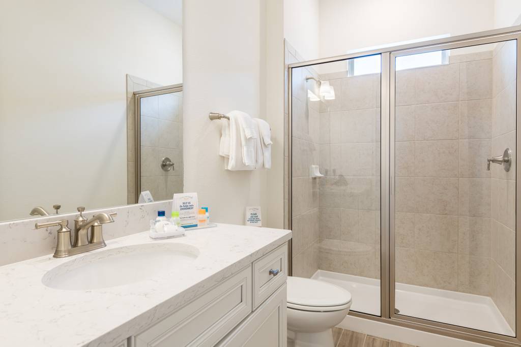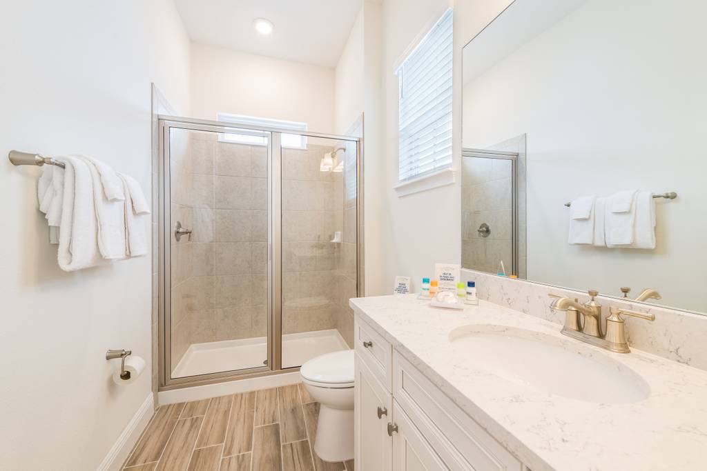Bathroom 2 (upper level): Full bathroom with walk-in shower, hair dryer
