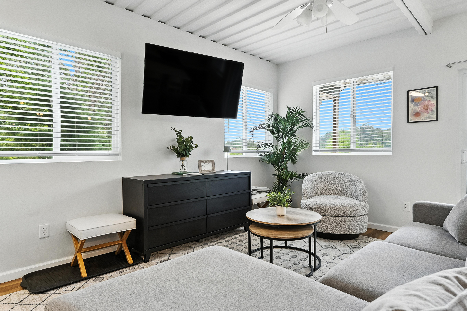+ 1 Smart TV in living room with Amazon Fire TV Stick. Guests may log in to streaming devices using their own accounts.