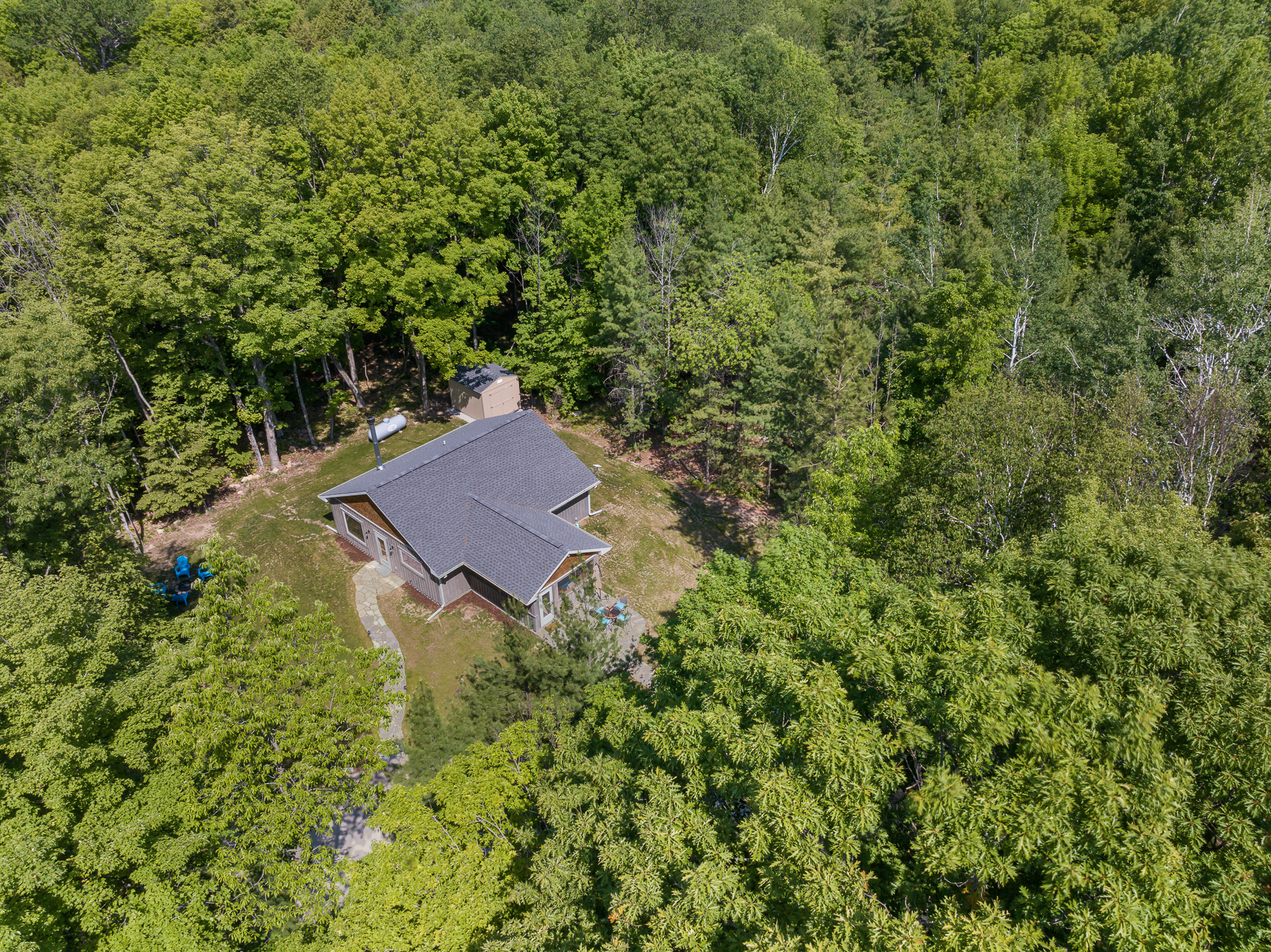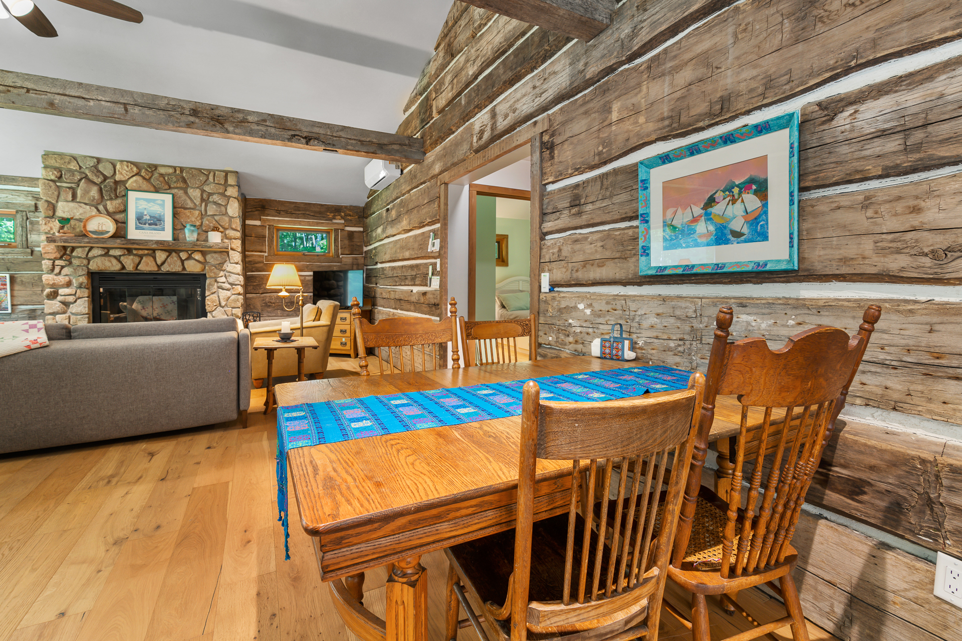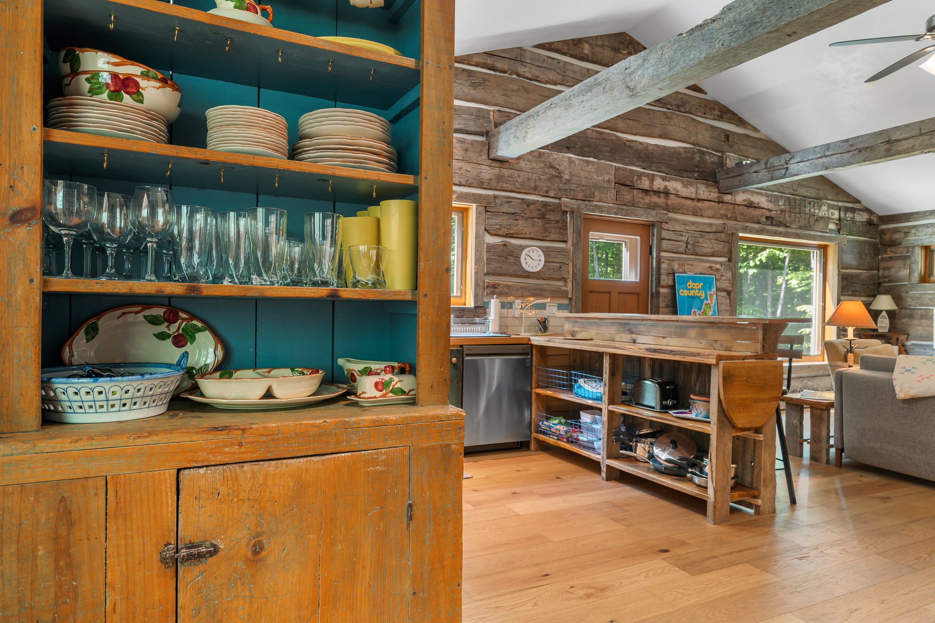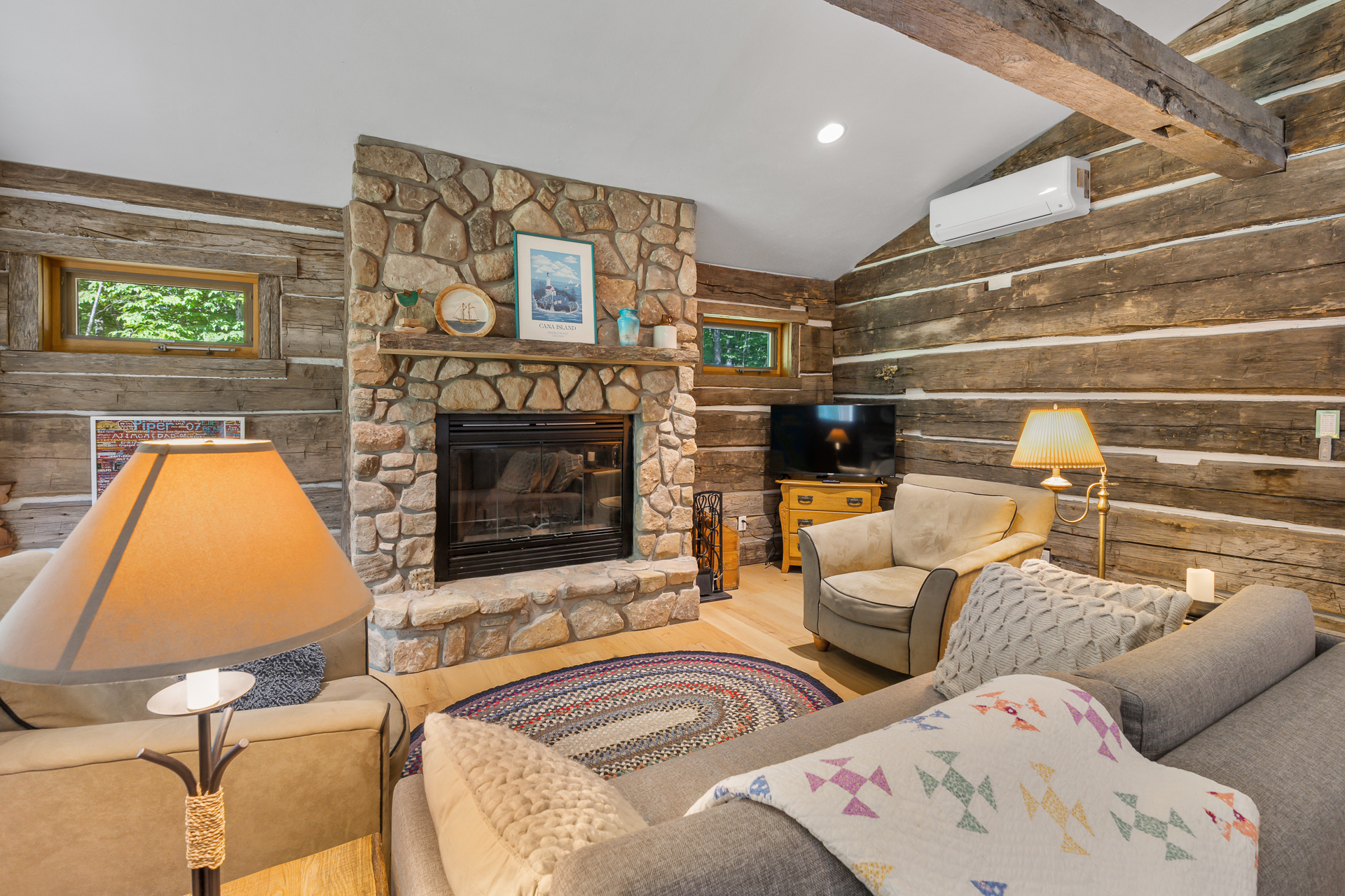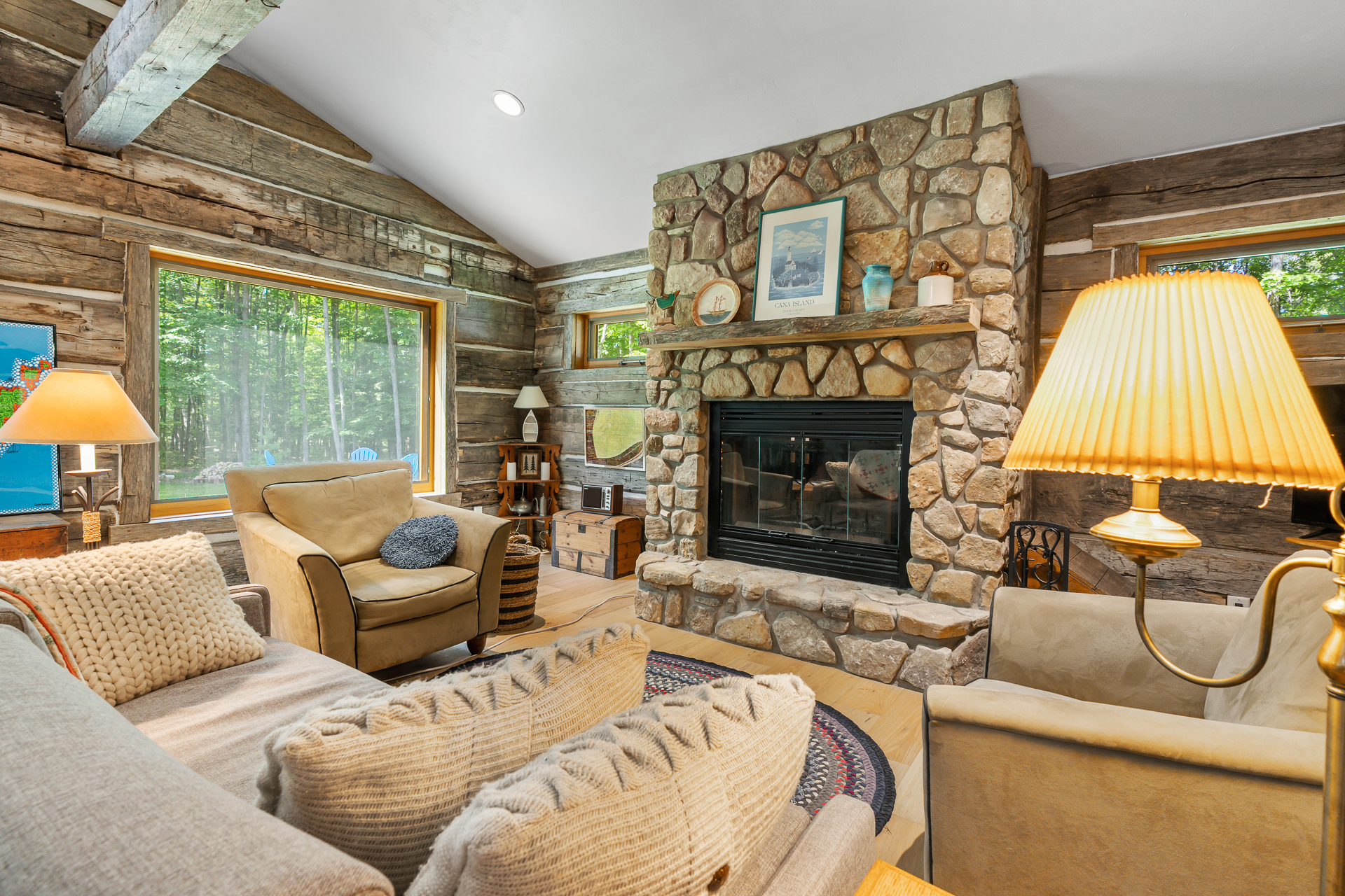 Our original intent when building our place was to restack old logs from a historic cabin that we dismantled near Minneapolis. To make a long story short, we ended up 'skinnying' the logs, and built a conventional stick-built home with the Great Room paneled in old logs, highlighted with a Door County stone fireplace. We love it!