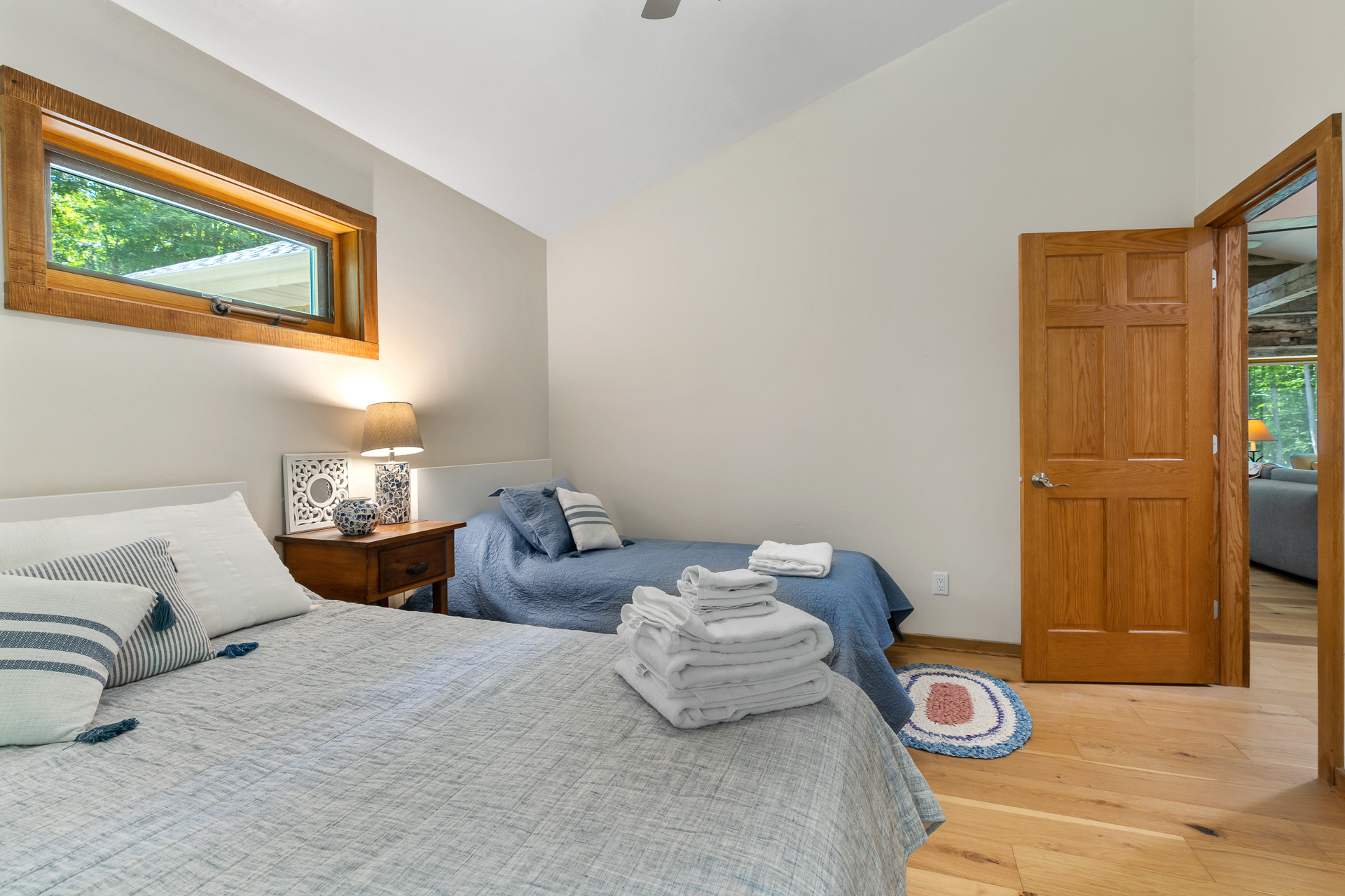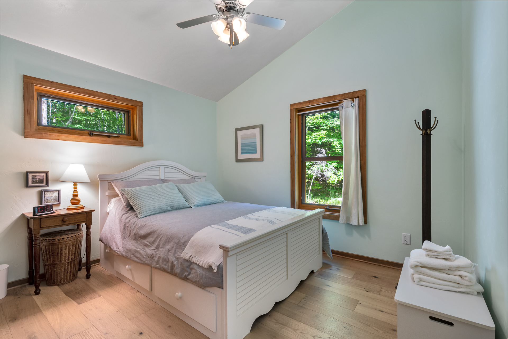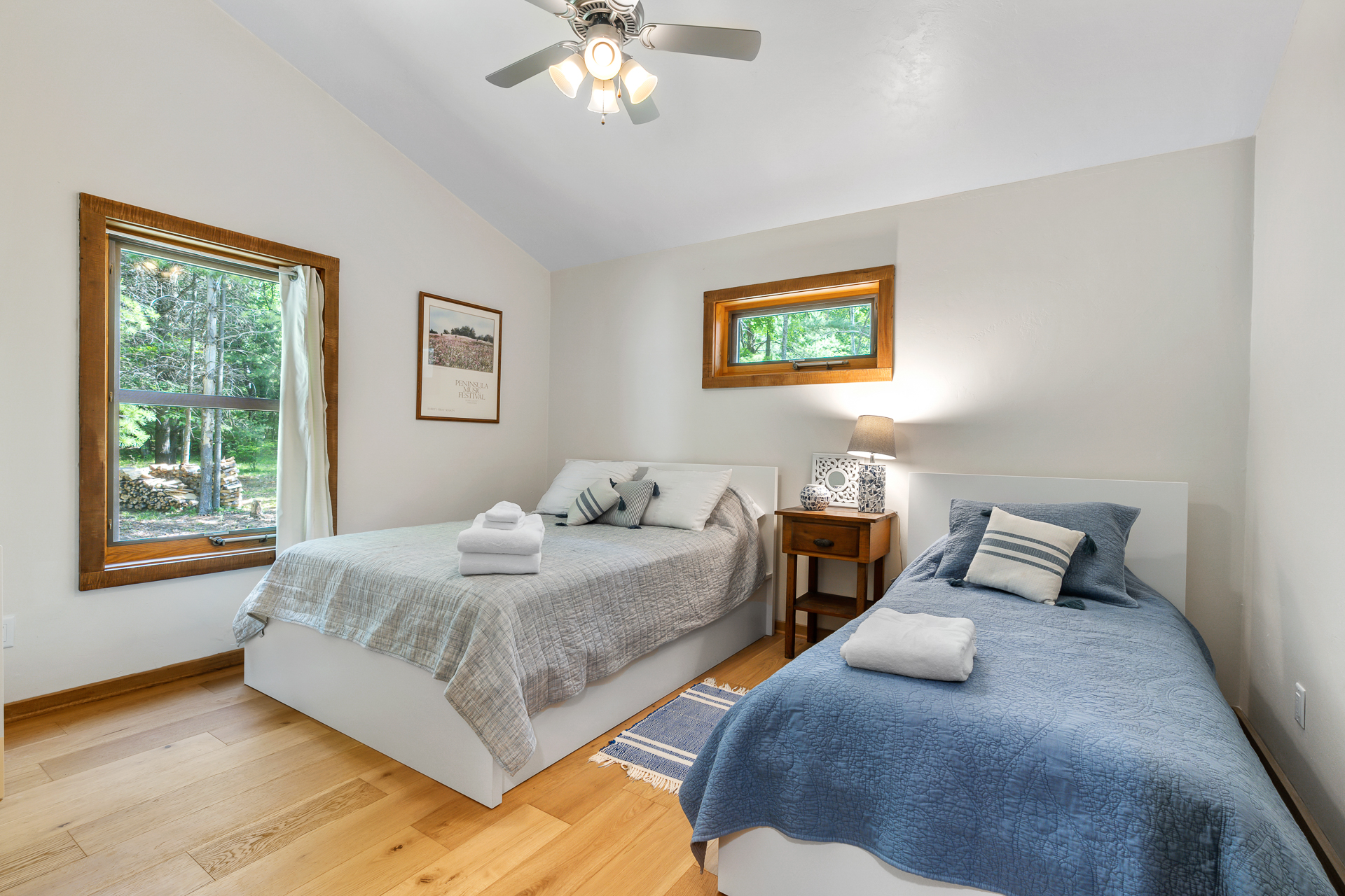 Bedroom 2 (main level): includes a Queen bed, a Twin bed, ceiling fan, extra pillows and blankets