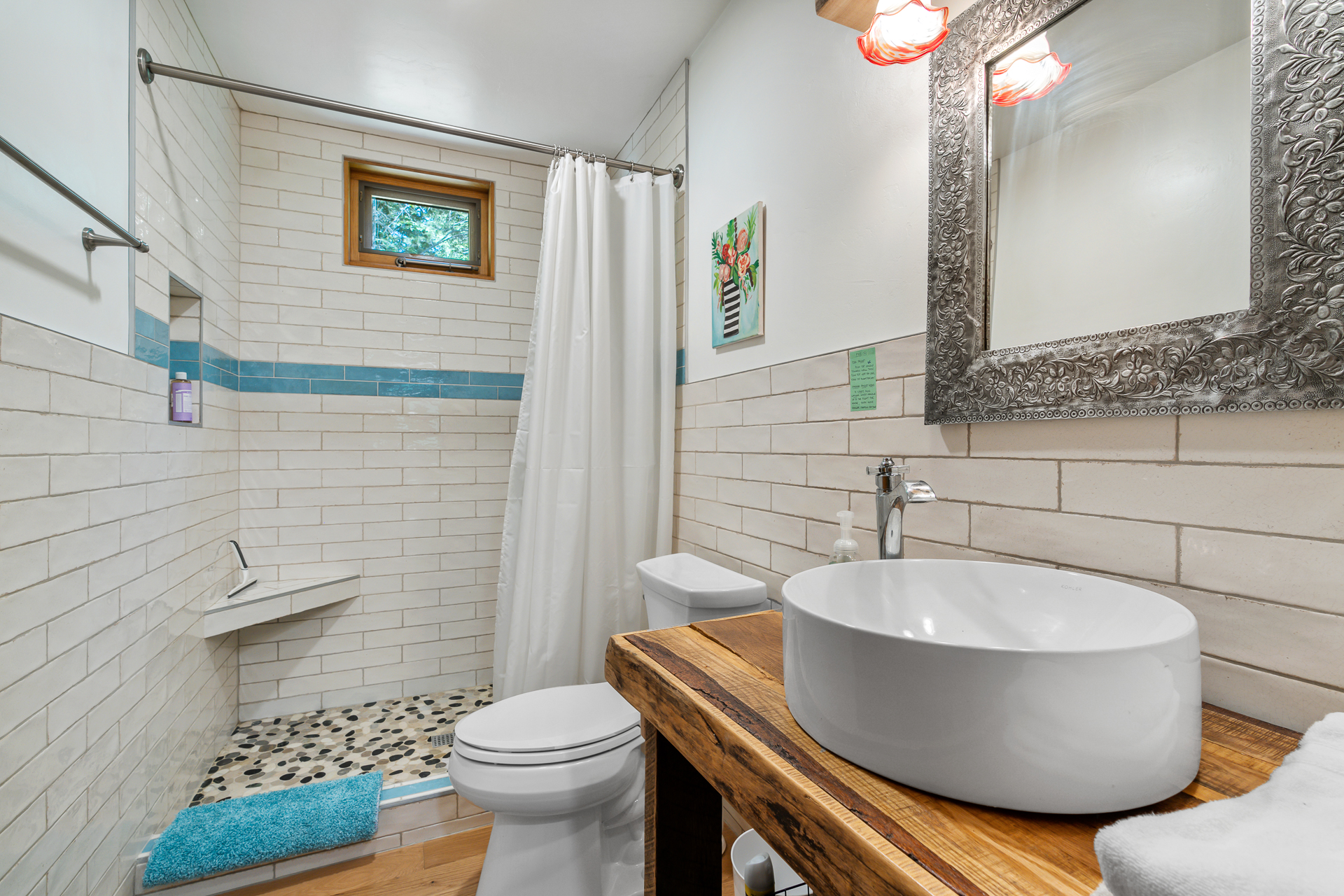 Bathroom 1 (main level): Full bathroom with shower only and hair dryer