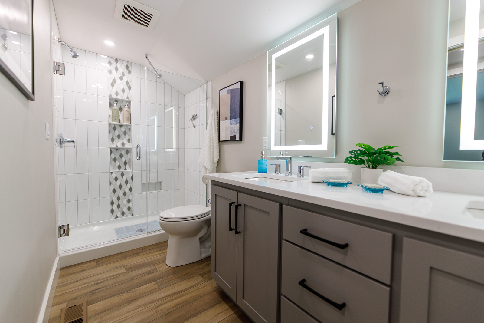 + 2.5 newly renovated bathrooms with spa-quality features and lighted, heated vanity mirrors