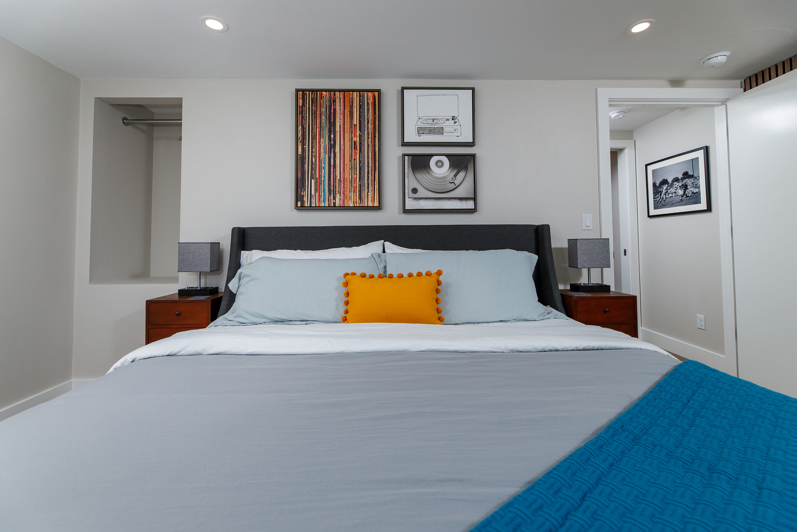 Bedroom 1 (main level): King size bed, room darkening shades, hangers, extra blankets and pillows
