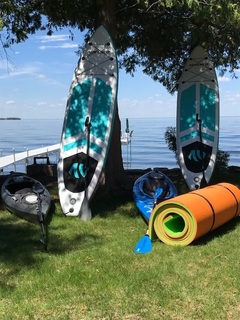 + Water toys including: a floating water lily pad mat, two paddle boards, two kayaks