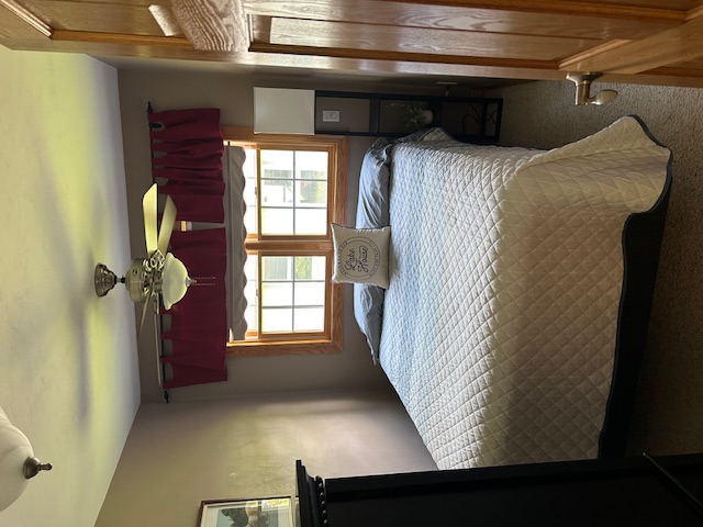 Bedroom 1 (main level): Queen bed, TV, ceiling fan and room darkening shades