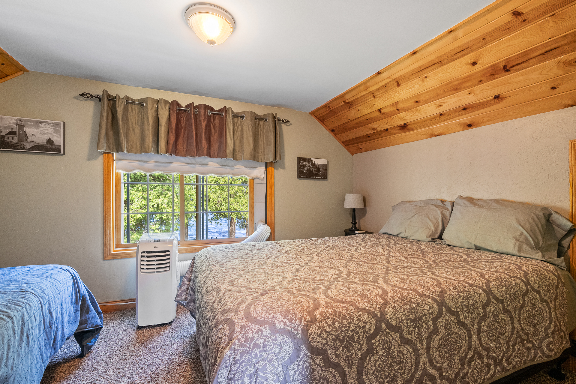 Bedroom 2 (second floor): Queen bed, TV, window AC unit, room darkening shades and hangers