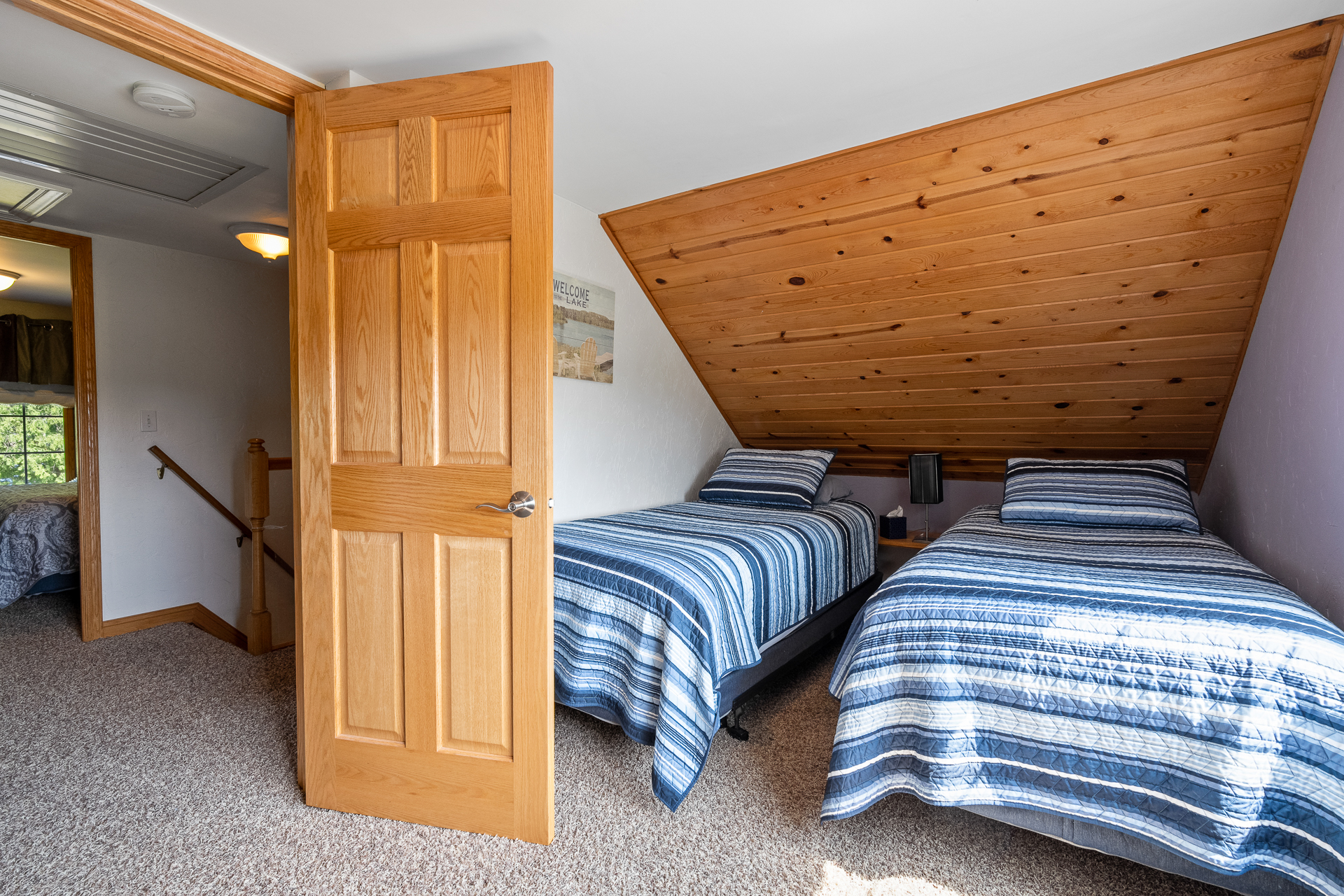 Bedroom 4 (second floor): two Twin XL size beds, window AC unit, fan, room darkening shades and hangers