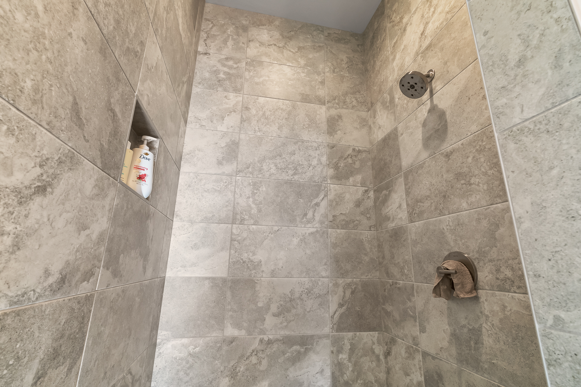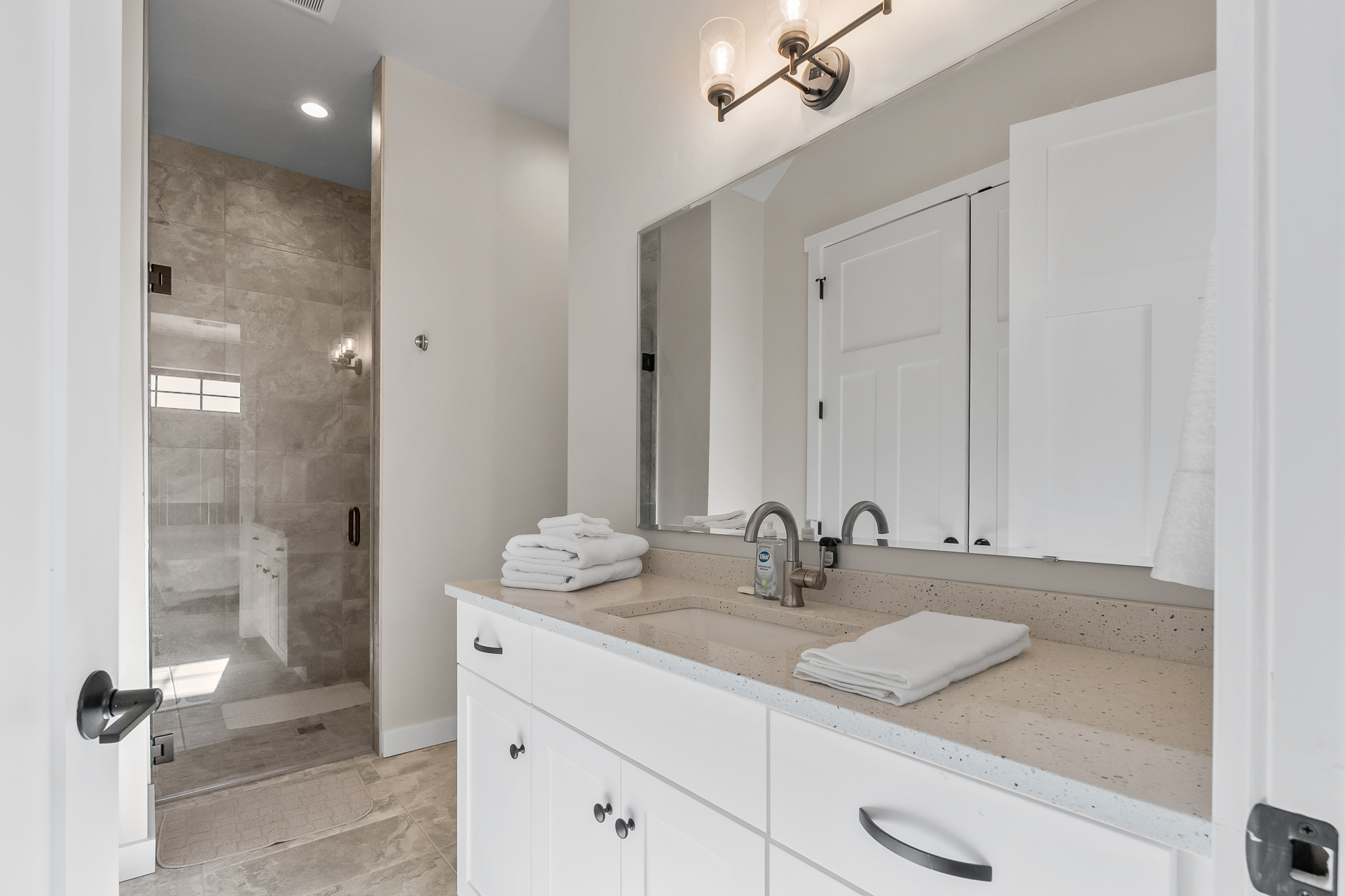 Bathroom 2 (main level): Full bathroom with walk-in shower, hair dryer