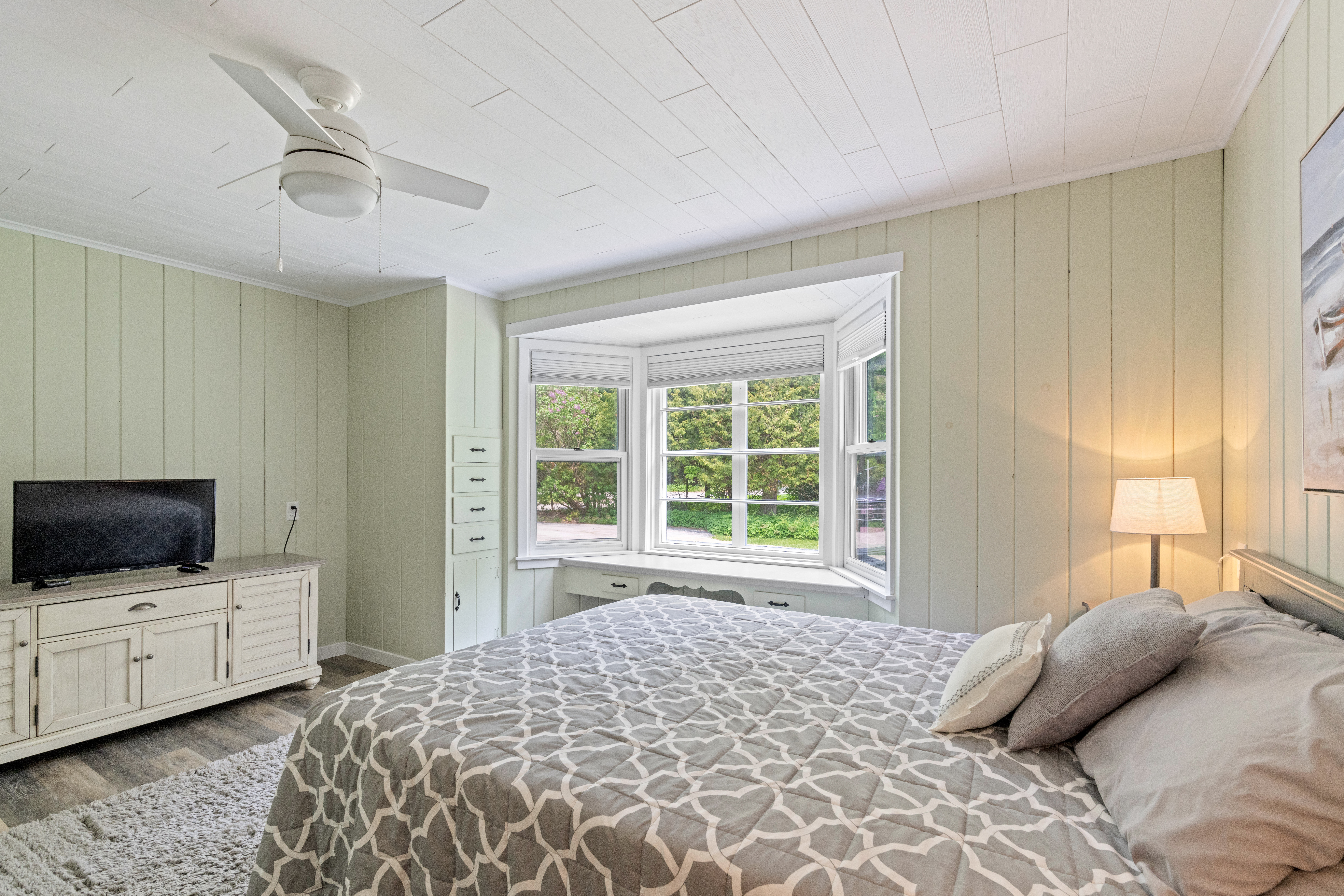 Bedroom 1 (main level): Queen size bed, TV, ceiling fan