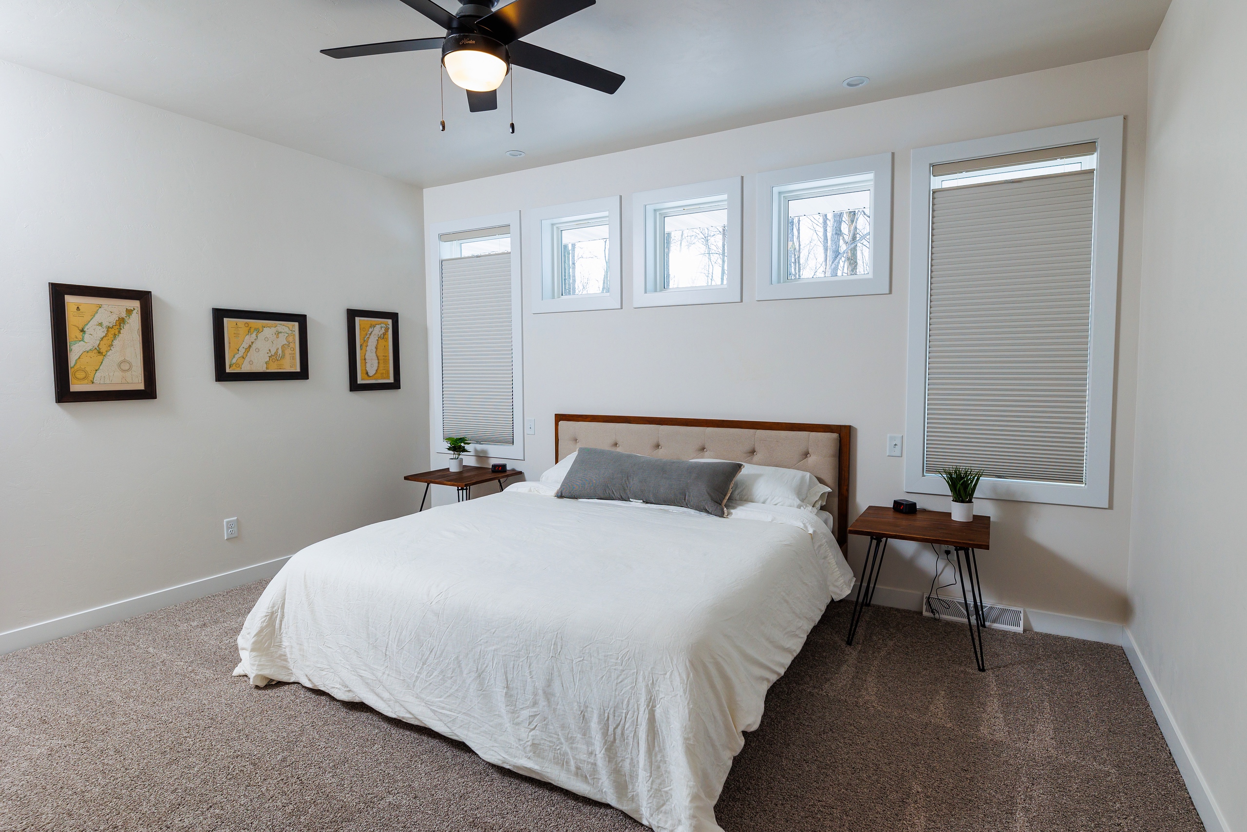 Bedroom 1 (main level): King bed, ceiling fan, Smart TV