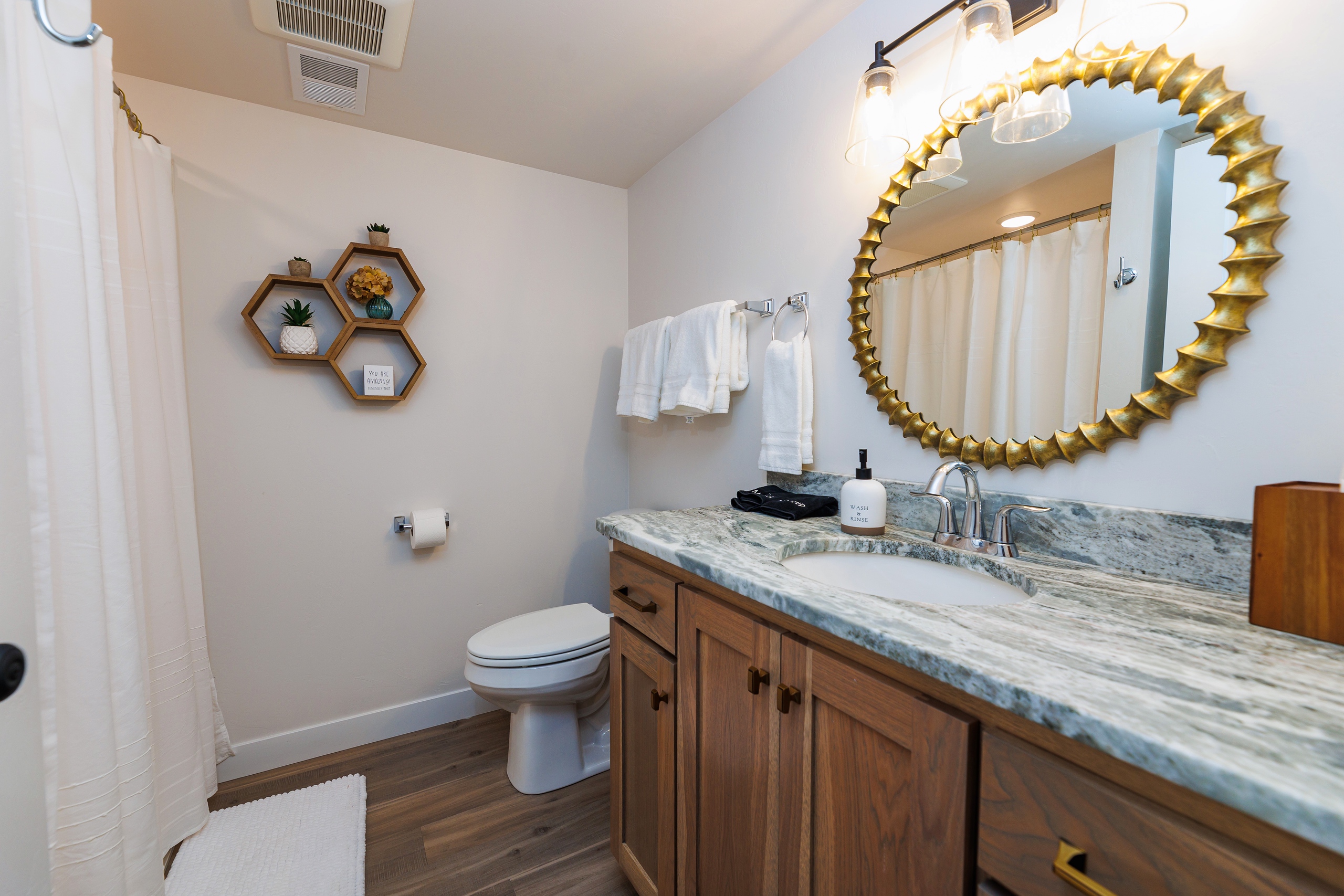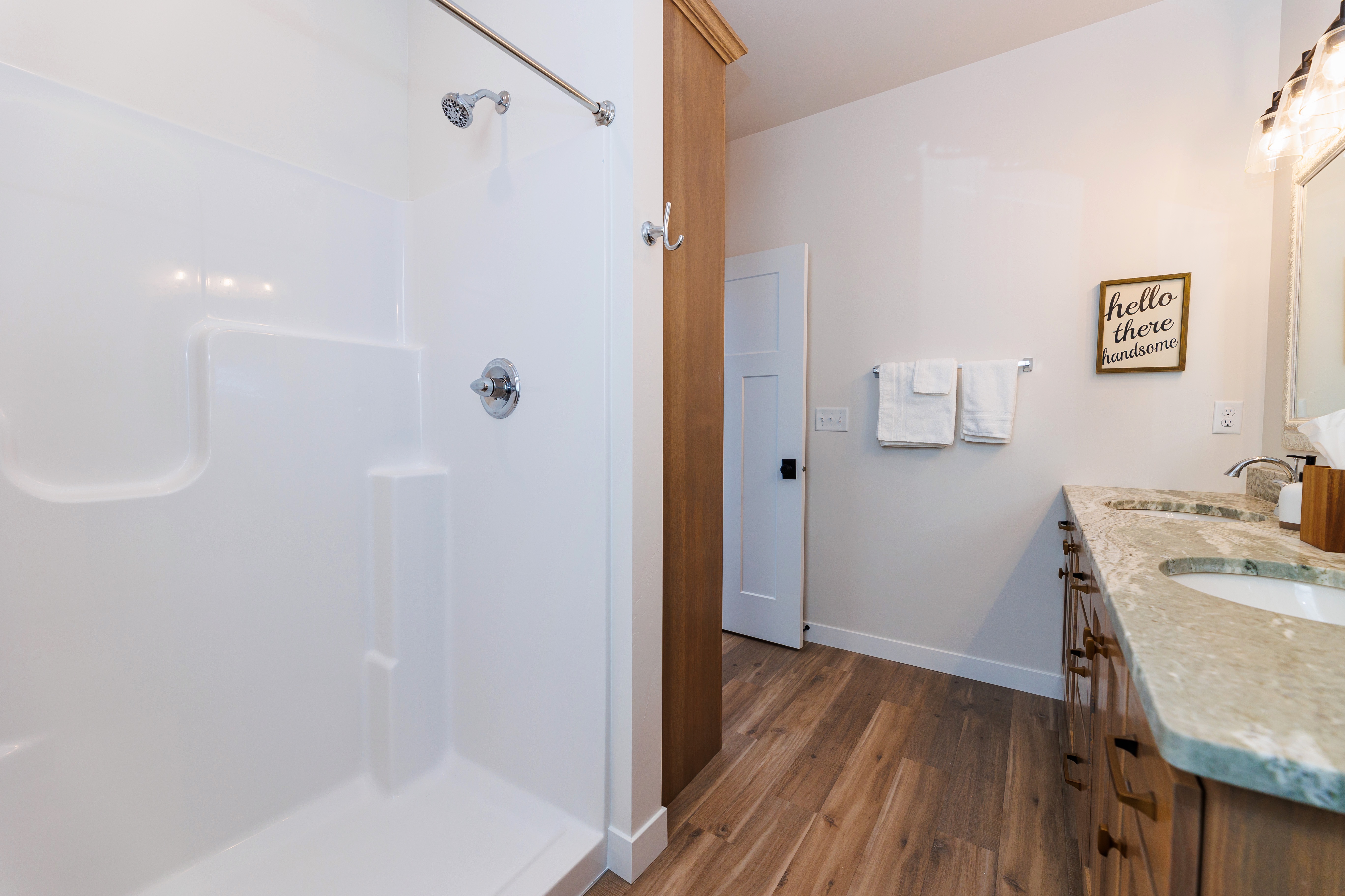 Bathroom 2 (main level): Full bathroom with walk-in shower, hair dryer