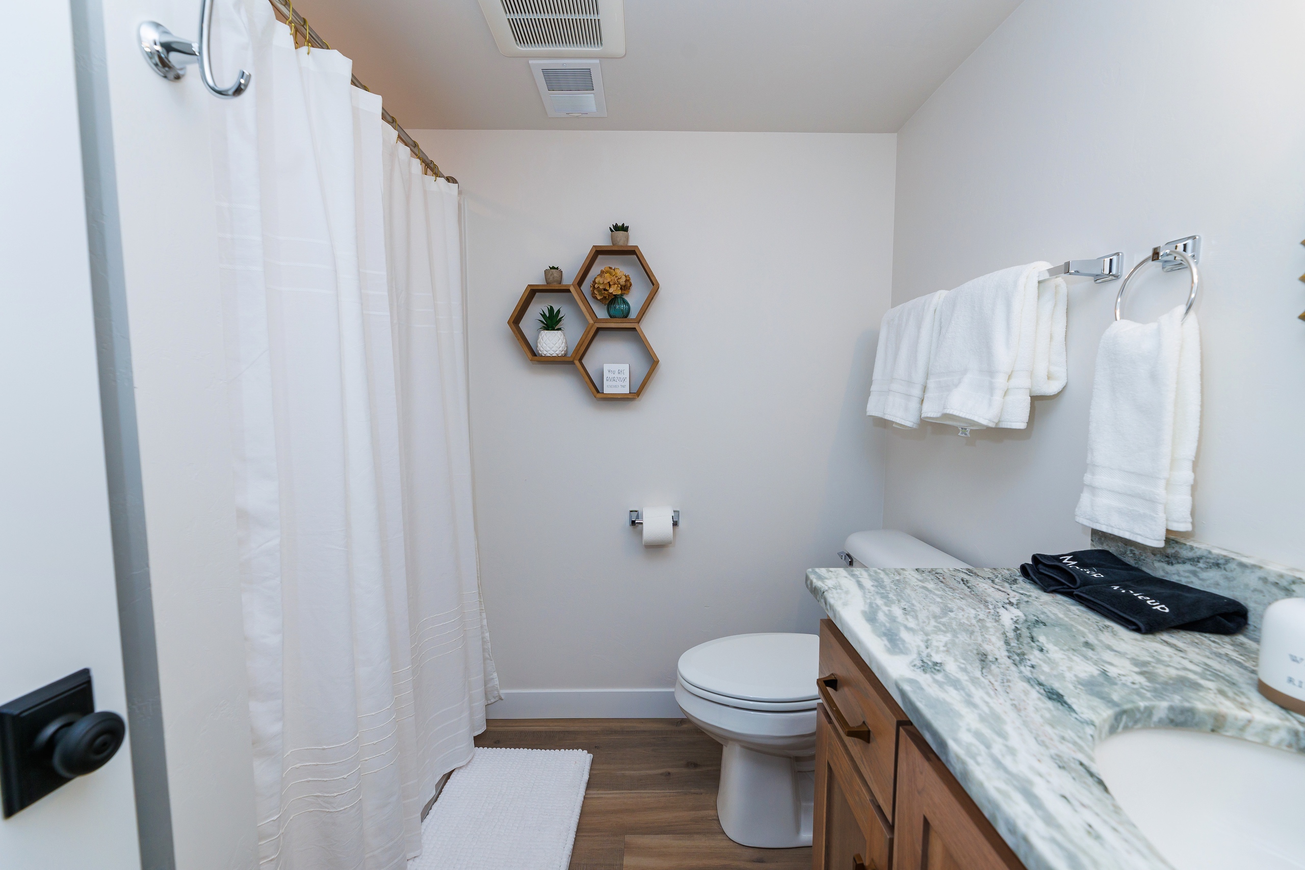 Bathroom 3 (main level): Full bathroom with tub shower combo, hair dryer