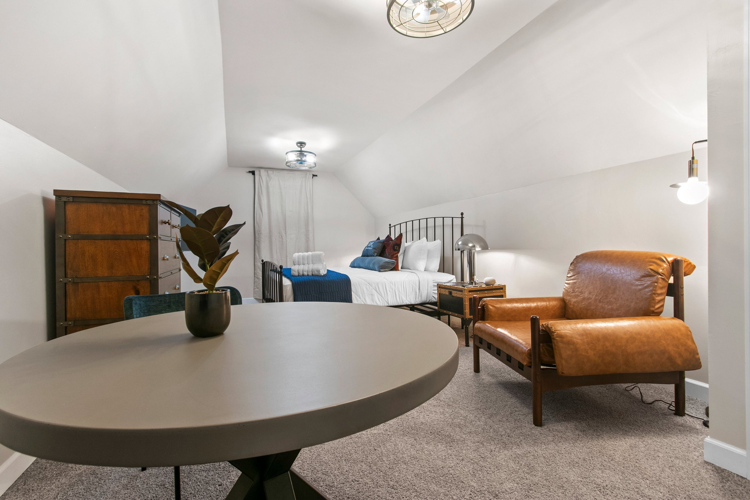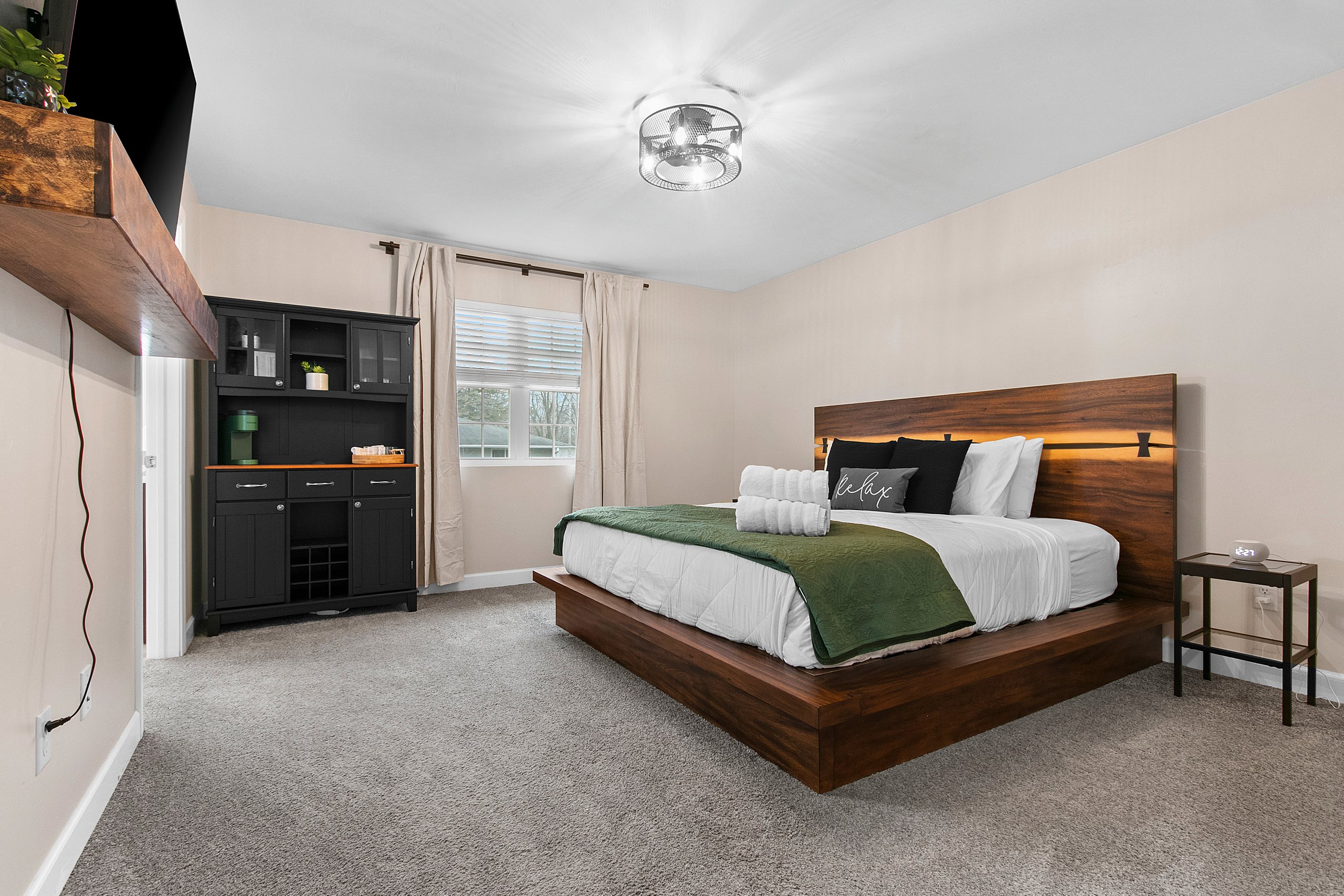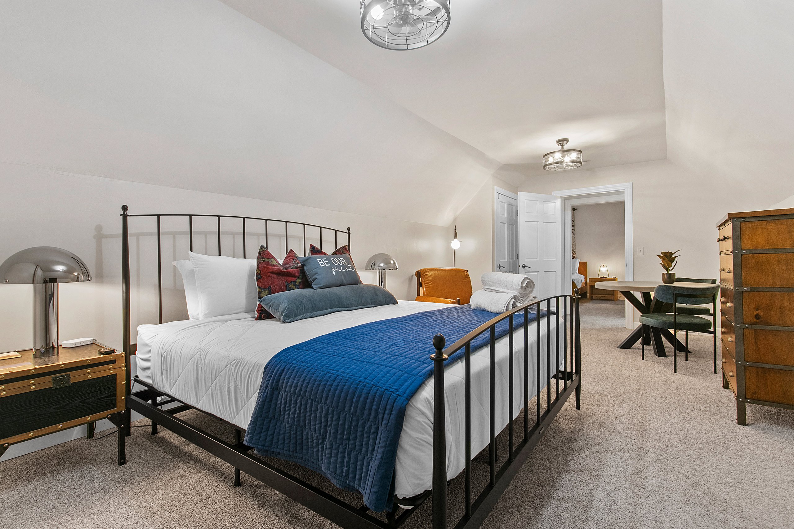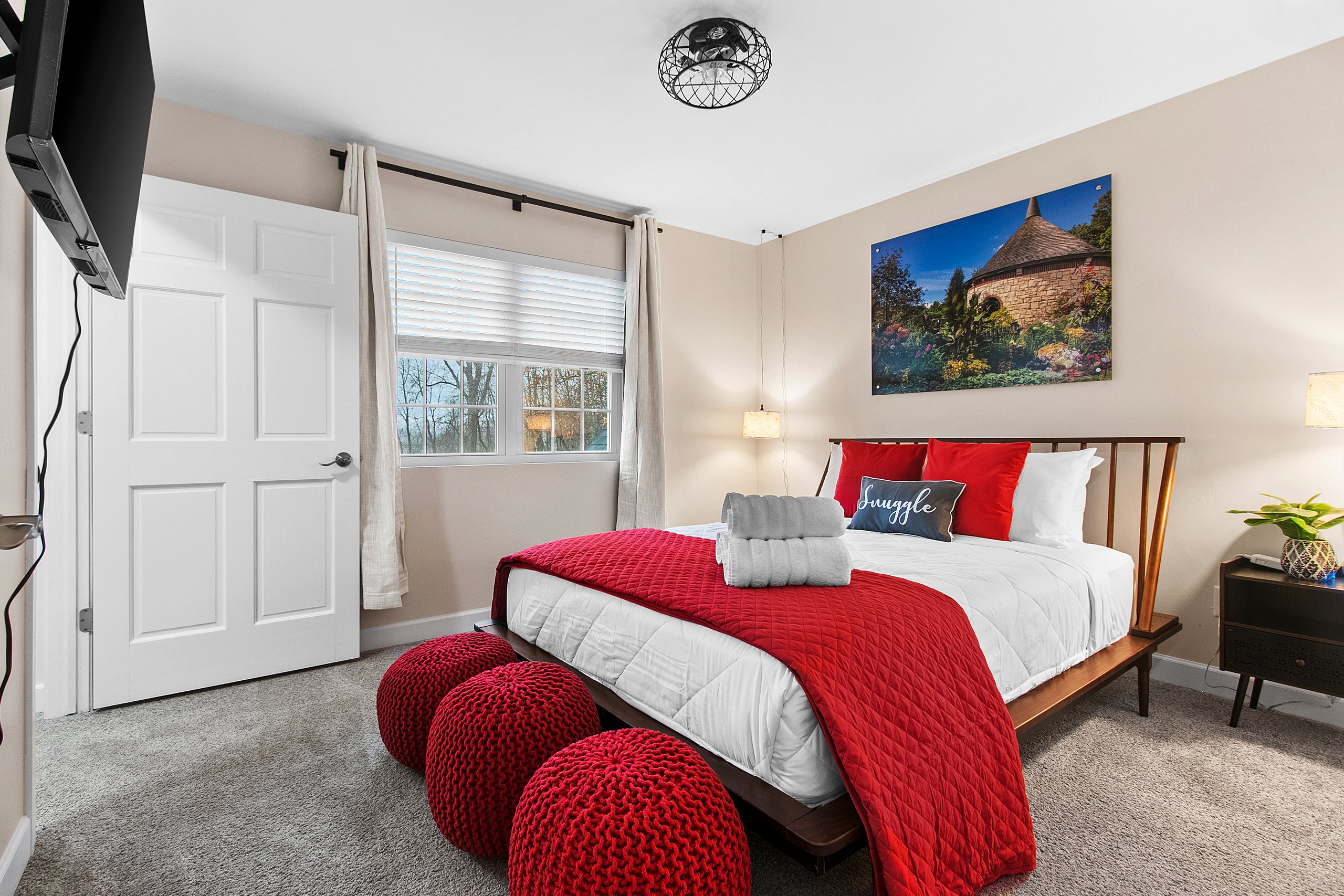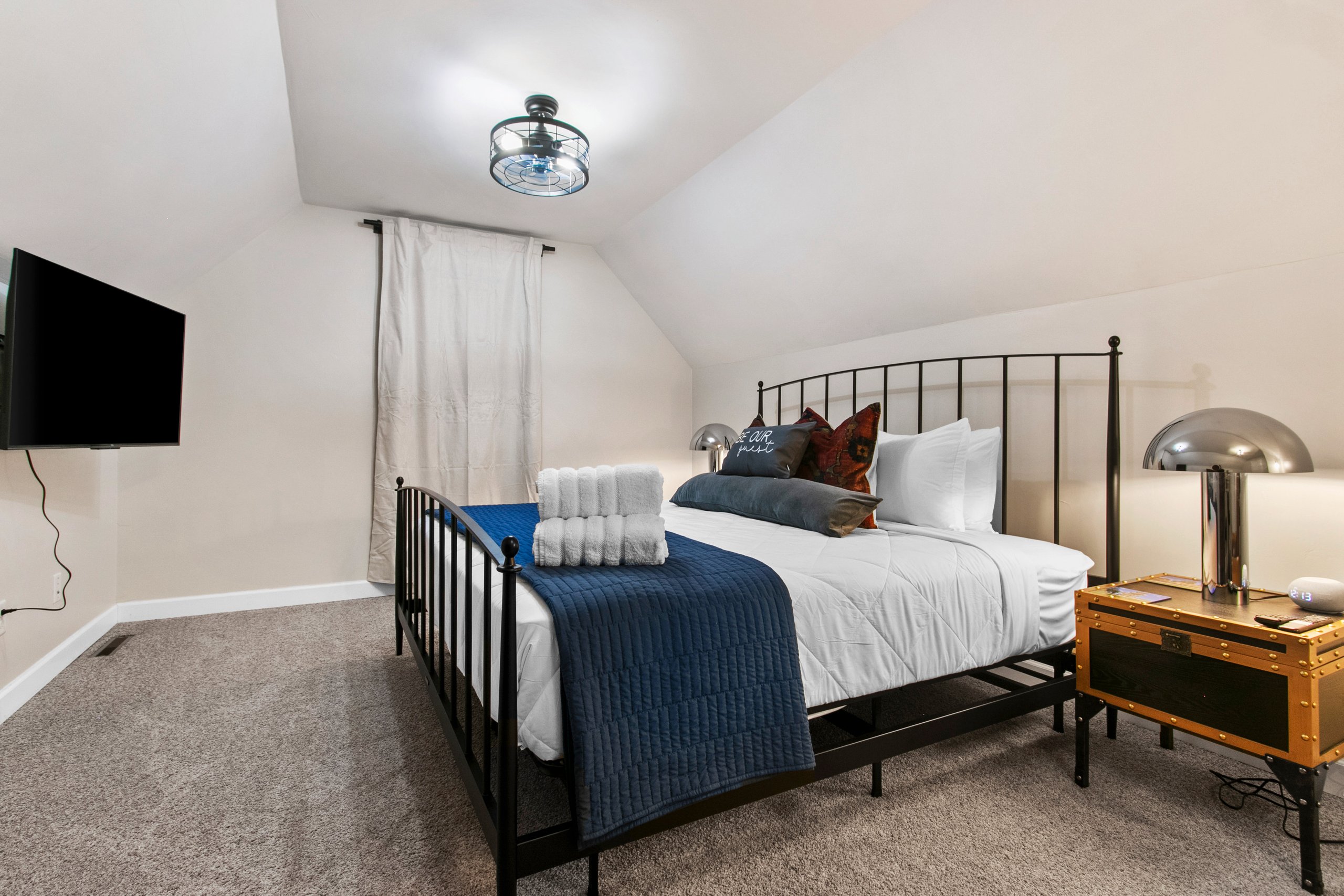 Bedroom 2 (second level): King size bed, TV, hangers, ceiling fan, extra pillows and blankets