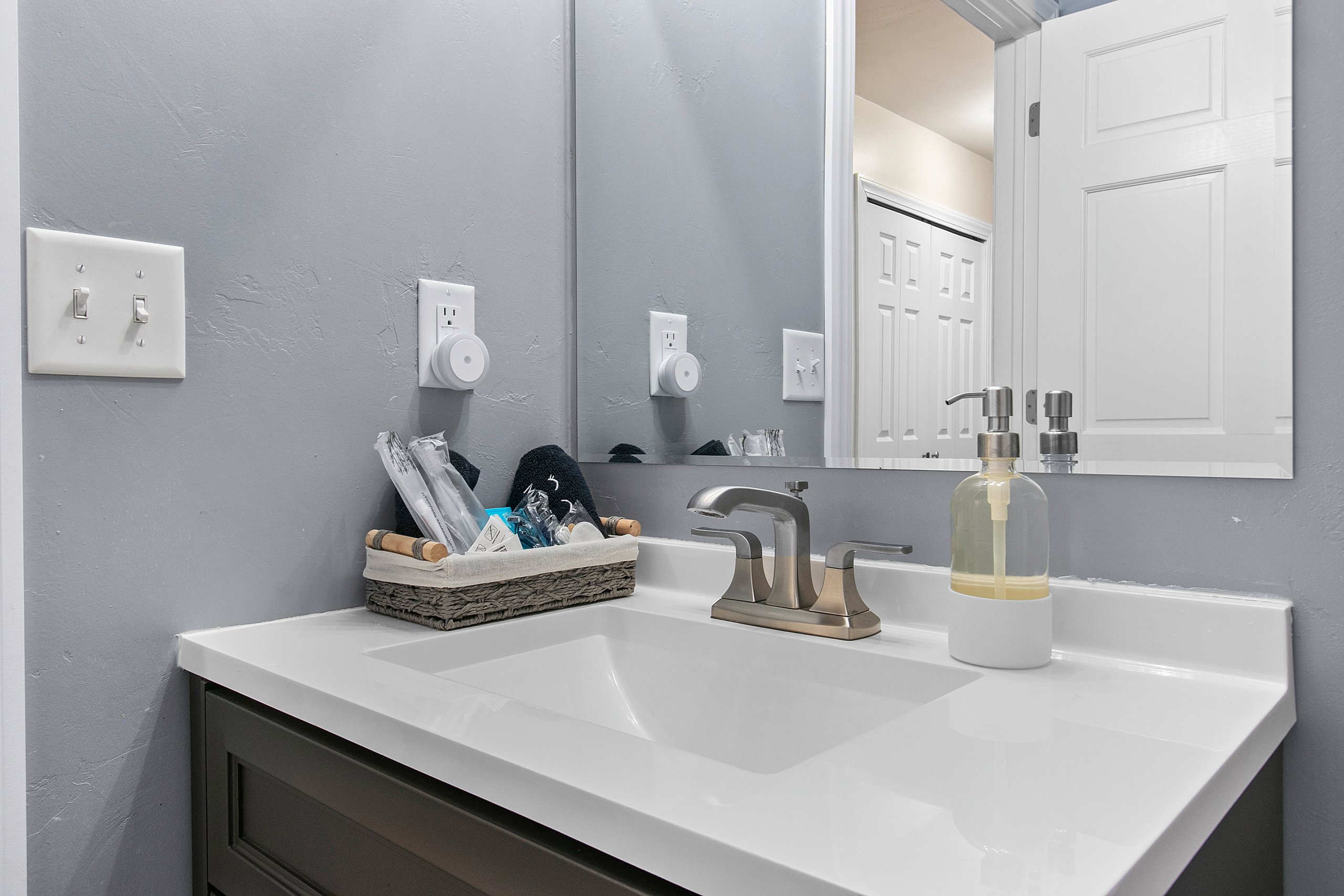 -A starter pack of essentials which includes toilet paper, paper towel, dish soap, dishwasher soap, hand soap, and garbage bags. Due to septic systems, we do not provide facial tissue. One each of travel size shampoo, conditioner, and body wash per full bathroom.