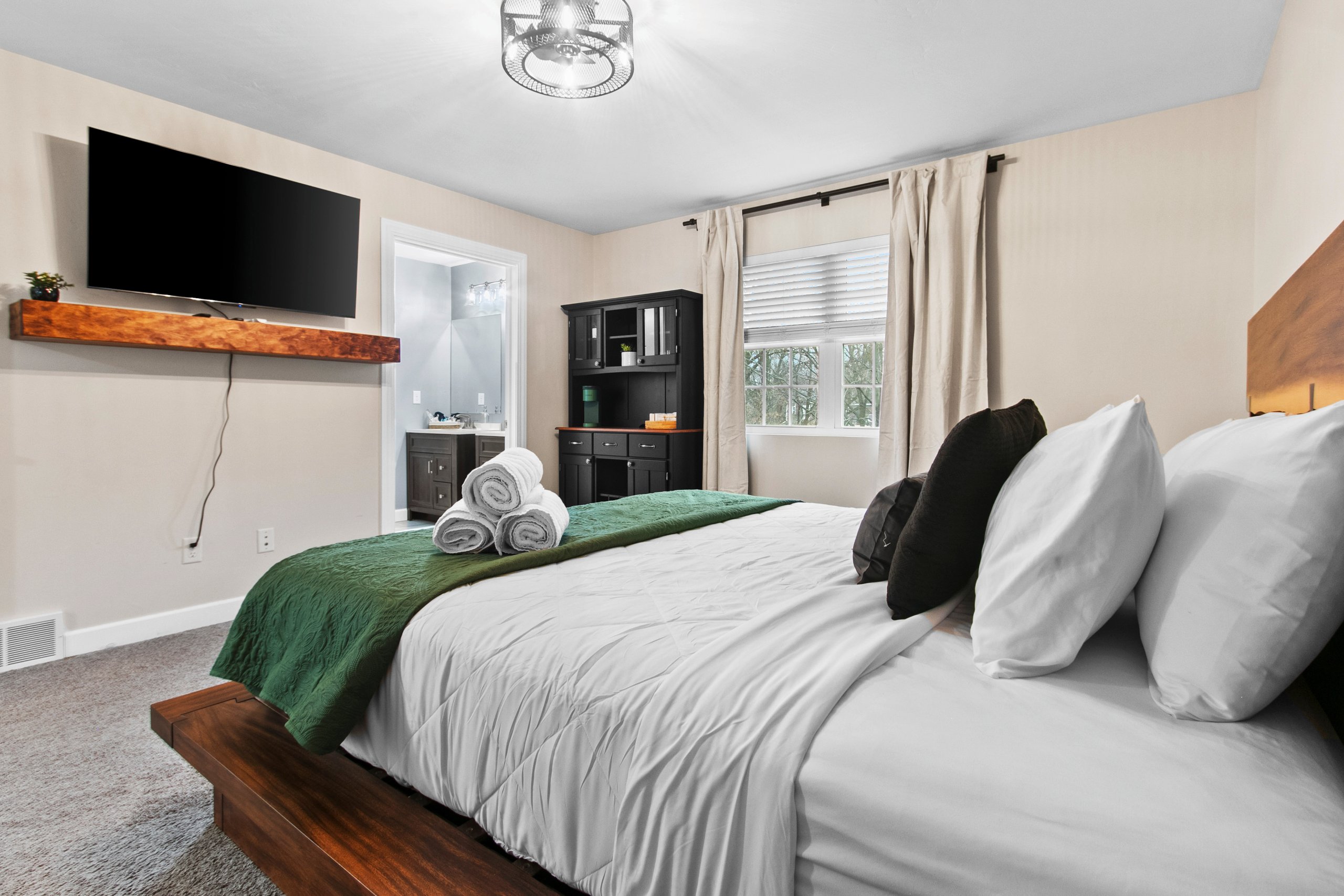 Bedroom 1 (second level): King size bed, TV, hangers, ceiling fan, extra pillows and blankets