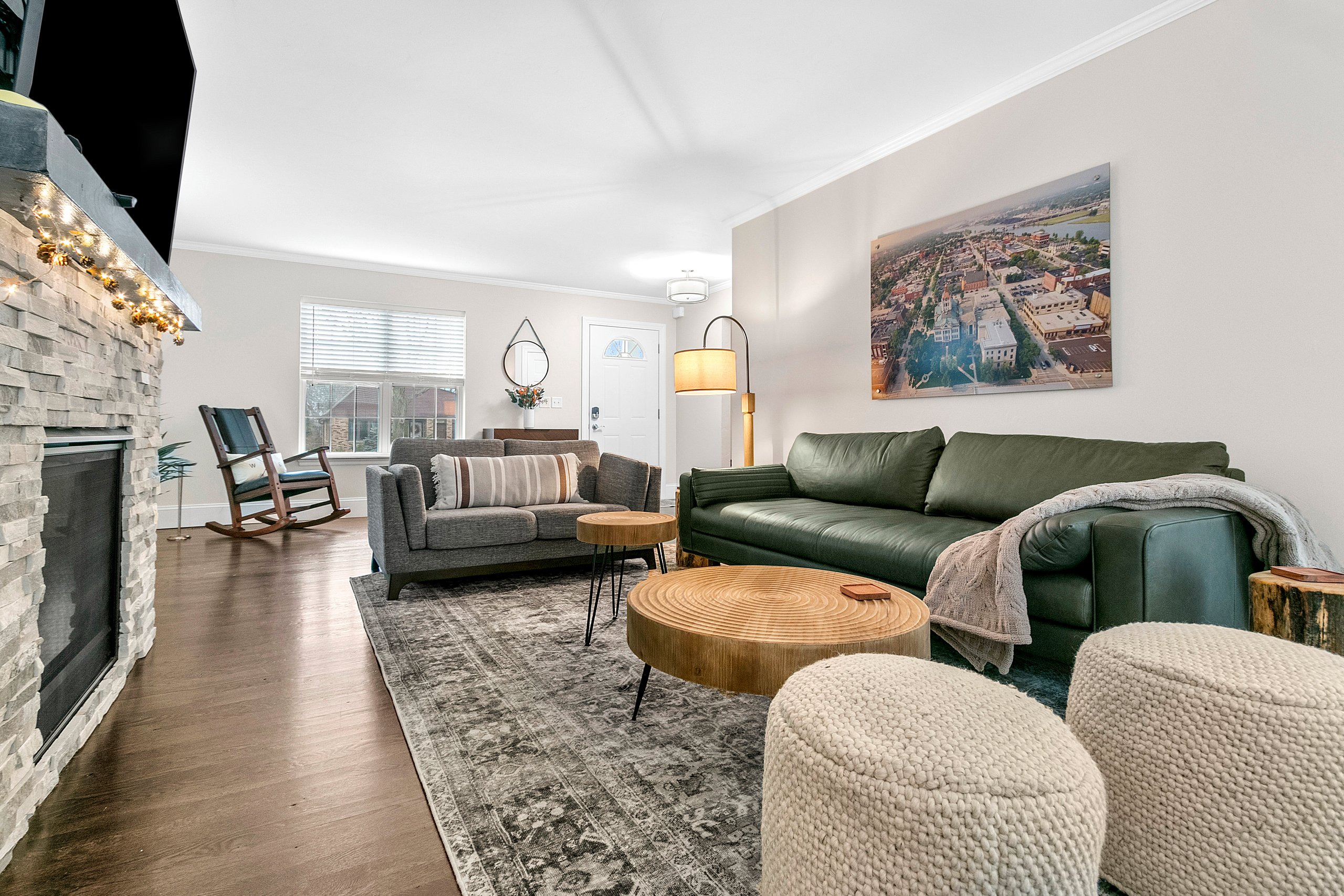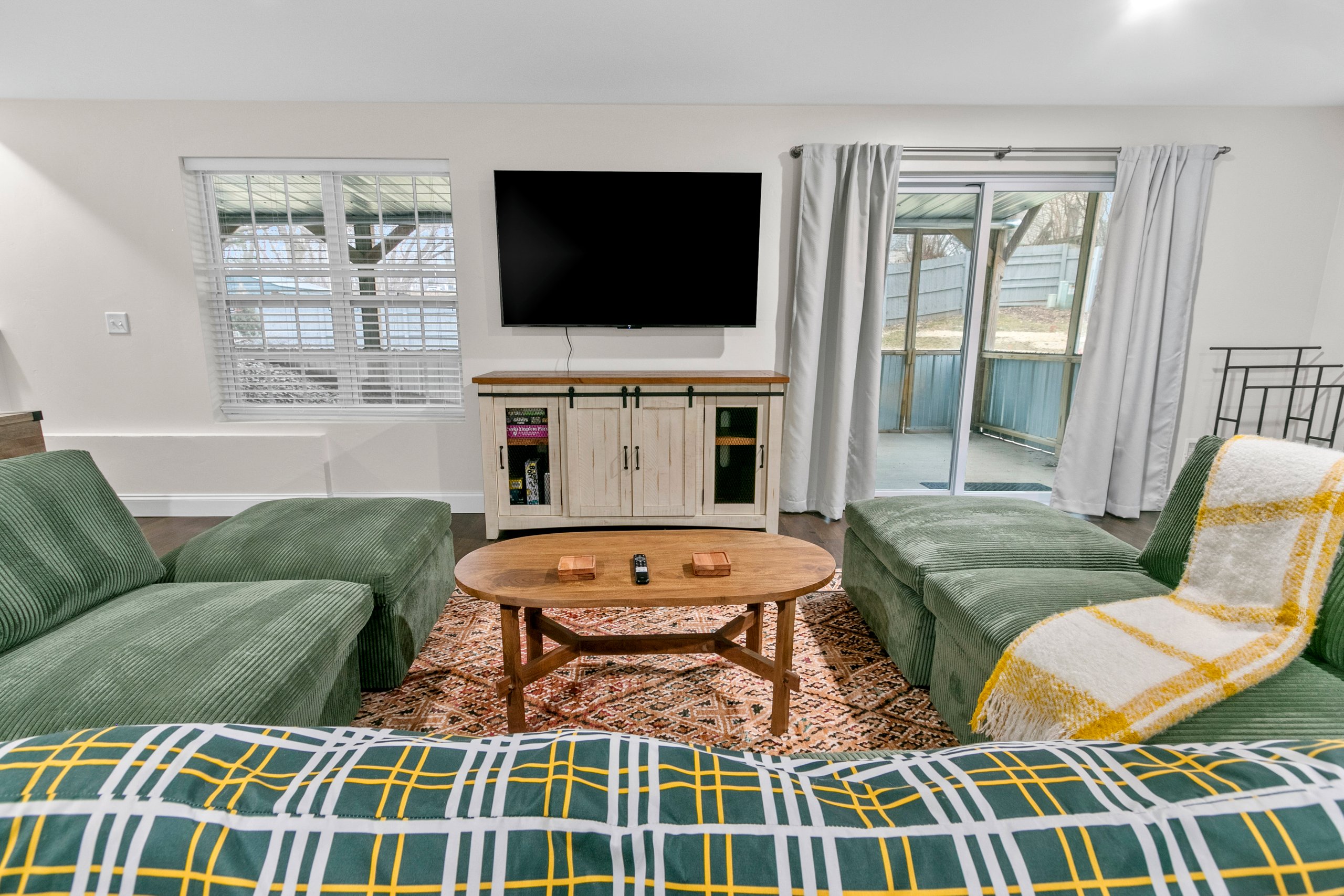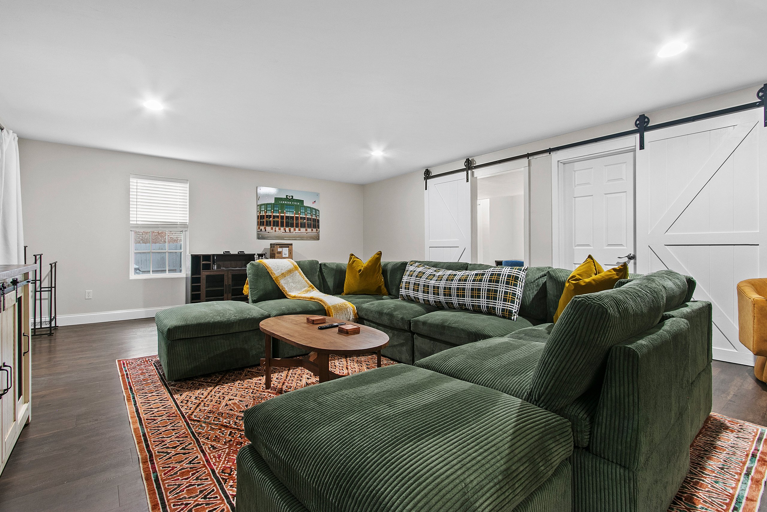 Situated just a 10-minute drive from Lambeau Field. This home is designed for comfort, accommodating up to 14 guests, making it ideal for families or groups of football fans. You’ll love the fully equipped, modern kitchen, featuring granite countertops and stainless-steel appliances—perfect for preparing meals. Relax in the spacious main floor living room or head to the basement where you’ll find a second living room with pull-out couch, a workroom/ playroom and even a air hockey table!