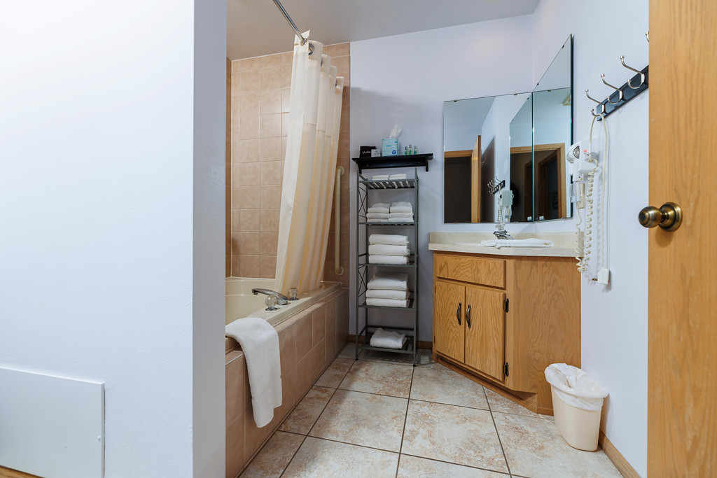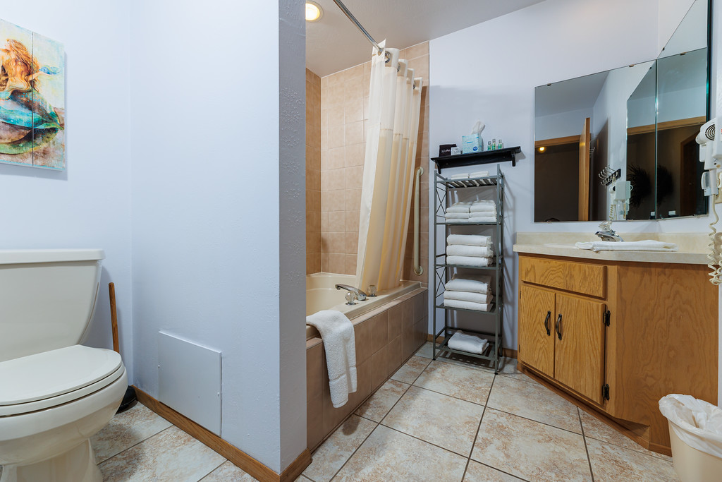 Bathroom 2 (upper level): Full bathroom w/ tub shower combo, hair dryer