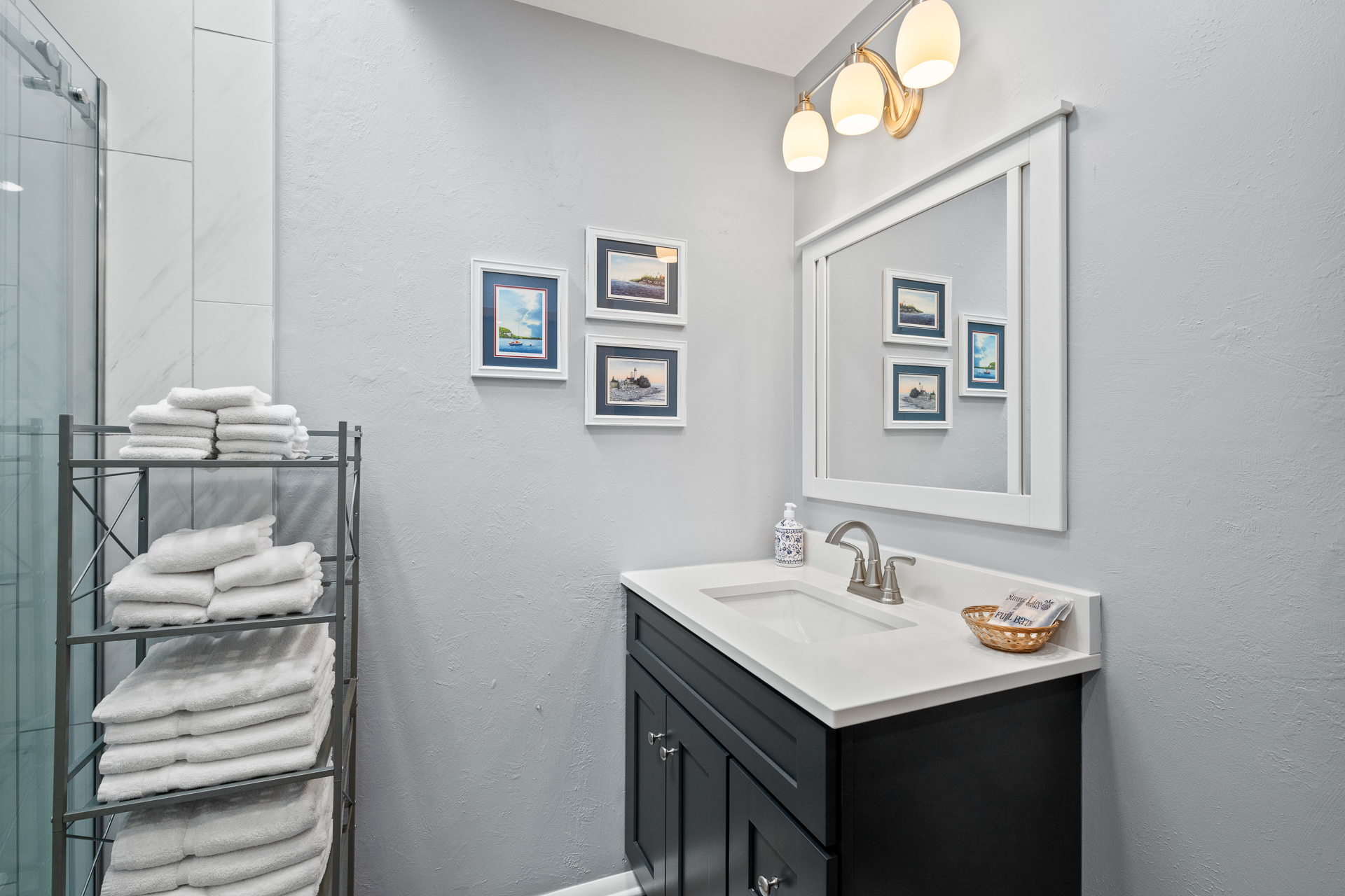 -A starter pack of essentials which includes toilet paper, paper towel, dish soap, dishwasher soap, hand soap, and garbage bags. Due to septic systems, we do not provide facial tissue. One each of travel size shampoo, conditioner, and body wash per full bathroom.