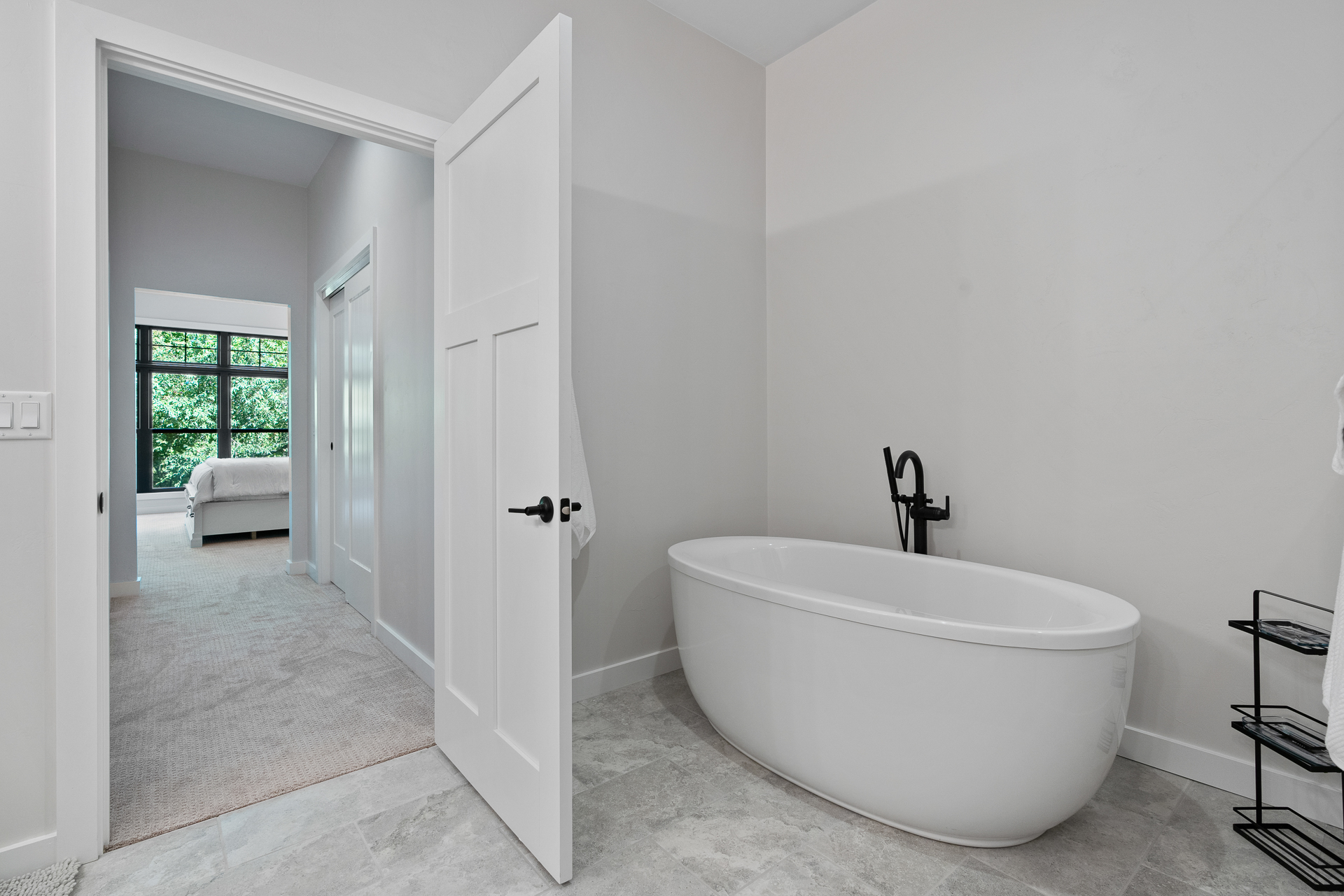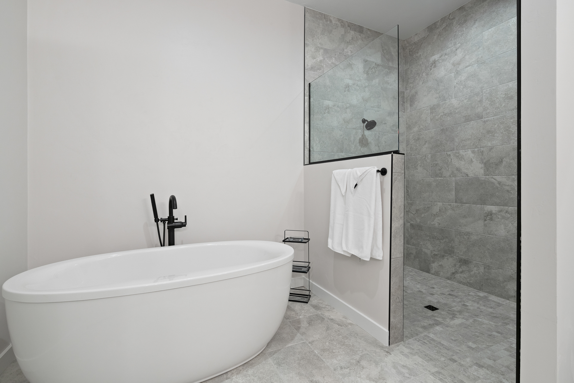Bathroom 1 (main level): Full bathroom with soaking tub, separate walk-in shower, two sinks, hair dryer. Ensuite to bedroom 1