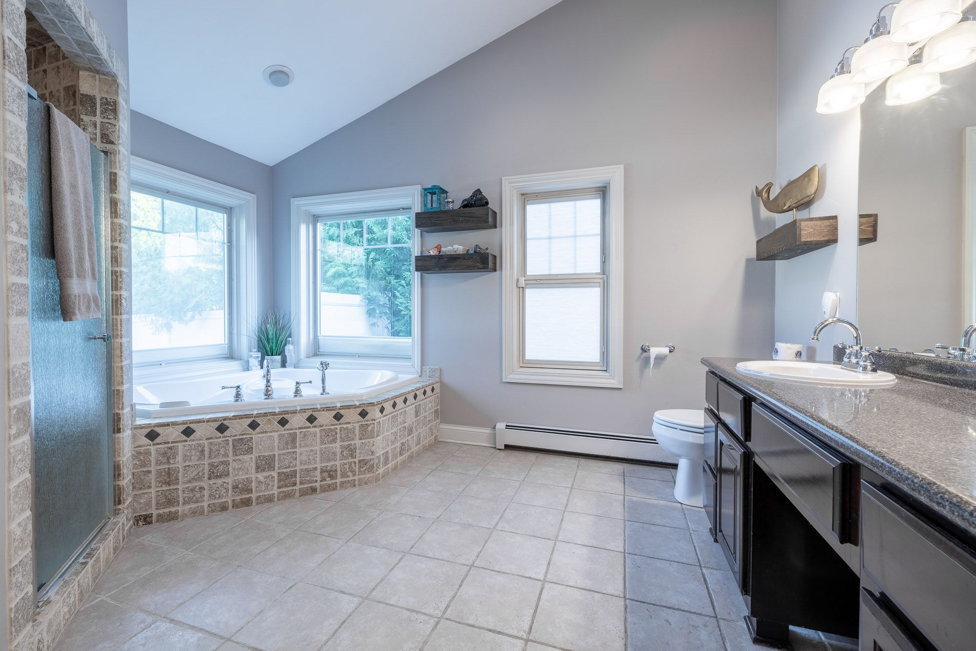 Bathroom 1 (main level): Full bathroom ensuite with jetted tub and separate walk-in shower