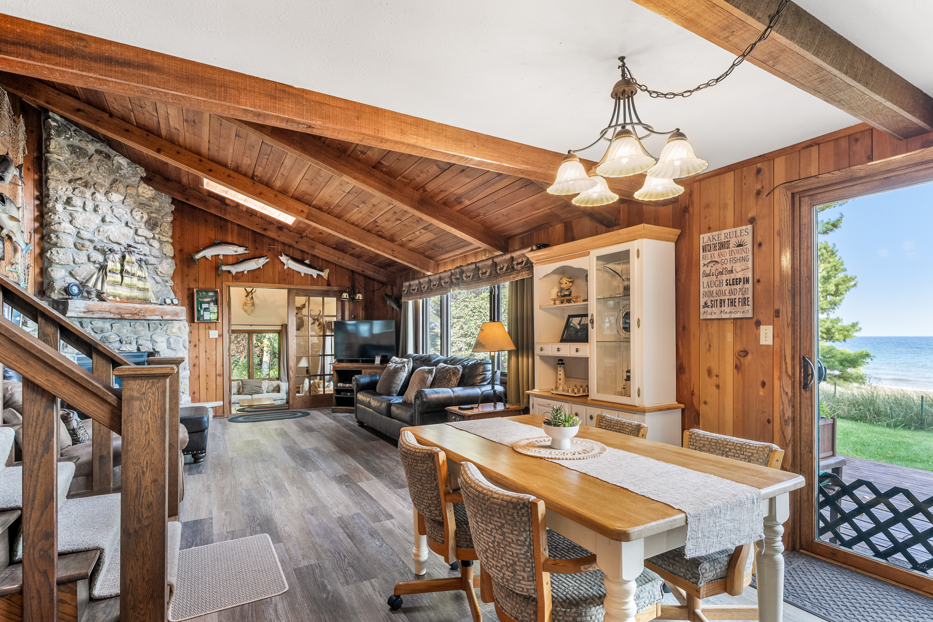 Welcome to Lily Bay Lodge, hosted by Simple Life Rentals! This 3-story home was built in 1988 and sits on a 2-acre wooded property with 200 feet of sandy Lake Michigan shoreline. It features 3 bedrooms, 3 bathrooms and overlooks Lake Michigan so you'll experience breathtaking views from almost every room in the house. It also has a screened in porch that faces south and offers bug-free dining and the sounds of the waves hitting the shore add to the experience. The outdoor brick paved patio is on the lakeside and also has a table and chairs for outdoor dining. There is also a firepit on the beach for evening campfires. This home is located a short 10-minute drive to downtown Sturgeon Bay and is about 3/4 mile to the Lily Bay boat launch.