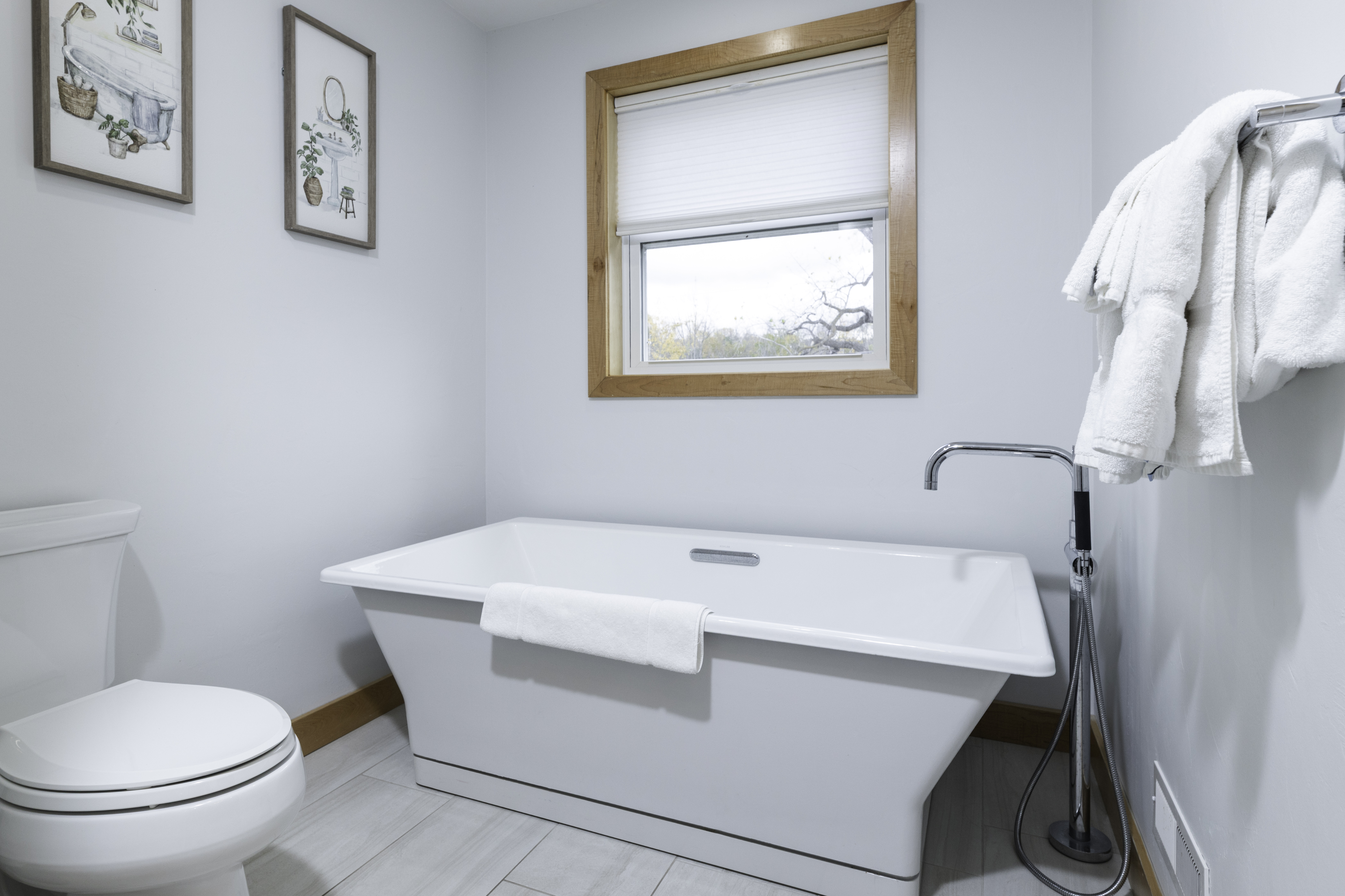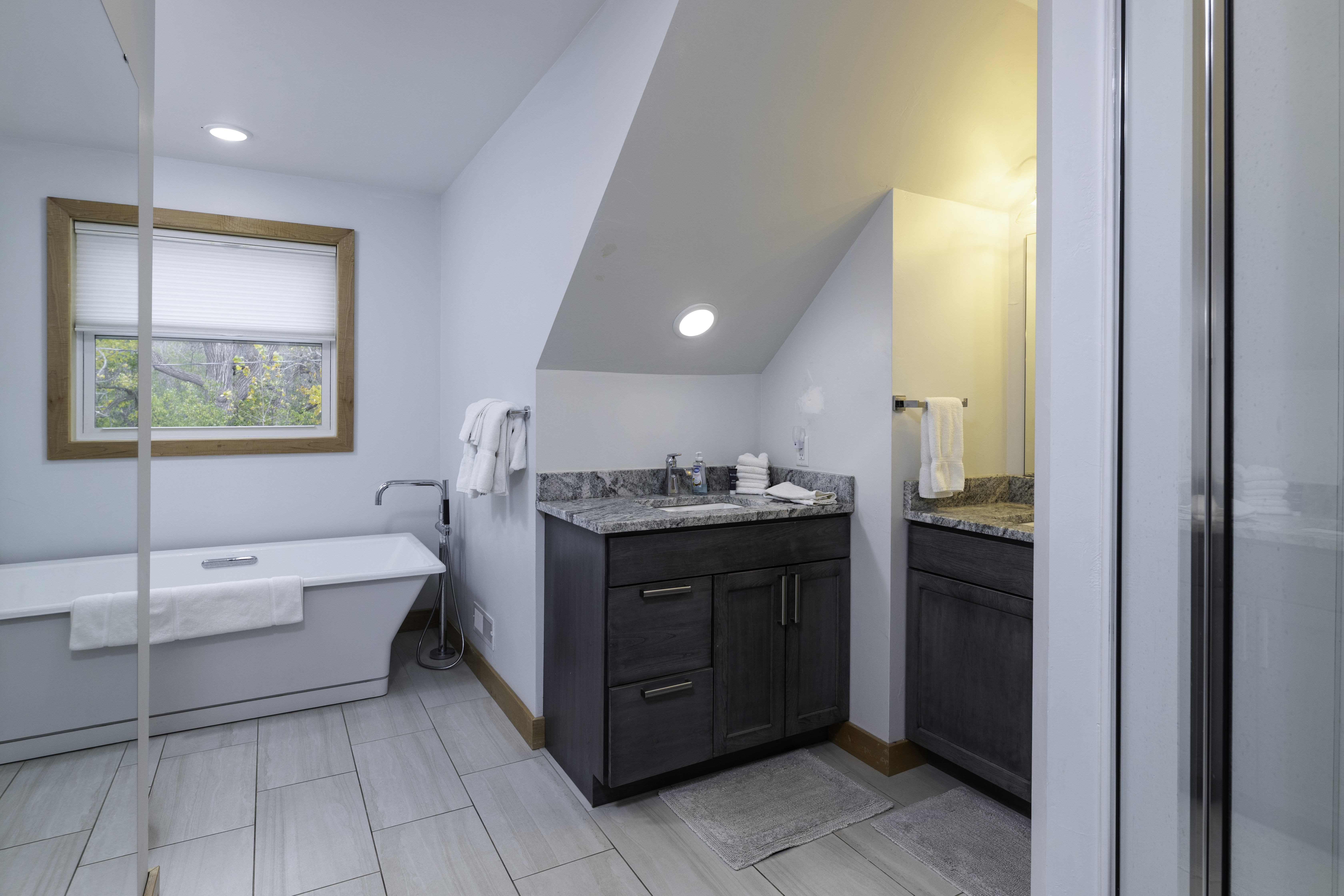 Bathroom 3 (upper level): Full bathroom with walk-in shower, separate deep soak tub, hair dryer