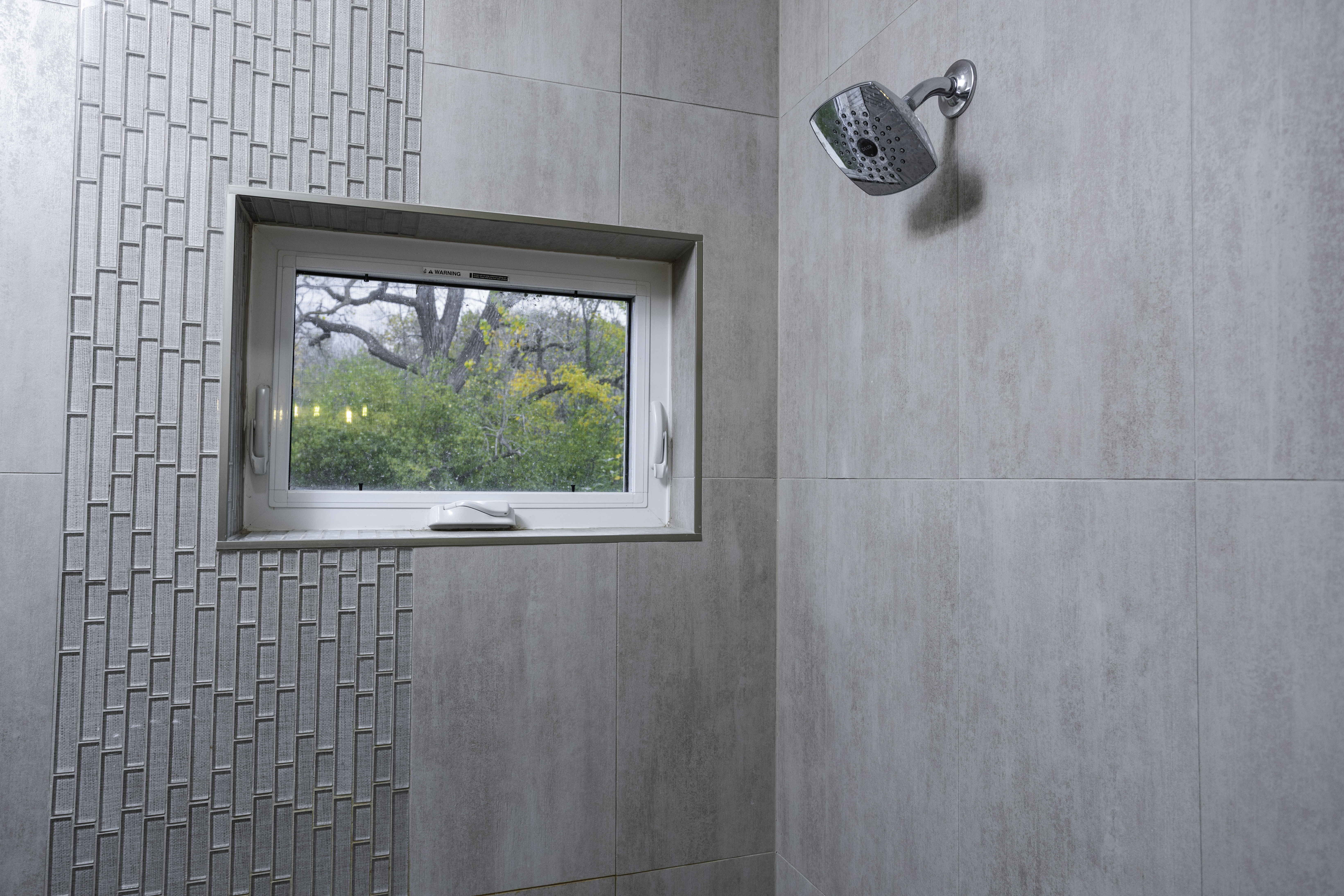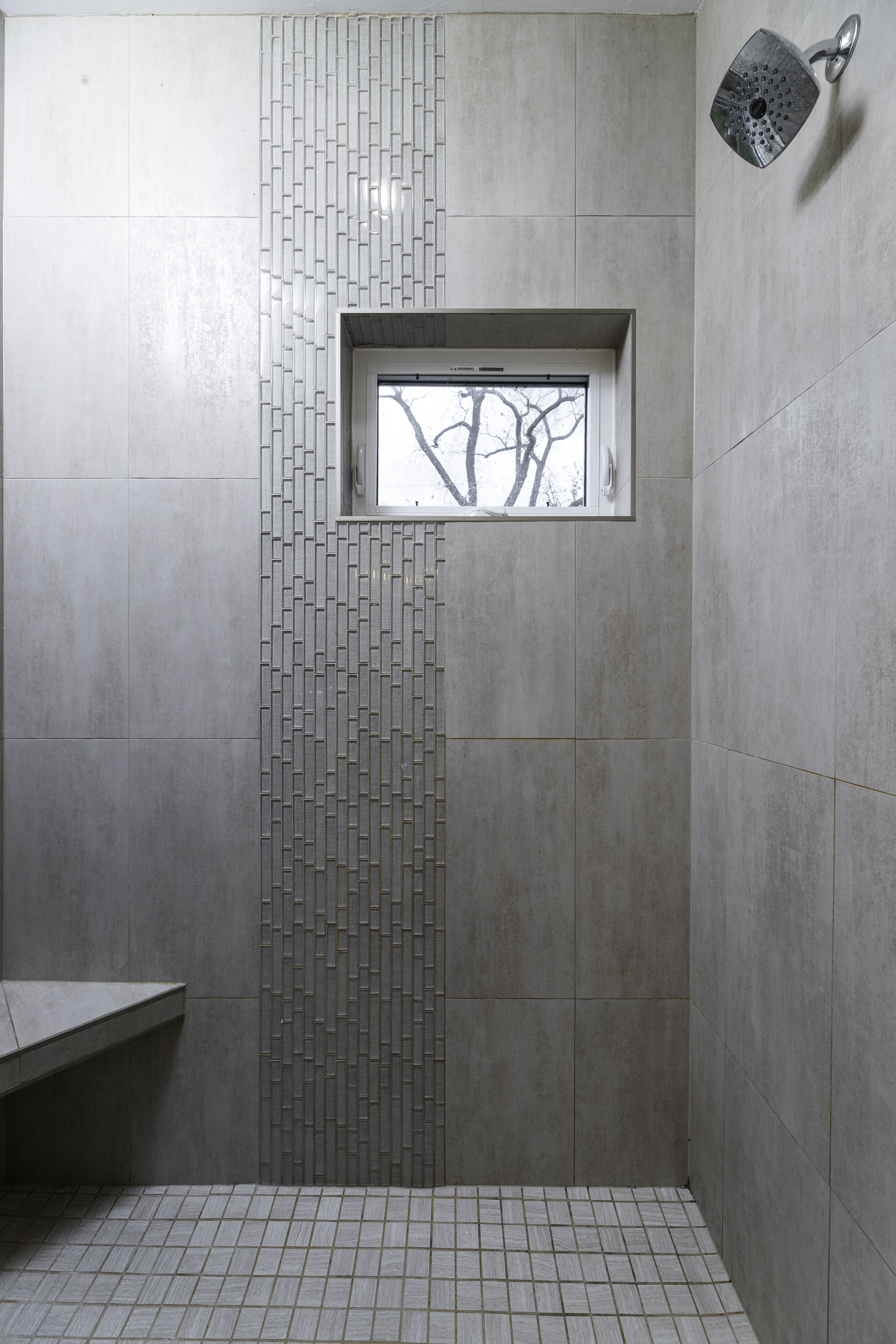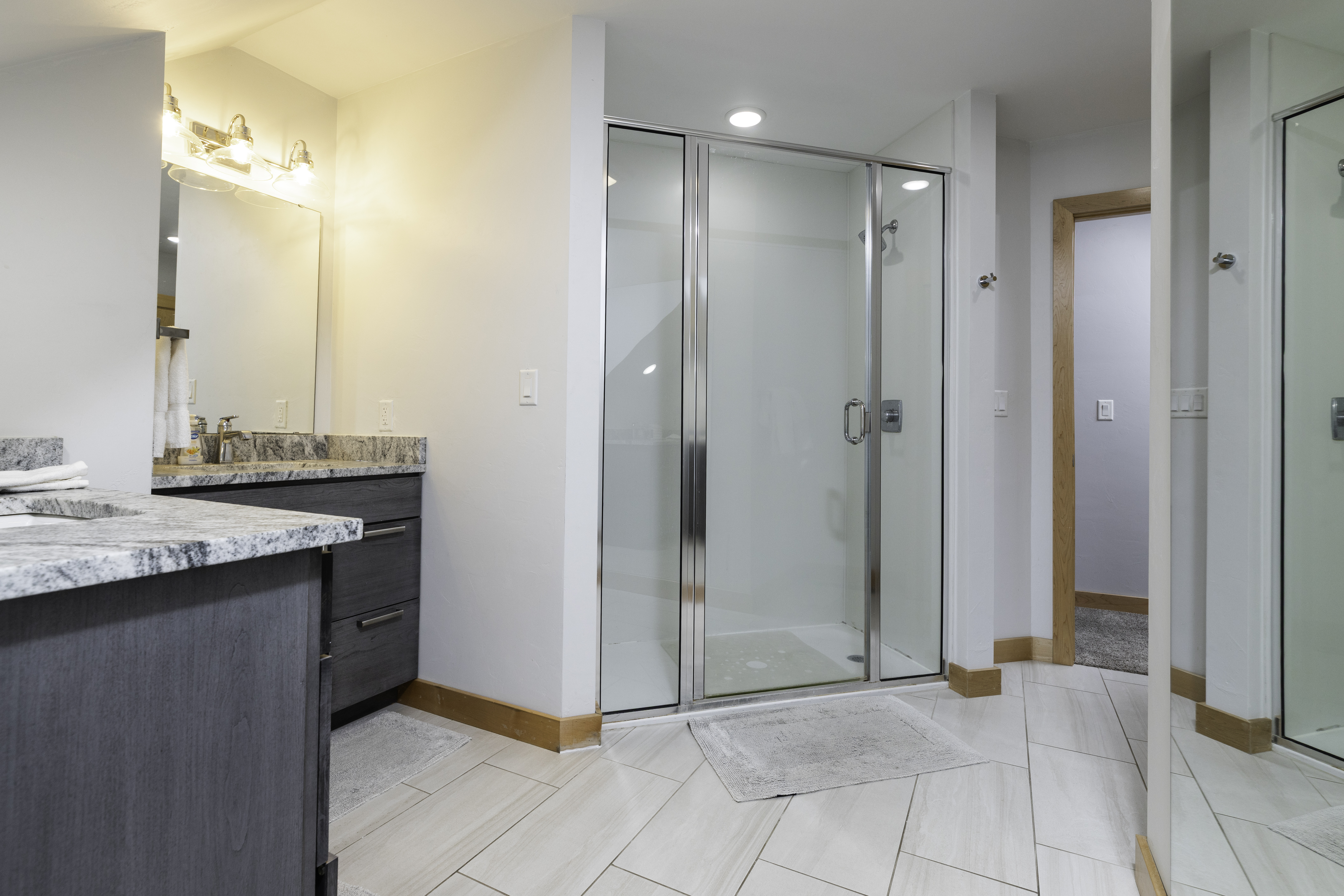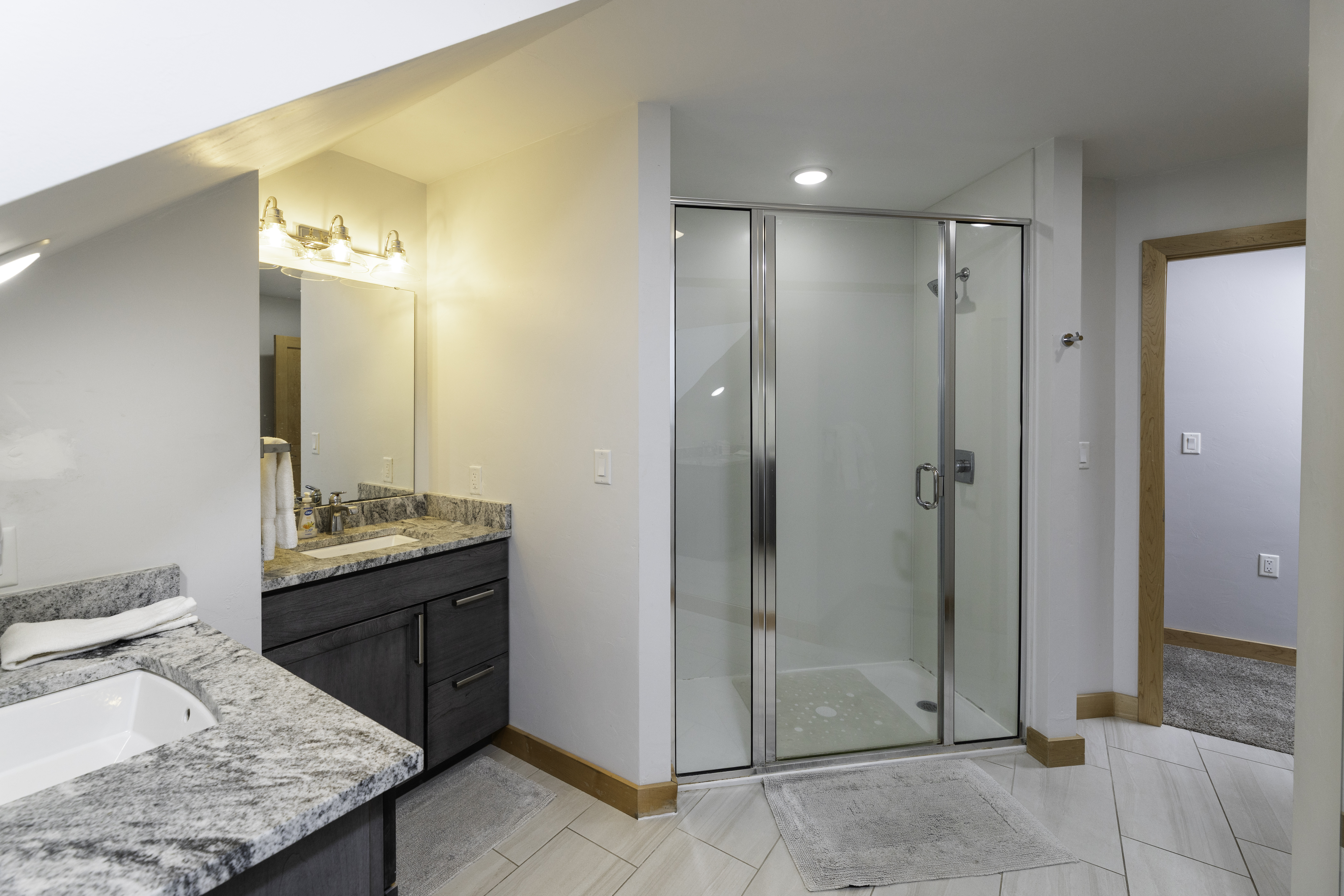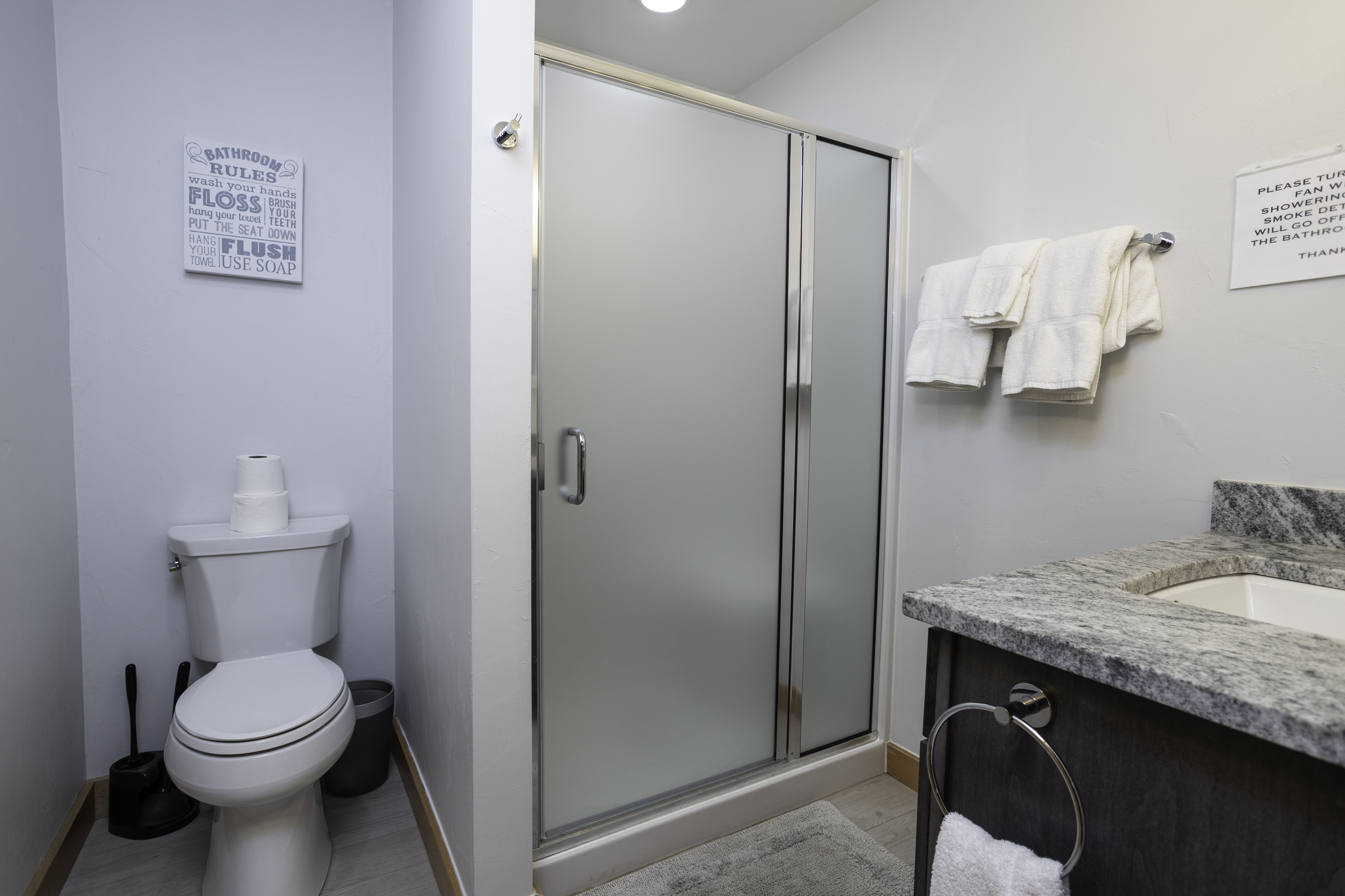 Bathroom 4 (lower level): Full bathroom with walk-in shower, hair dryer