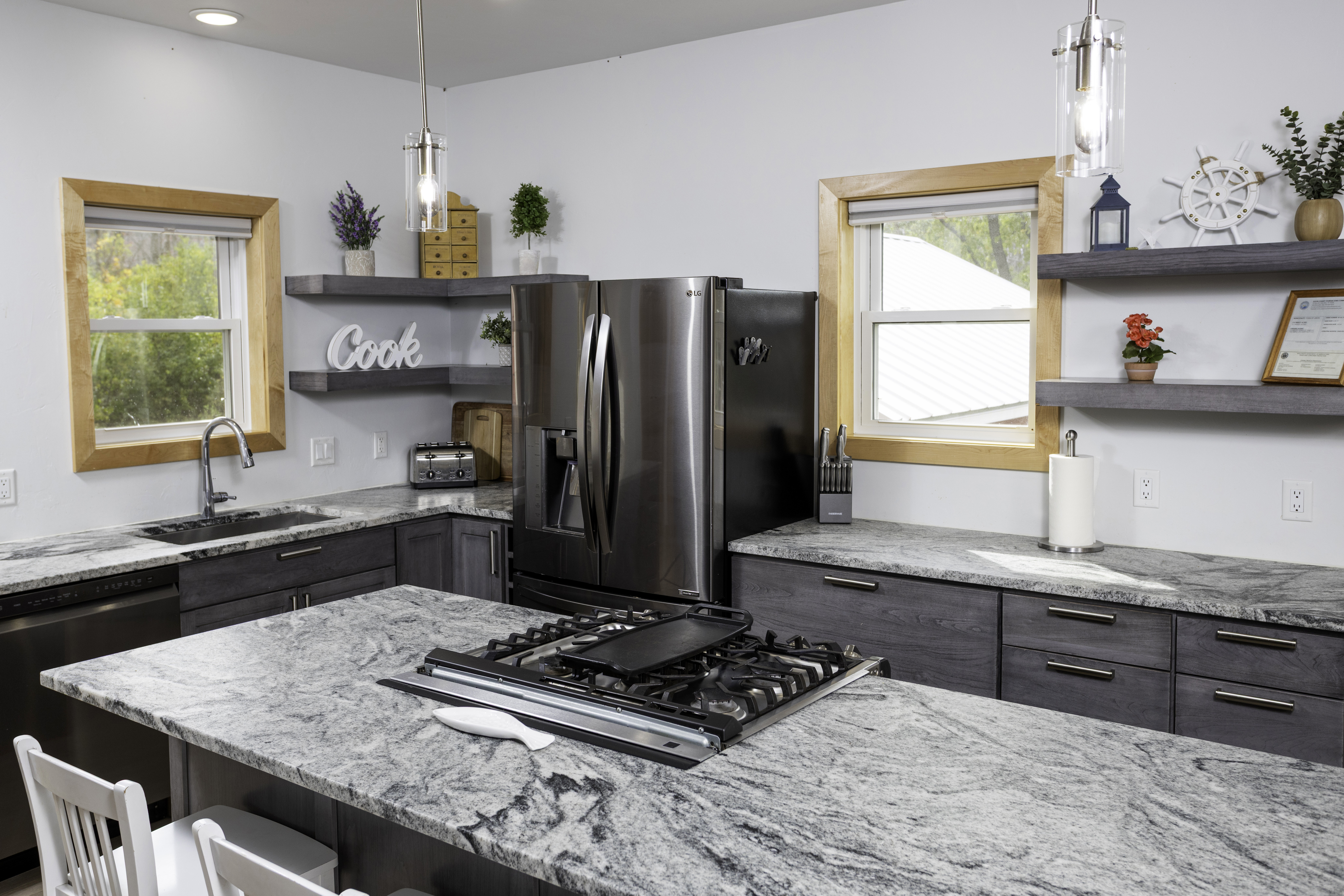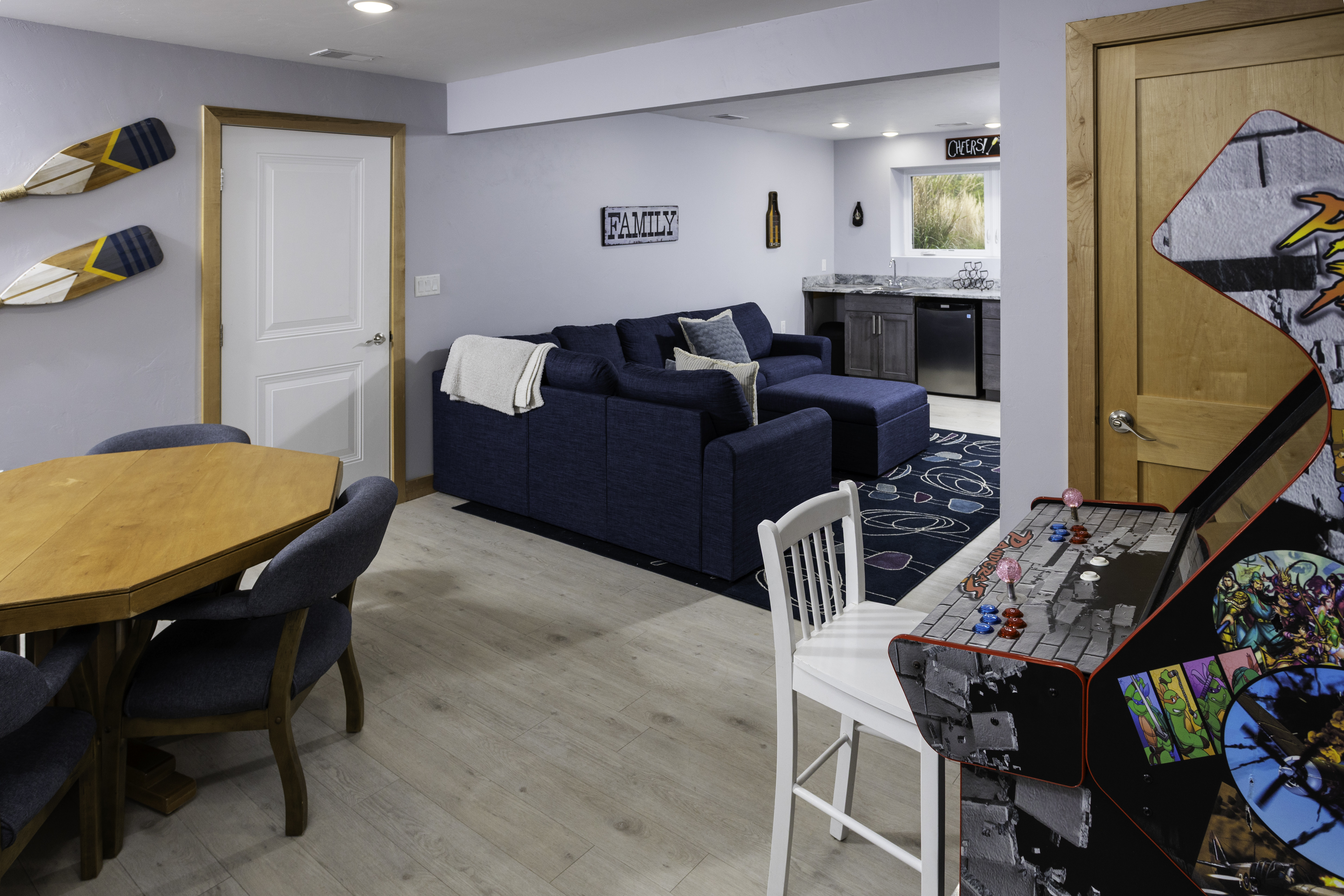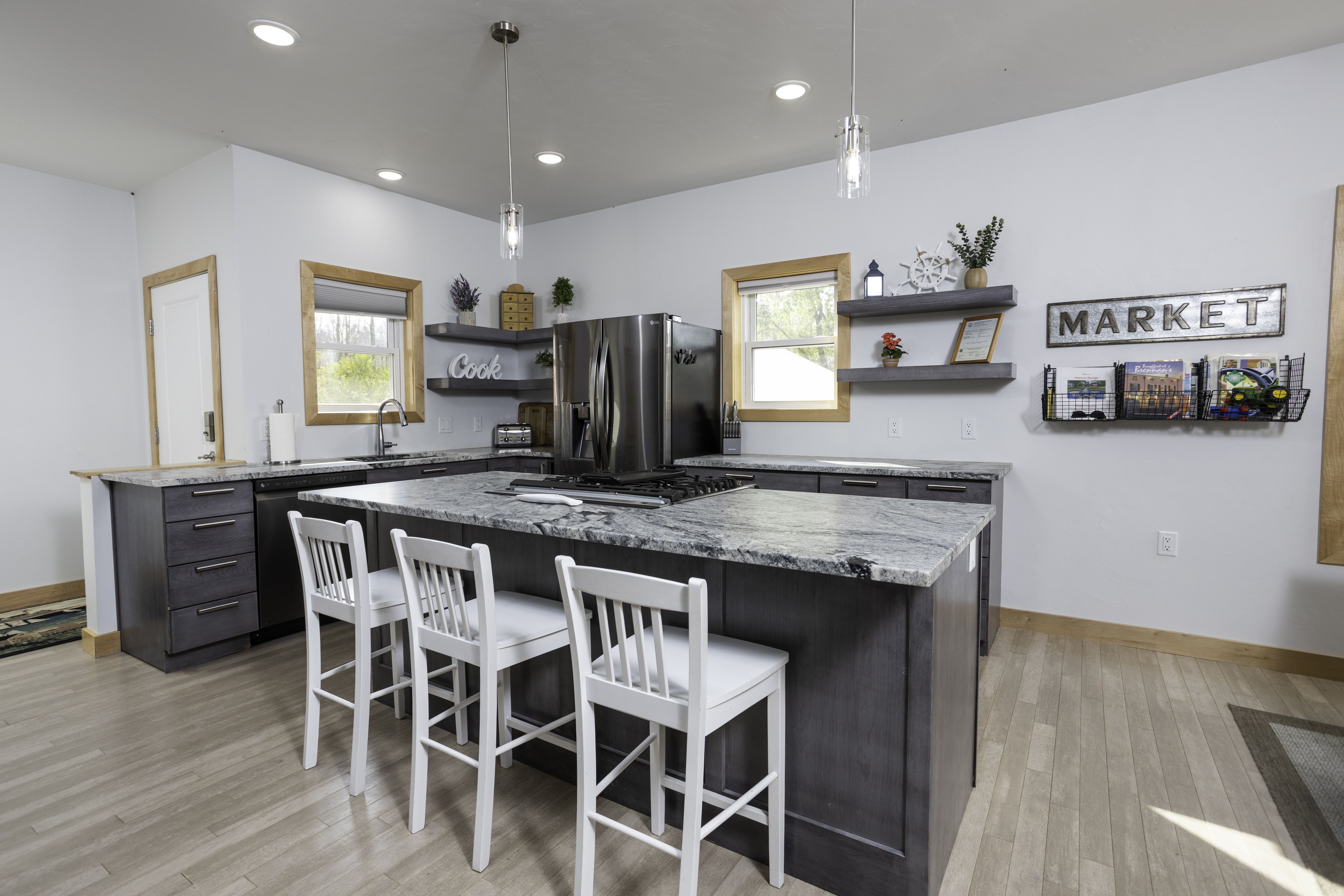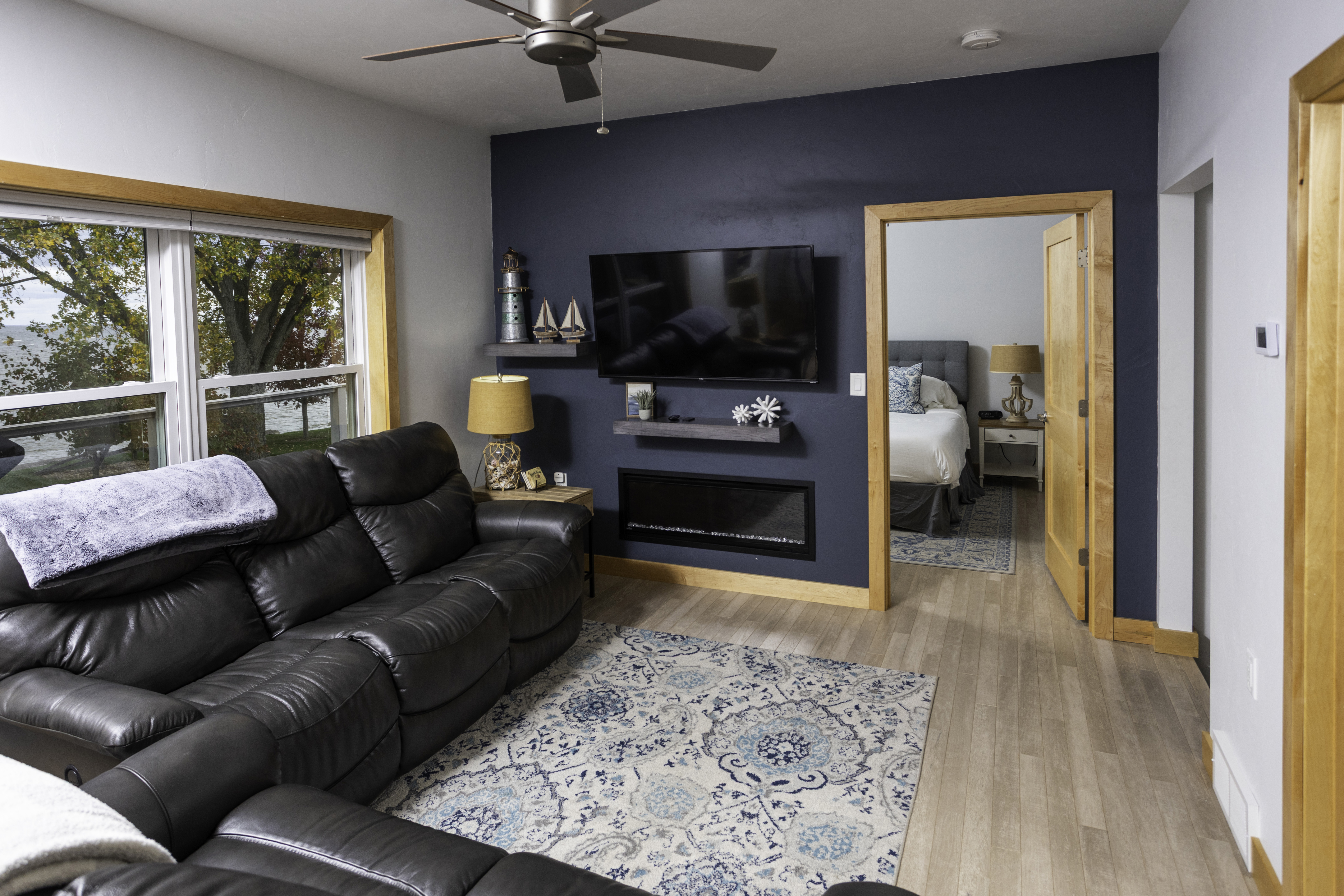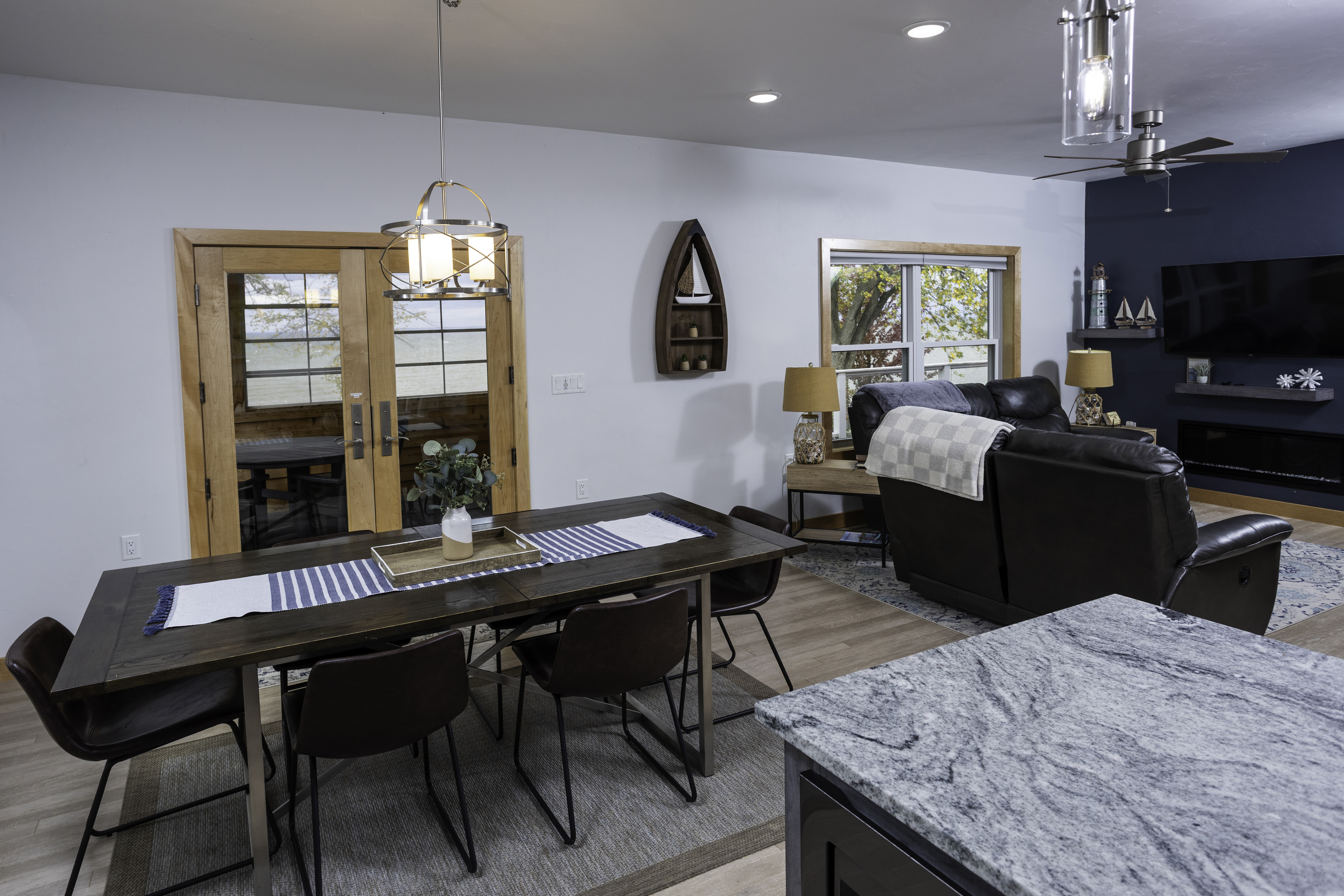 This home boasts 4 bedrooms and 3.5 baths. The main level is open concept living with kitchen, dining, and living room with an electric fireplace. The kitchen and dining area opens to a second story screened in porch and deck with propane grill. The main living space also has a half bath, laundry room, king bedroom with en-suite bathroom. Upstairs you will find bedroom two with a king bed, TV, and twin bunk bed. The kids’ room (bedroom 3) has twin bunk bed, a twin bed with trundle, and a double bed. The two upstairs bedrooms share a bathroom with deep soak tub, separate walk-in shower, toilet, and dual vanities. Downstairs you will find a family room with Smart TV, wet bar, poker table, and the final bedroom with a king bed, Smart TV as well as a full bath with a walk-in shower. The basement also has a walk out to the back yard for quick access to lake views.