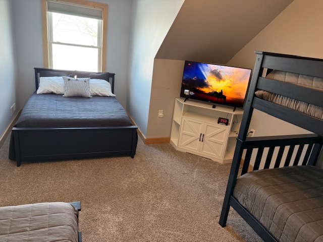Bedroom 2 (upper level): King size bed plus twin bunk beds (2 twin beds), Smart TV, ceiling fan