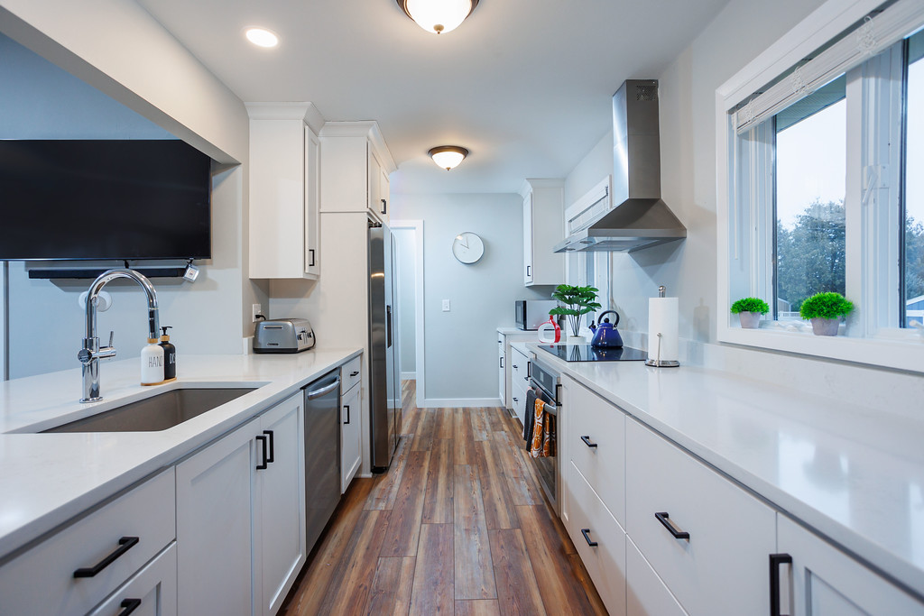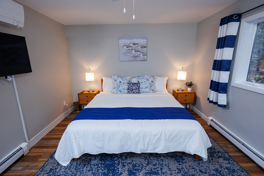 Marina Cottage is air conditioned in the main living space and two bedrooms, includes central heating throughout and a cozy gas fireplace in the living room. This home was fully renovated in 2022 with new kitchen, bathrooms, woodwork, furniture, appliances and technology. All living spaces include Samsung SmartTVs plus a soundbar in the main living space for cinema or music.