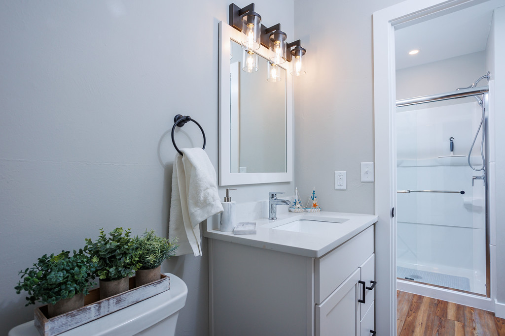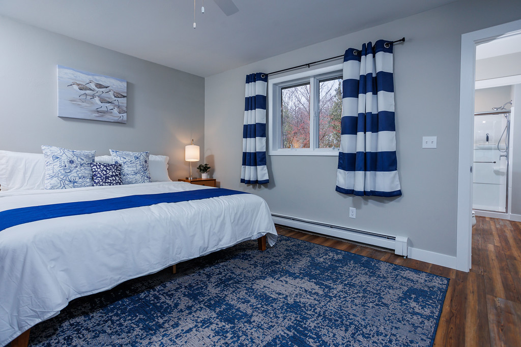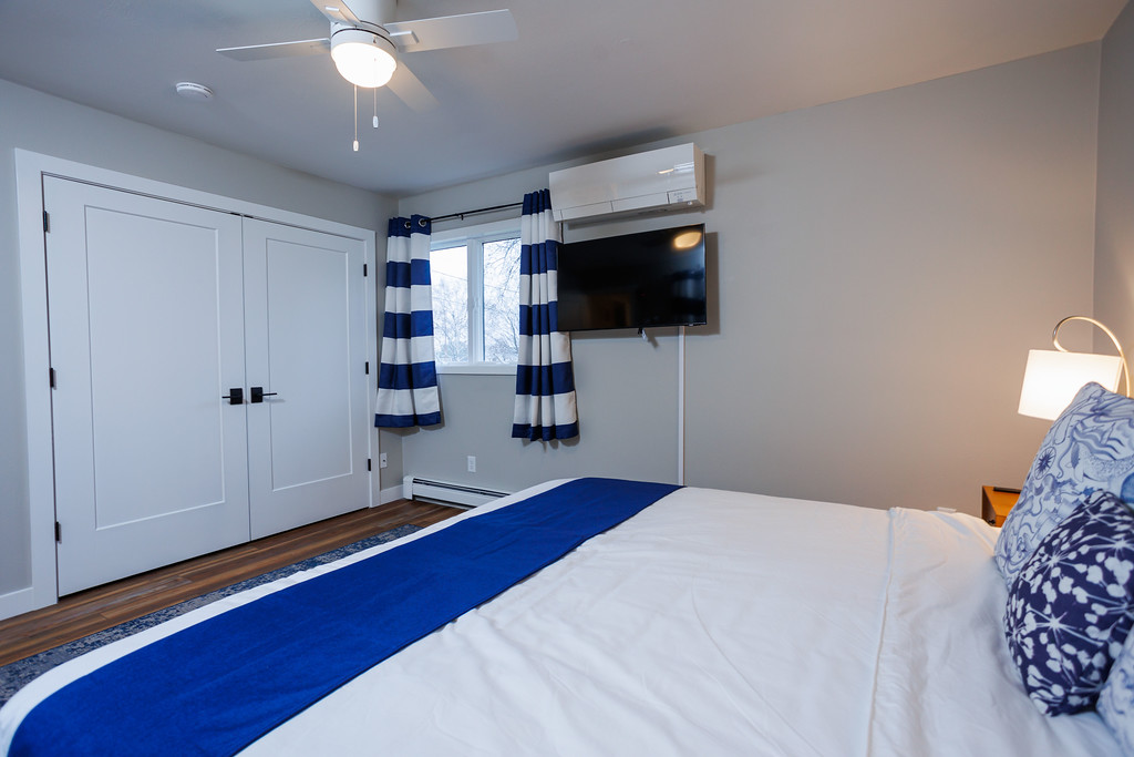 Bedroom 1: King bed, TV, ceiling fan, hangers, room darkening shades, extra pillows and blankets